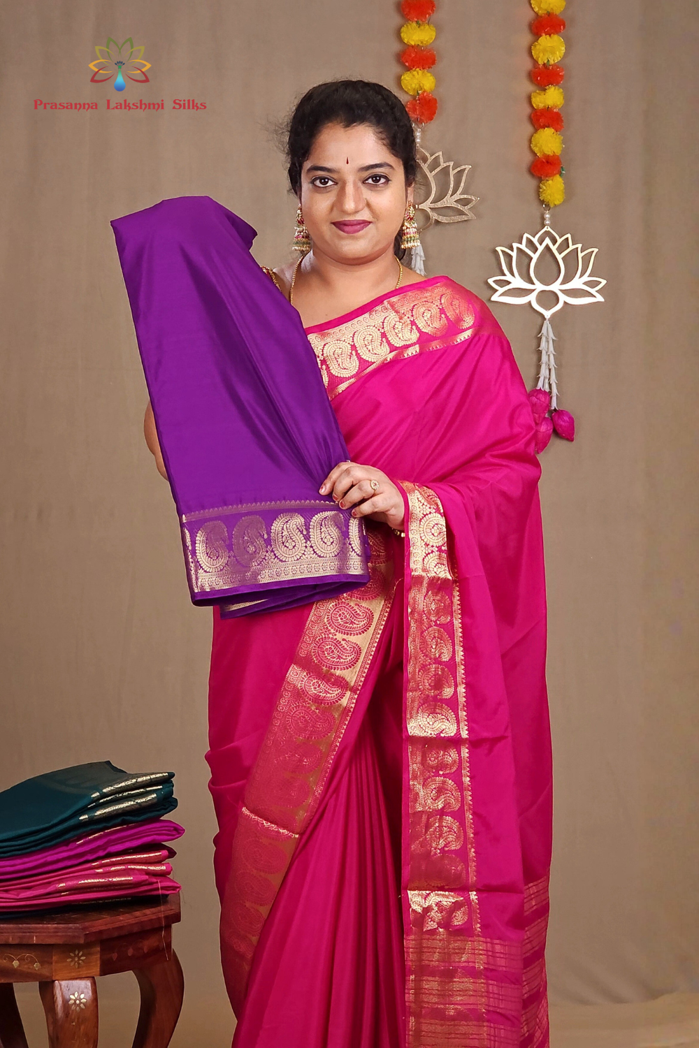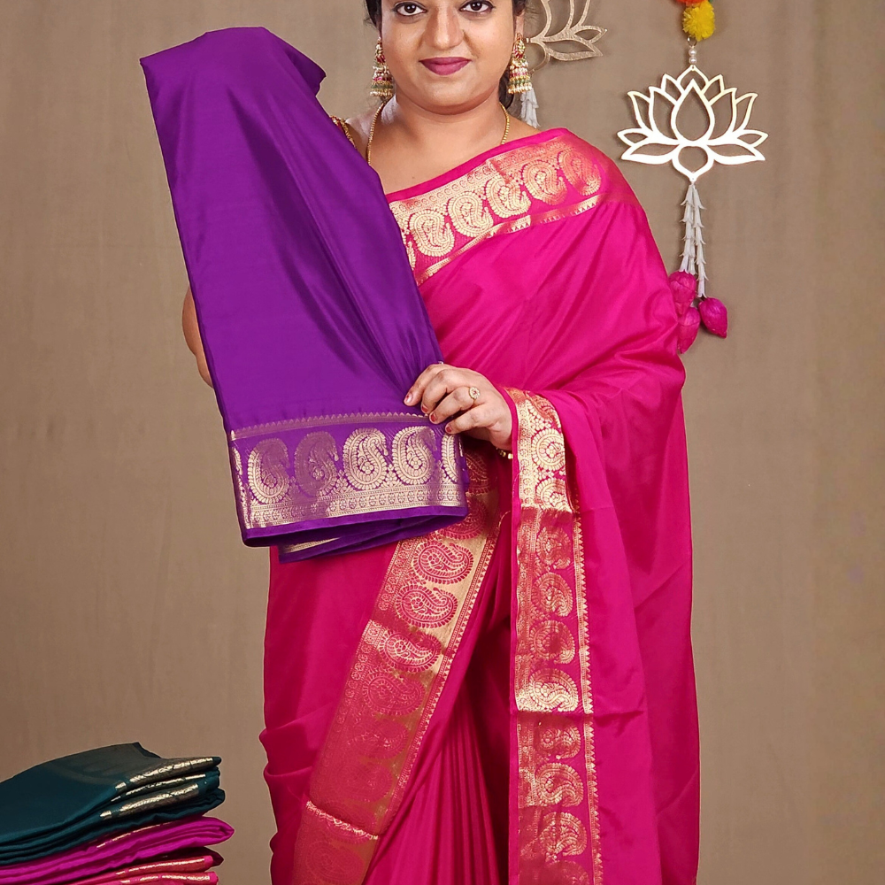 Experience timeless elegance with our Semi mysore silk, beautifully crafted with zari woven mango borders. A rich brocade pallu adds to the grandeur paired with a running blouse....