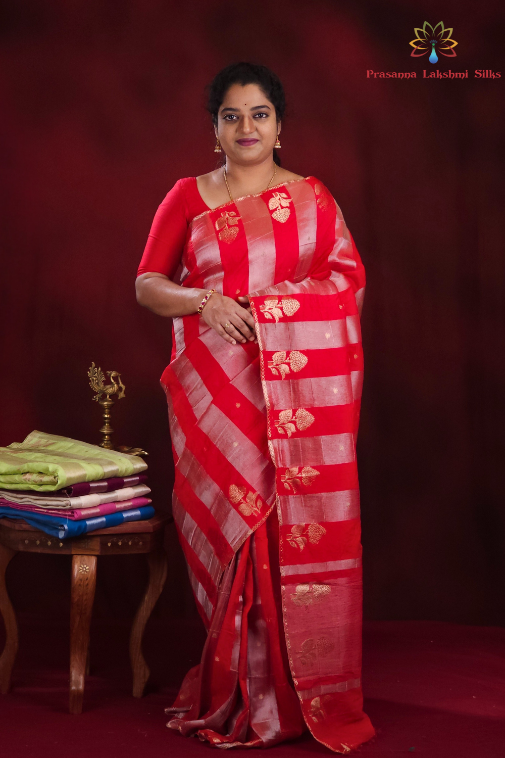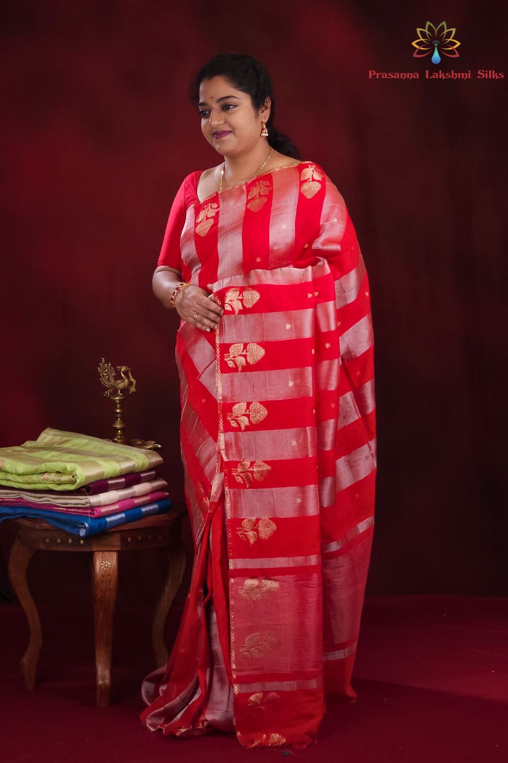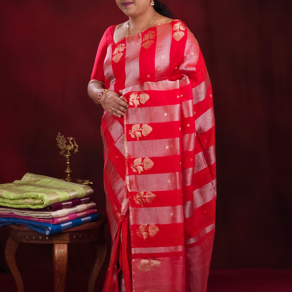 Elevate your style with your Chanderi saree allover zari stripes ,small motifs ,simple tissue pallu ,floral bunches border and running plain blouse