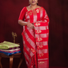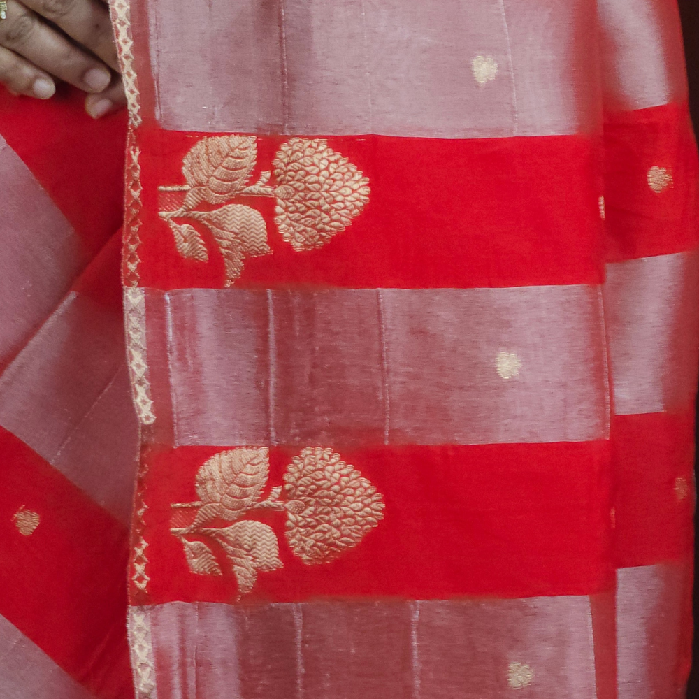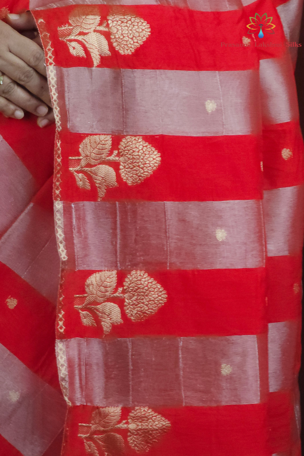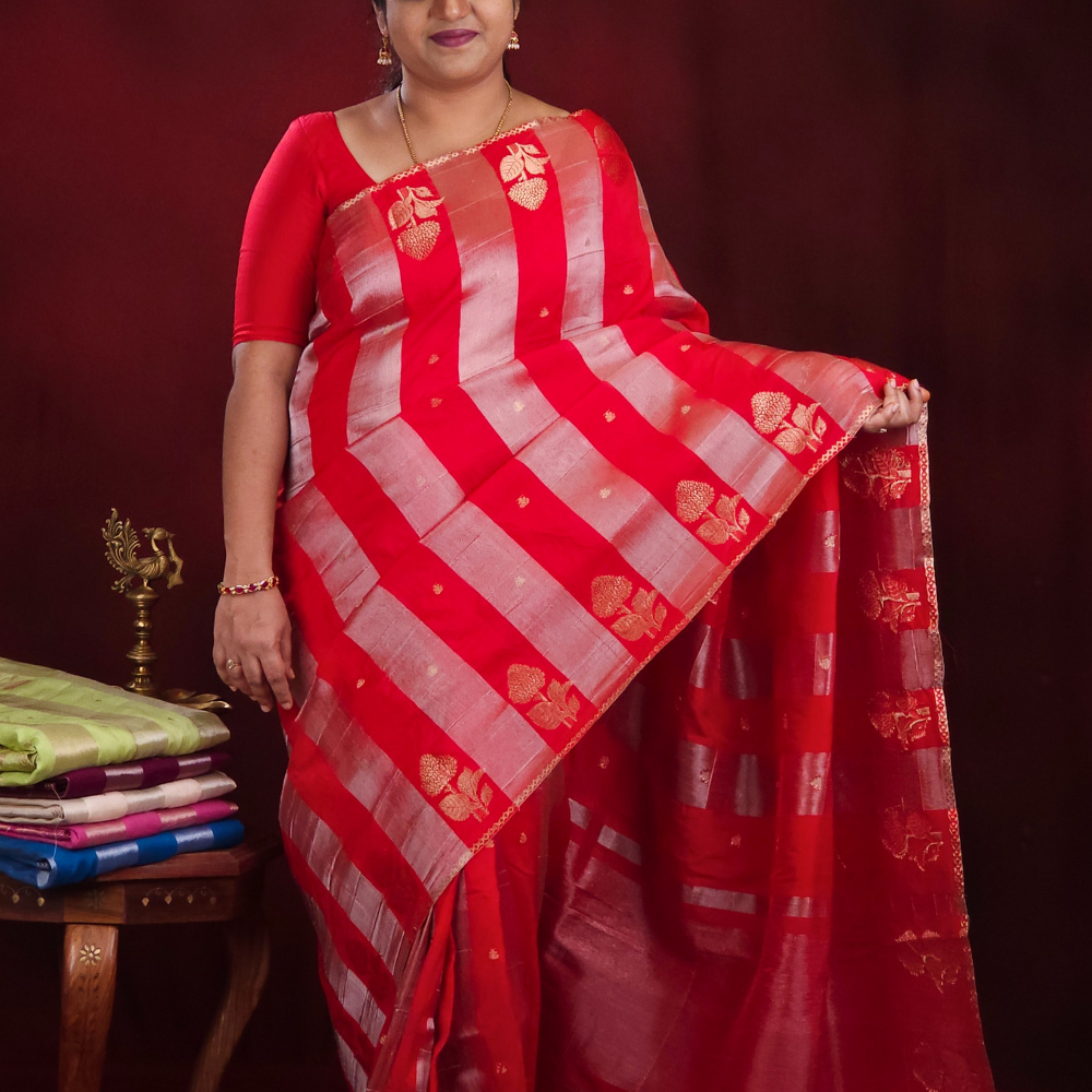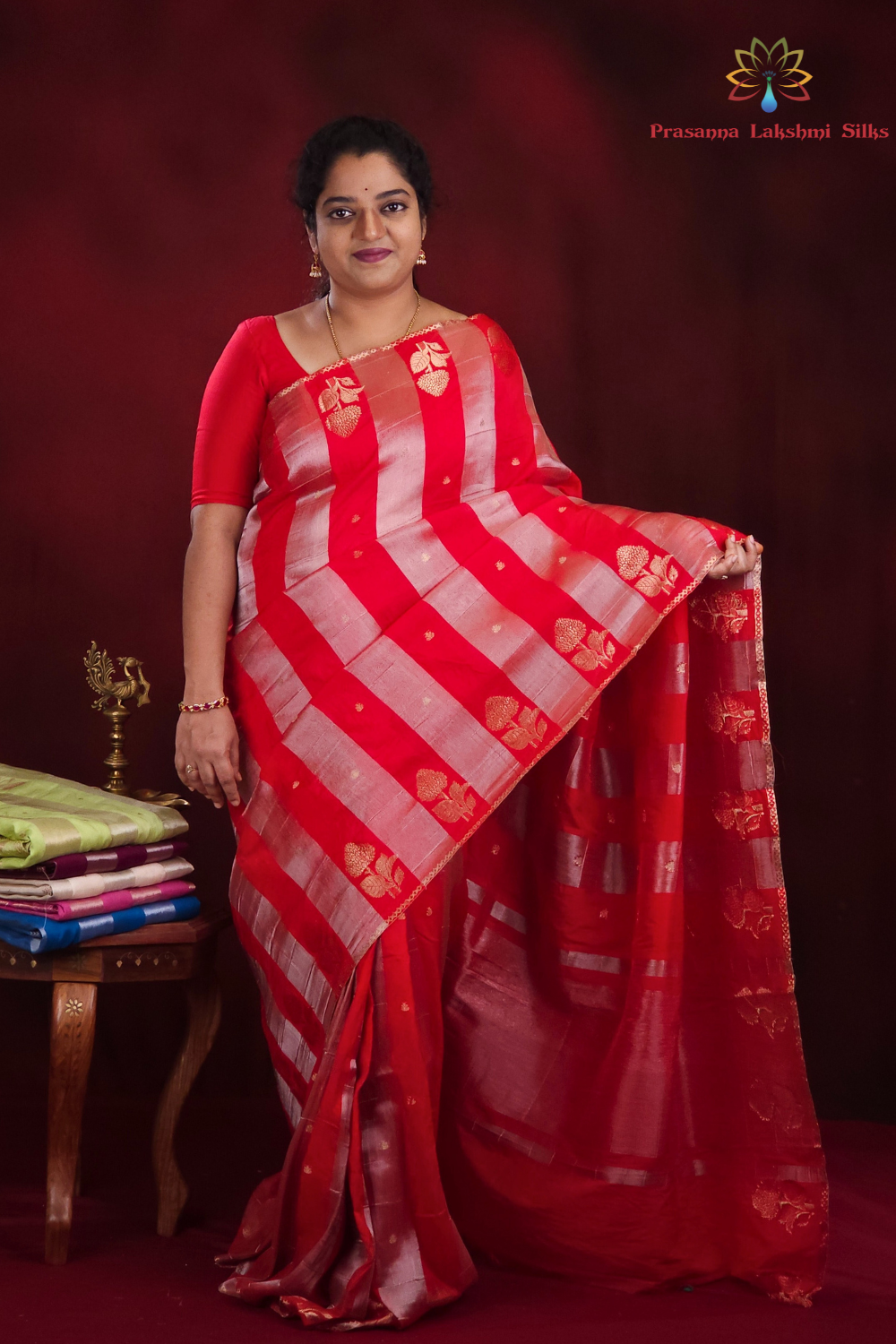 Elevate your style with your Chanderi saree allover zari stripes ,small motifs ,simple tissue pallu ,floral bunches border and running plain blouse