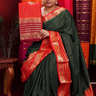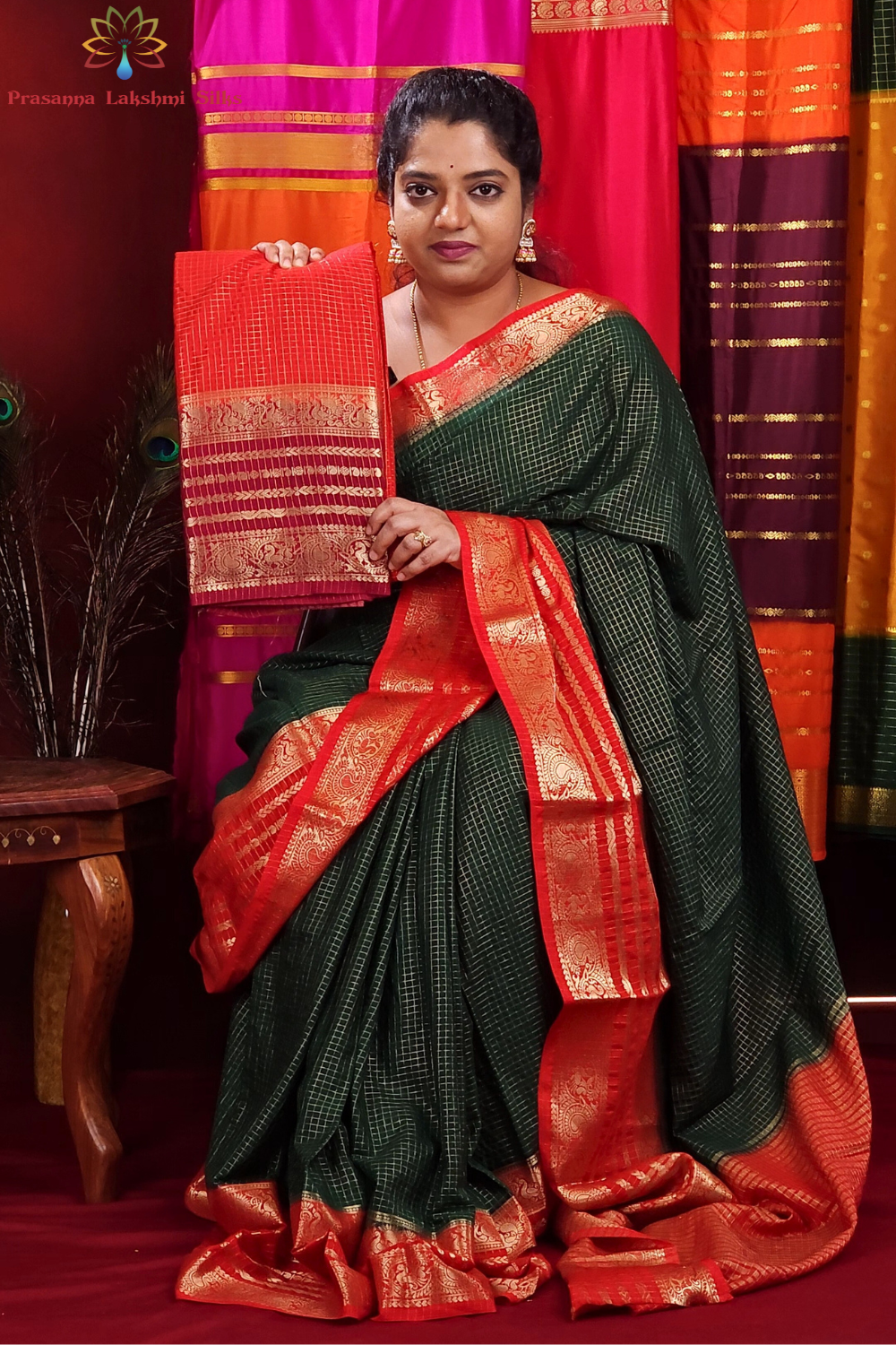 Beautiful Semi Mysore Silk Saree, featuring allover checks designed with a unique border detailing—lower side contrast lines border and a 1-inch contrast border on the upper side,The look is completed with a zari stripes pallu,and a contrast blouse