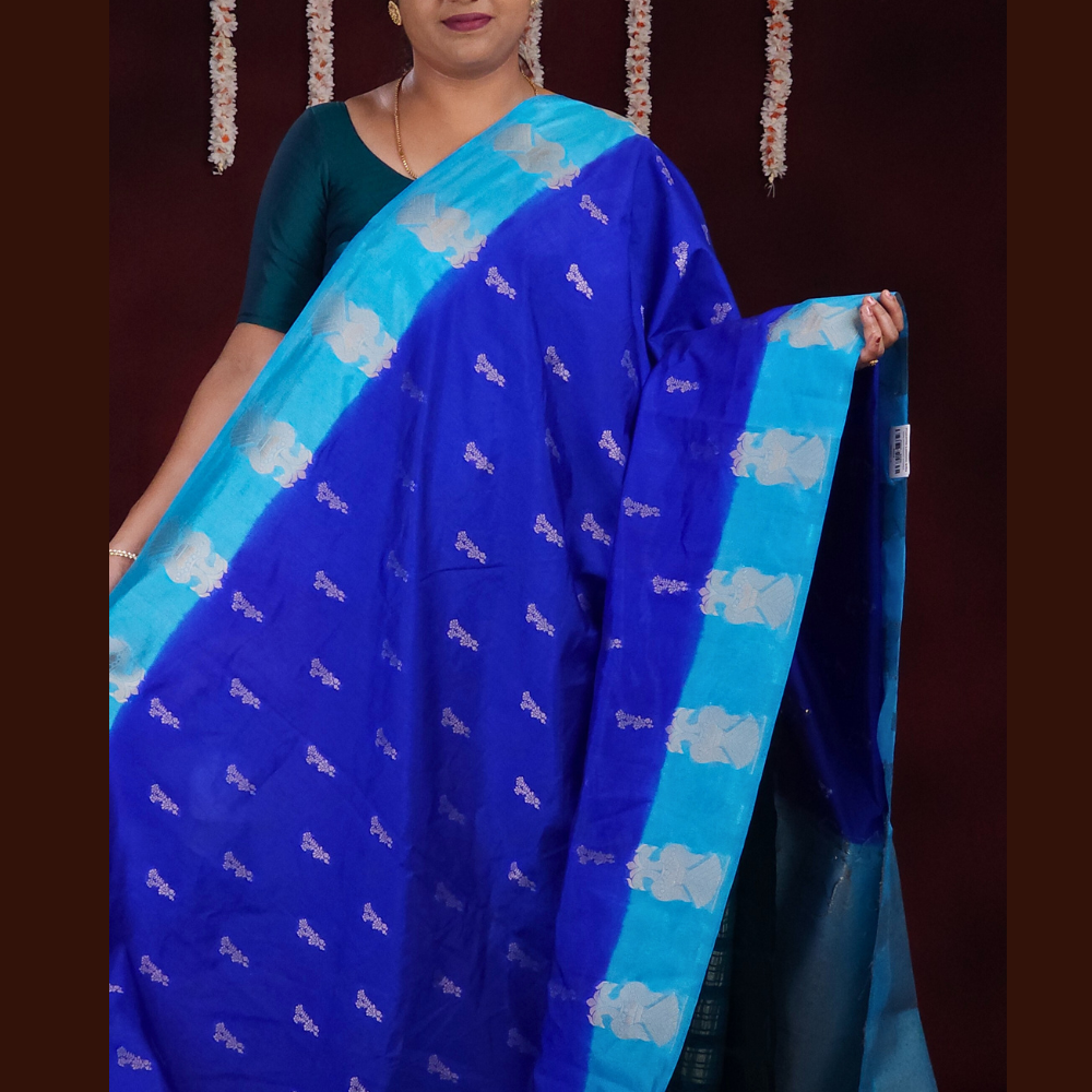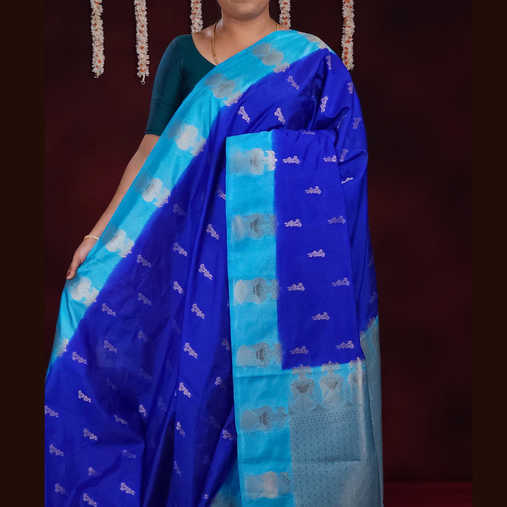 Experience the beauty of our Semi Dupion Saree, crafted with allover small zari woven motifs for a touch of elegance,unique zari-woven Peacock motifs border designs rich zari-woven pallu .Paired with contrast blouse....