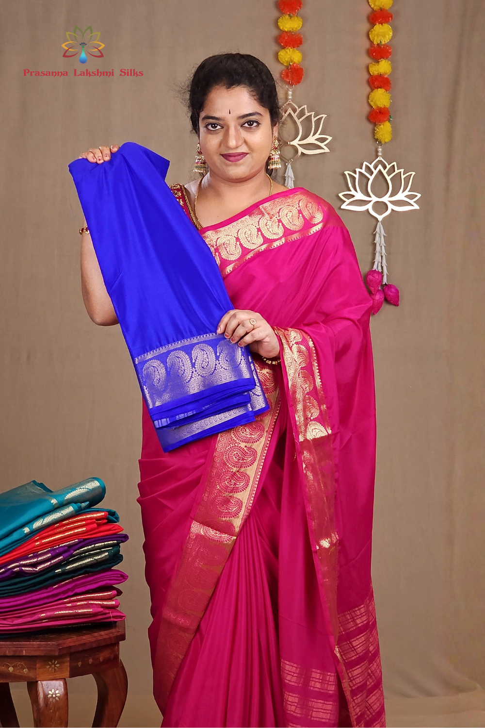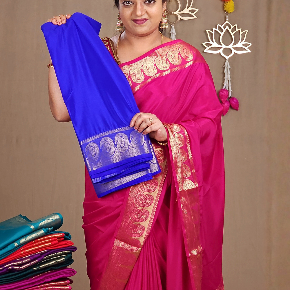 Experience timeless elegance with our Semi mysore silk, beautifully crafted with zari woven mango borders. A rich brocade pallu adds to the grandeur paired with a running blouse....