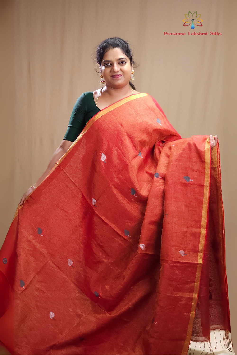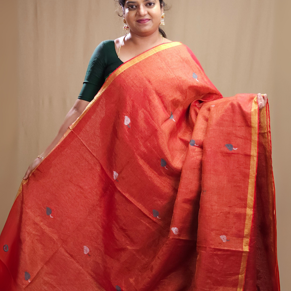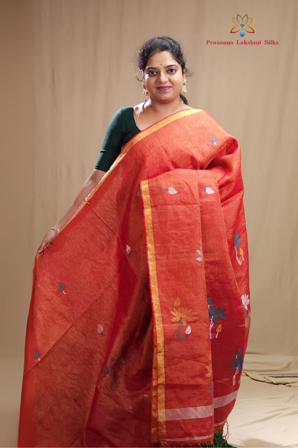 Exquisite Pure Linen Tissues Sarees featuring intricate Jamdhani floral motifs all over the body, with subtle Meenakari detailing for a touch of elegance. A sleek 1-inch zari border with rich Floral pallu paired with a running blouse for a complete graceful look.....