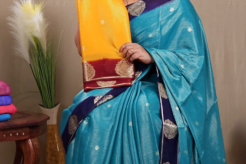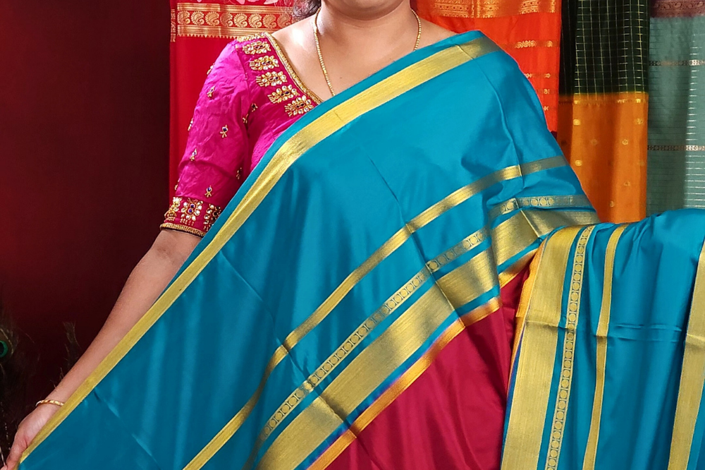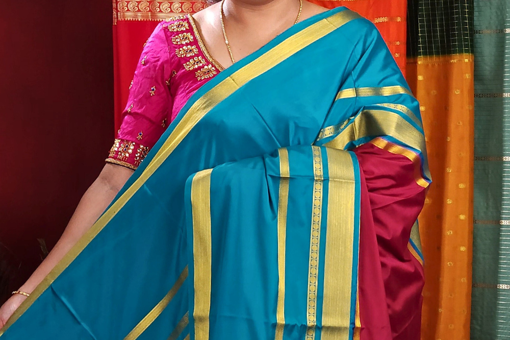 Maroon and Peacock Blue Semi Mysore Silk Saree