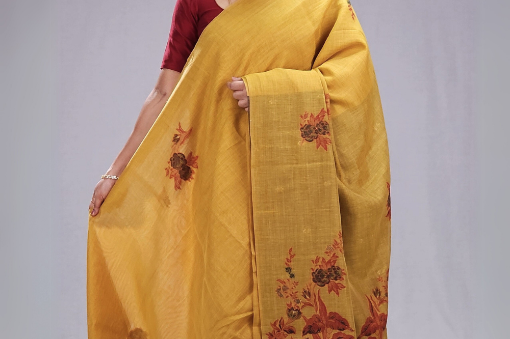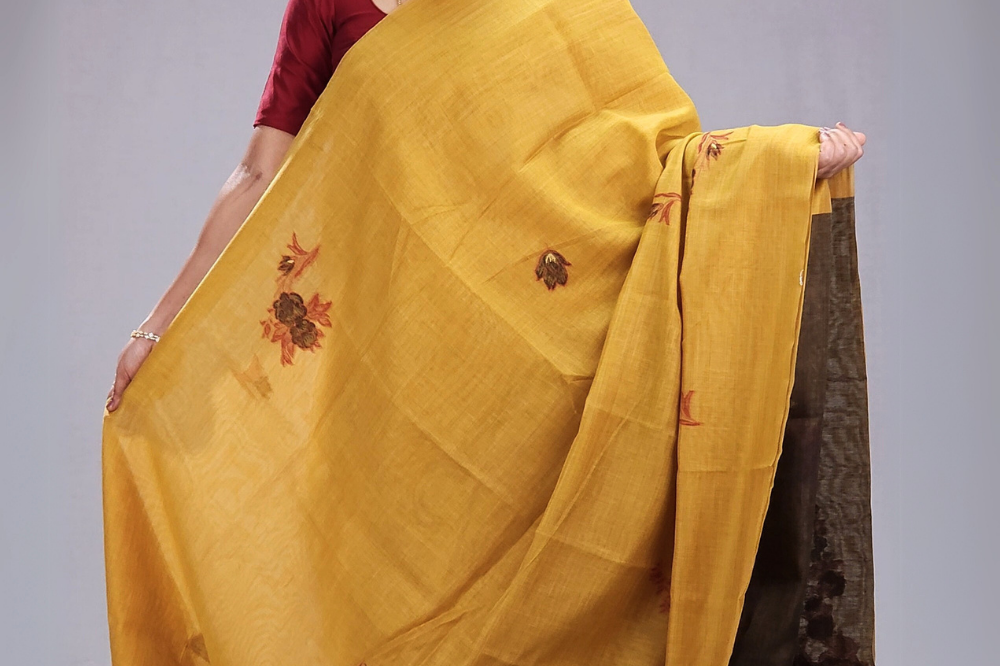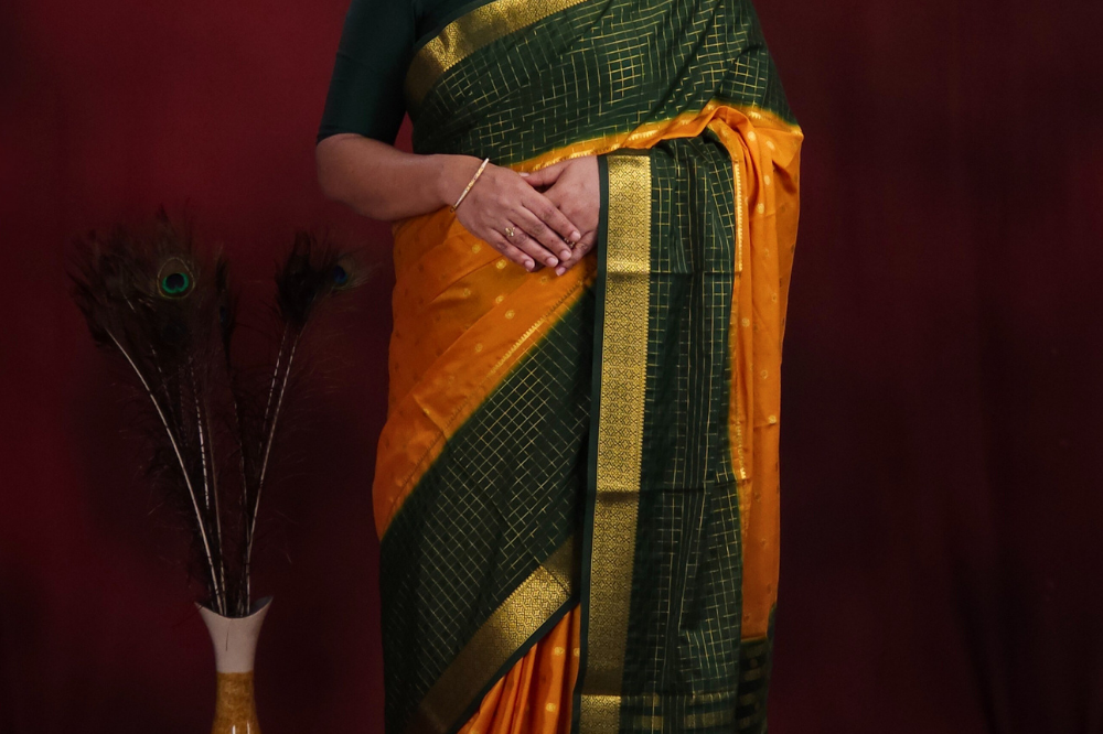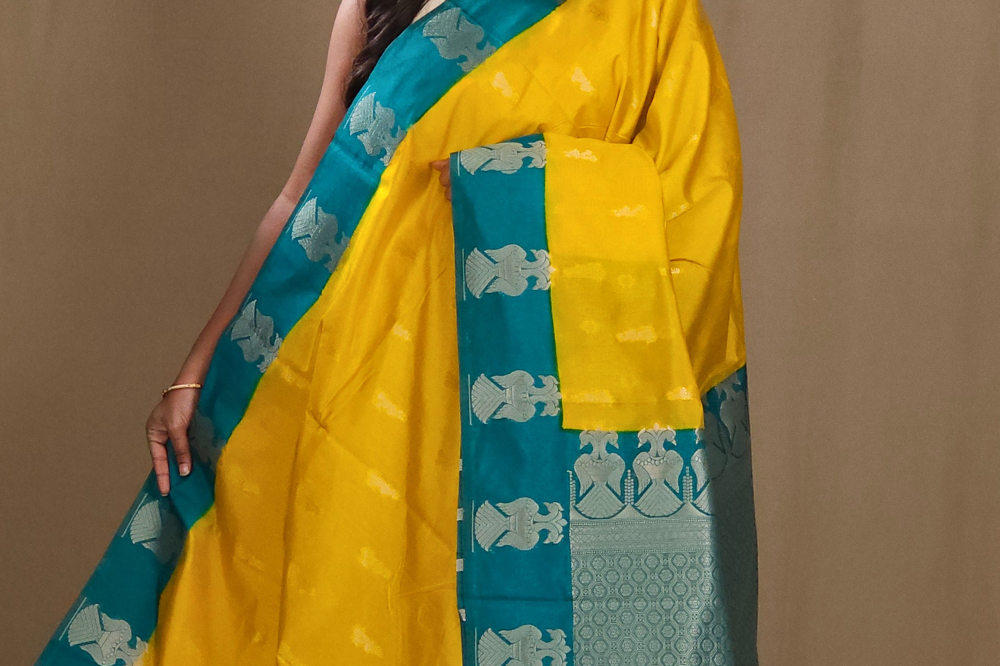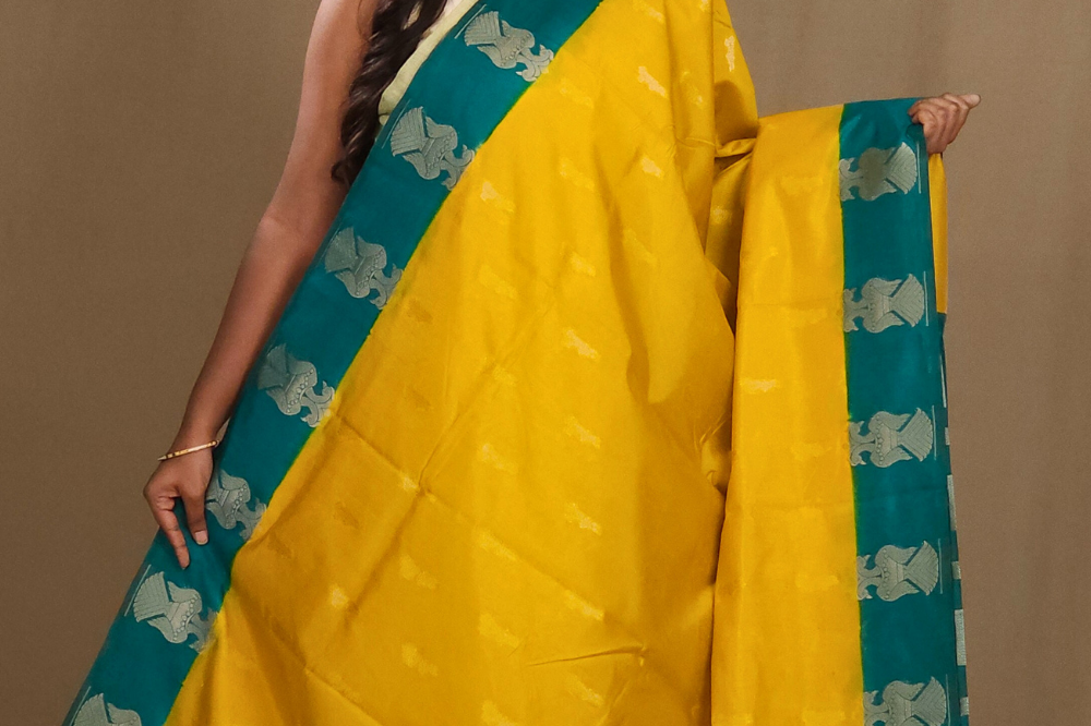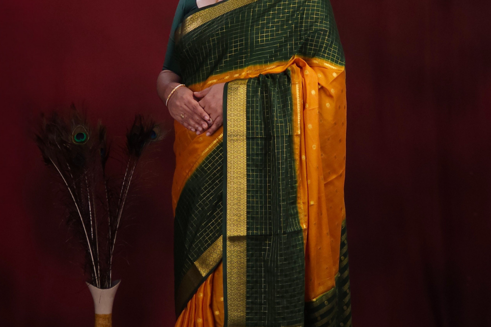 Mustard Yellow and Ramagreen Crepe Georgette Saree