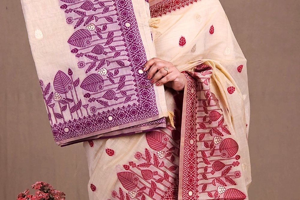 Beige and Dark Pink Chanderi Silk Cotton Saree