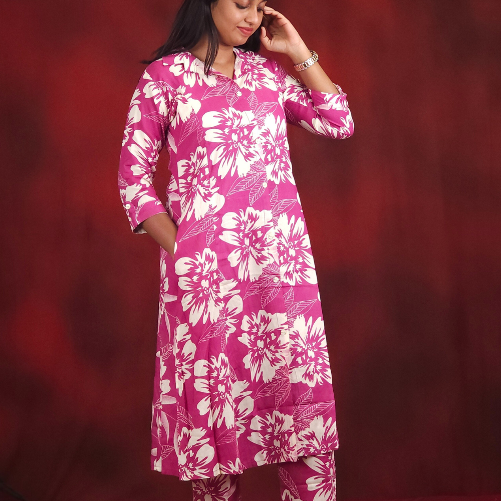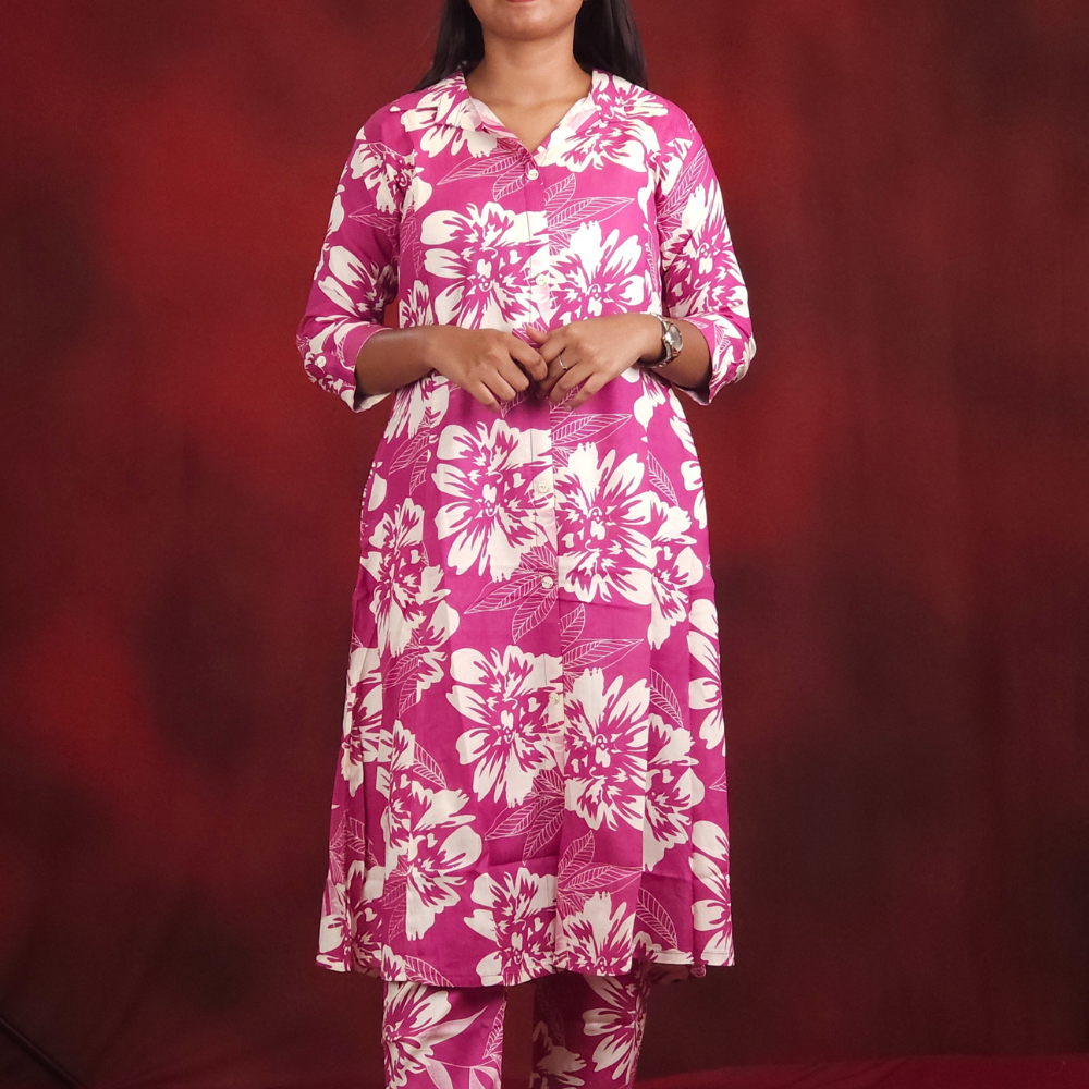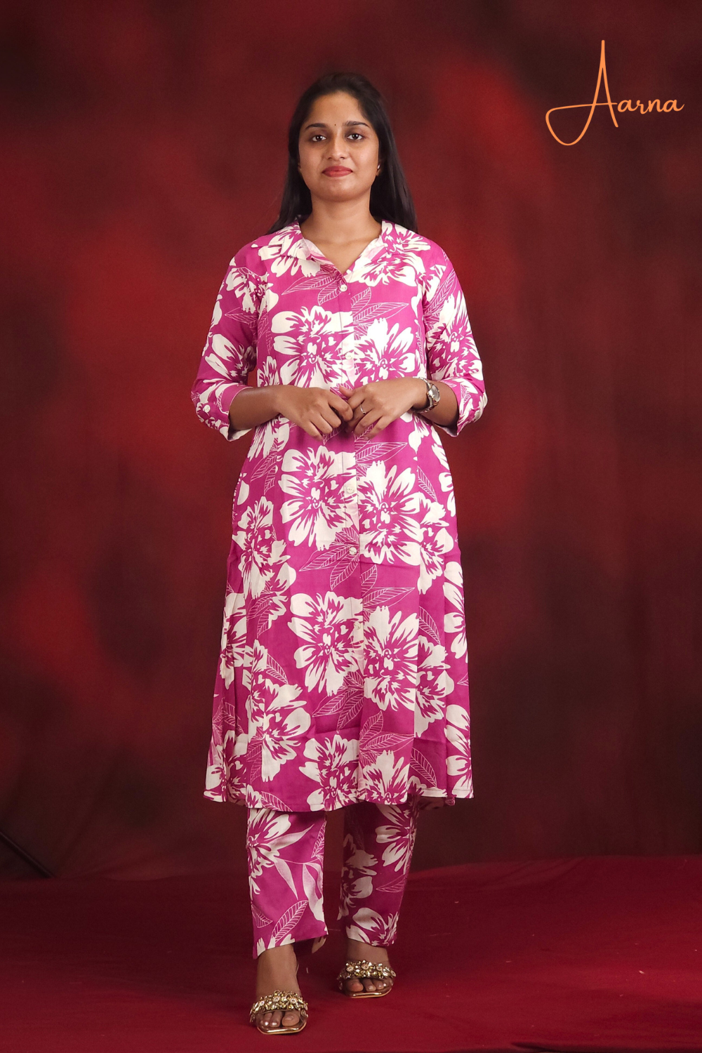 Stay stylish and comfortable with this rayon co-ord set. It features floral digital prints top with a collar neck and button detailing, paired with matching pants . Perfect for everyday outings or casual workwear