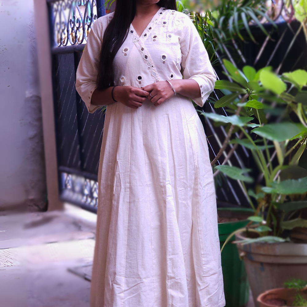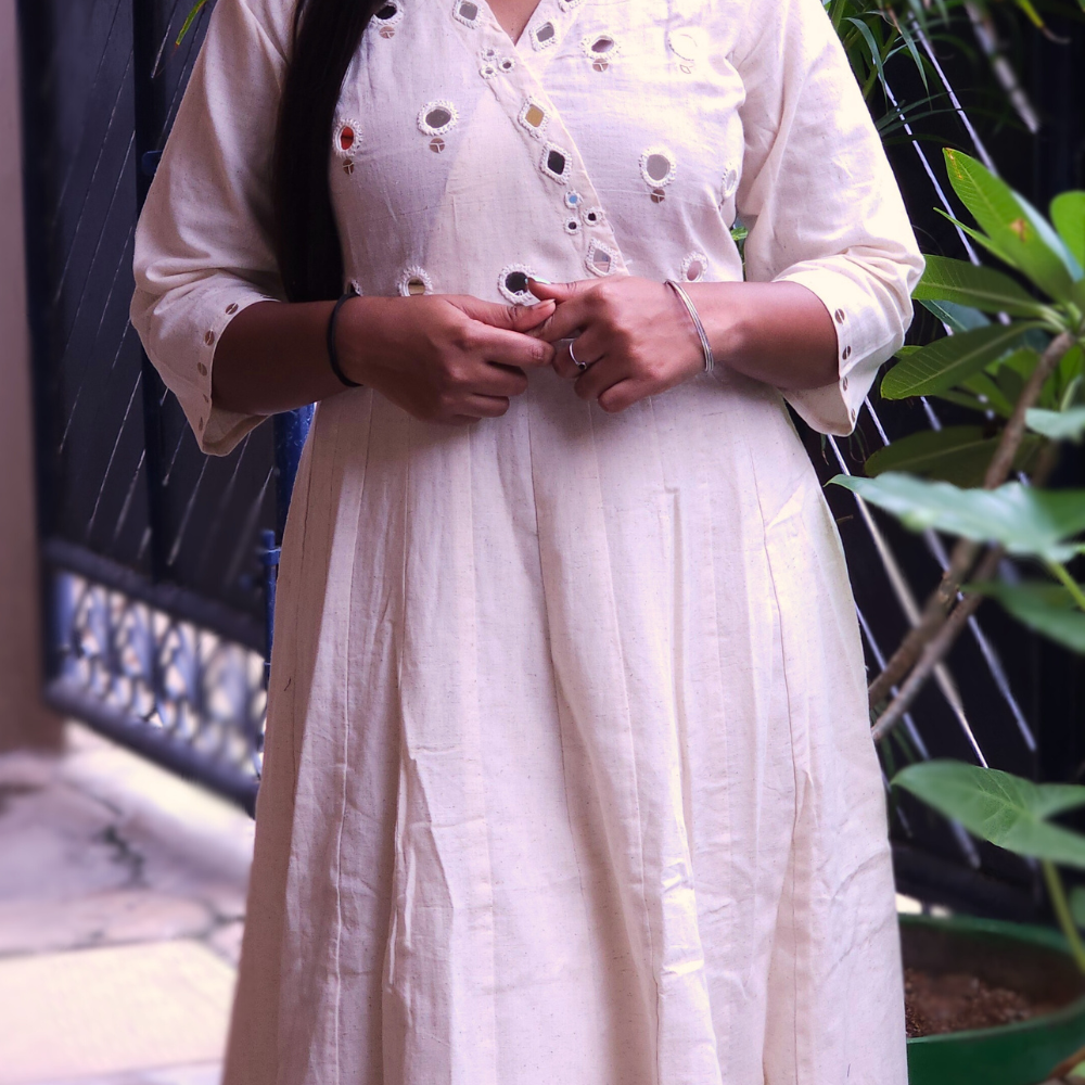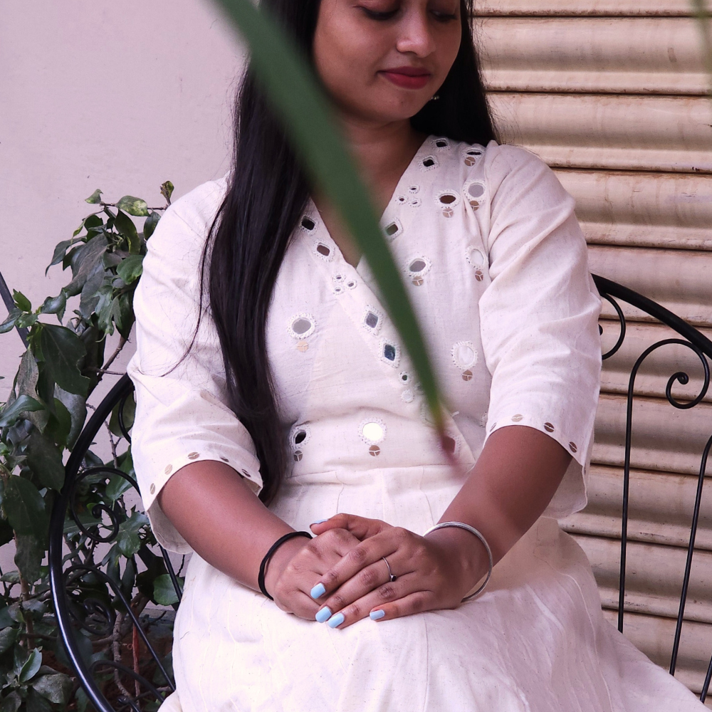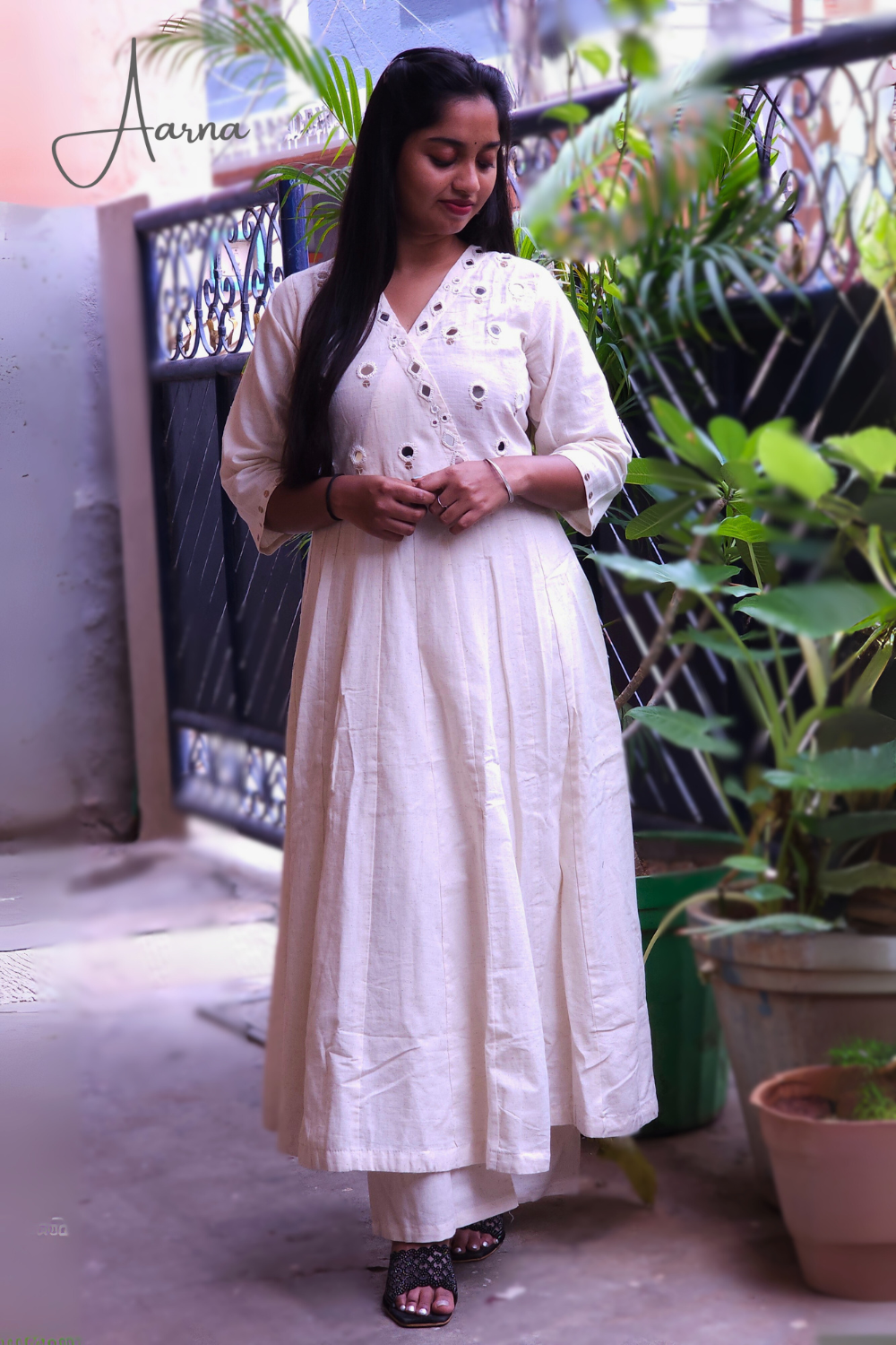 Elevate your style with our Khadi Cotton Co-ord Set in Elegant Anarkali-style top with original mirror work, paired with comfy palazzo bottoms. Stylish, breathable & perfect for any occasion!