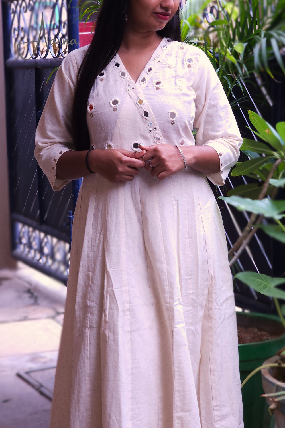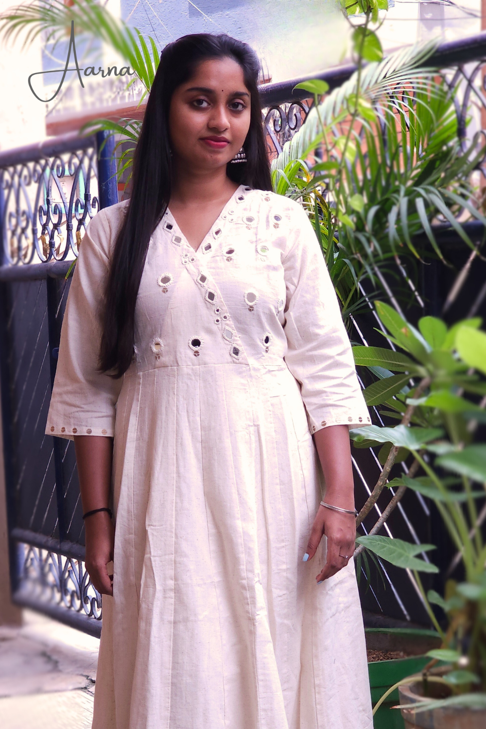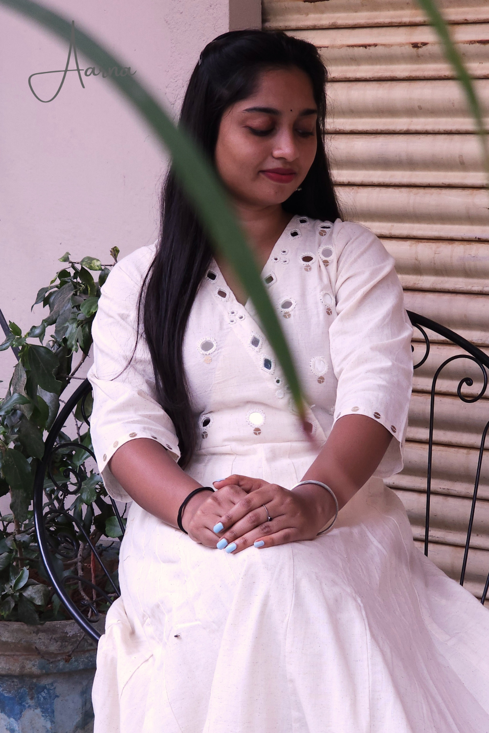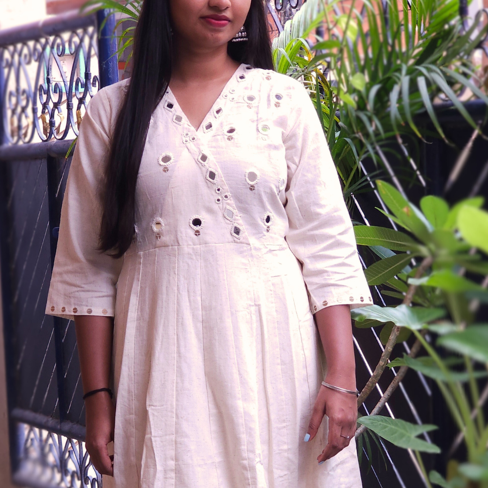 Elevate your style with our Khadi Cotton Co-ord Set in Elegant Anarkali-style top with original mirror work, paired with comfy palazzo bottoms. Stylish, breathable & perfect for any occasion!