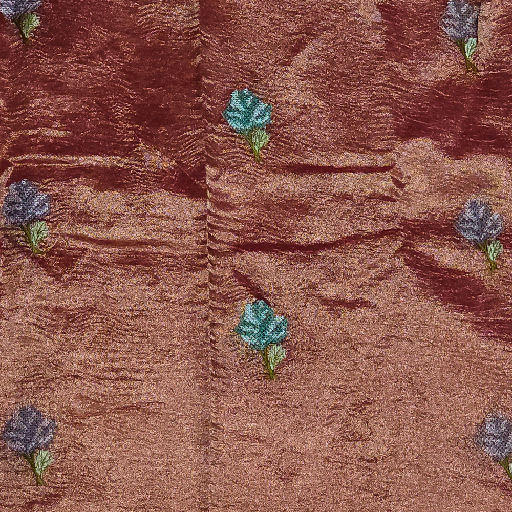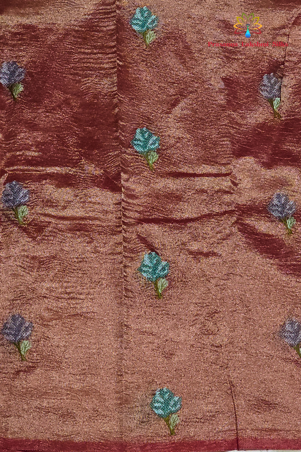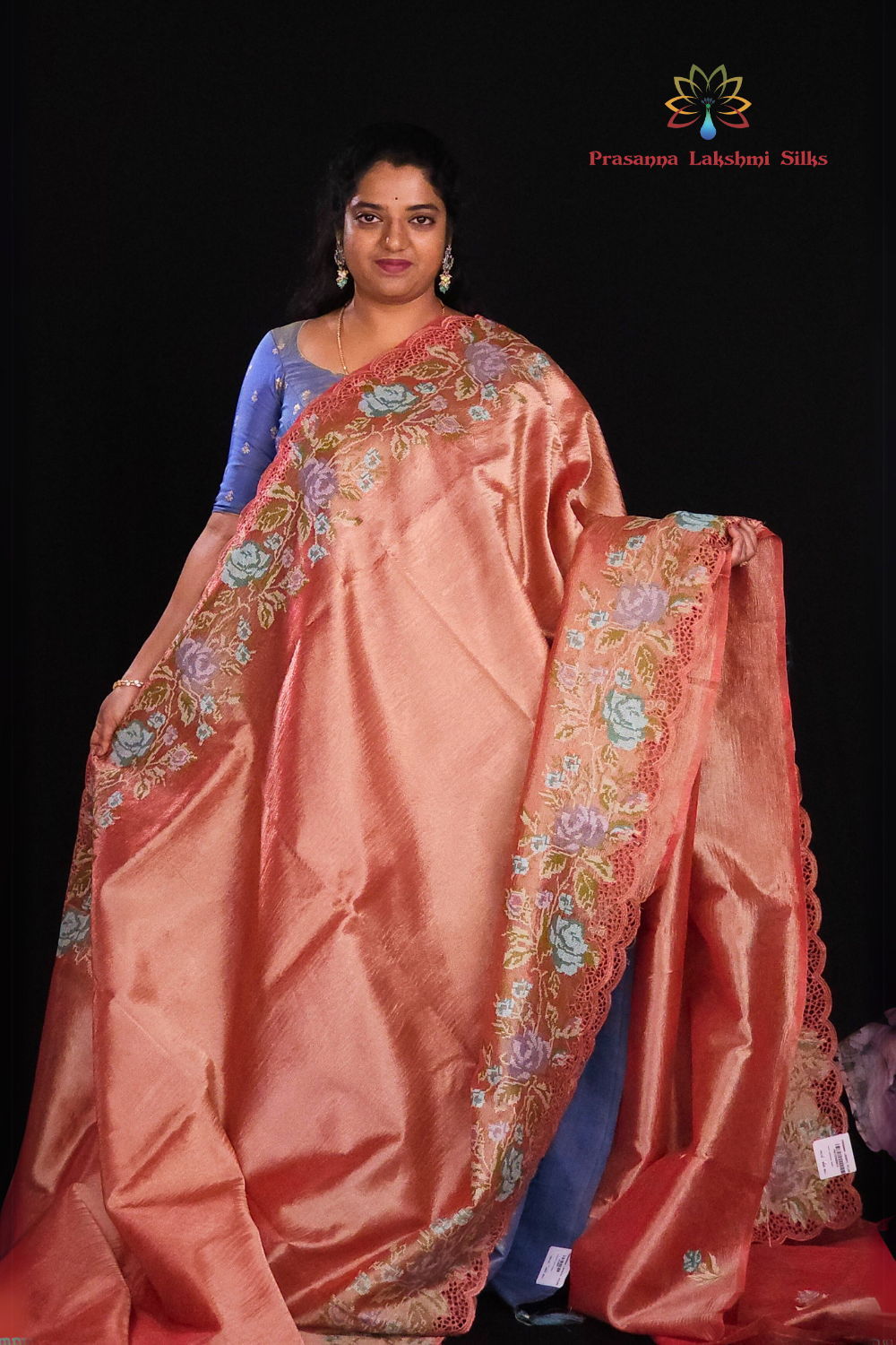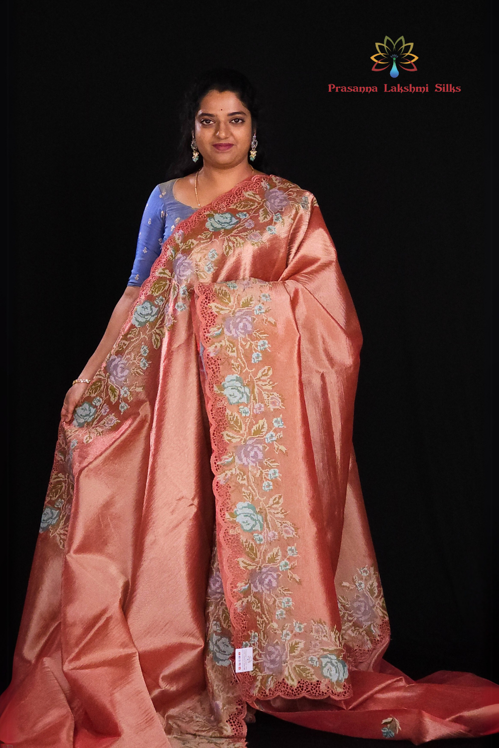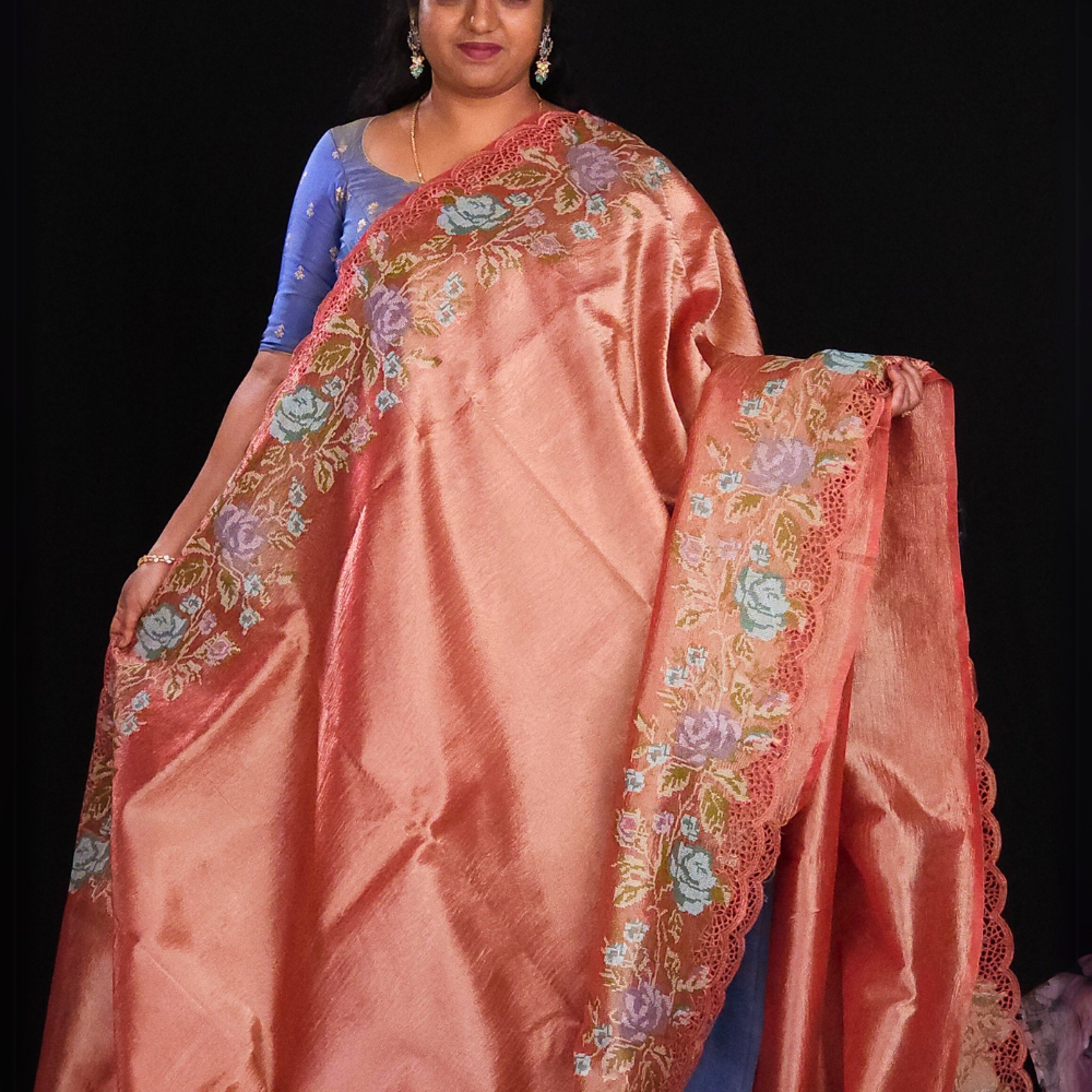 Elevate your style with our stunning Crush Tissue Saree,allover thread embroidered buttas with Elegant floral cutwork thread embroidered borders , pallu paired with running blouse
