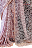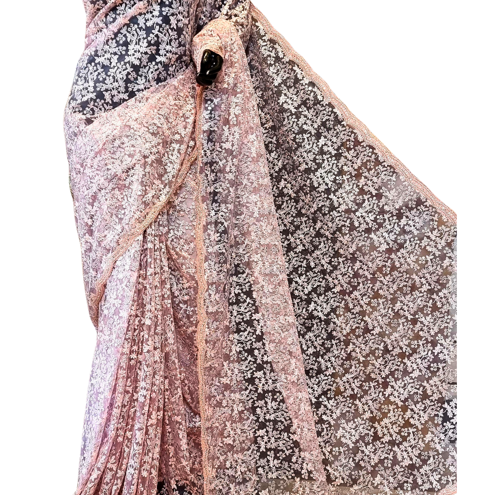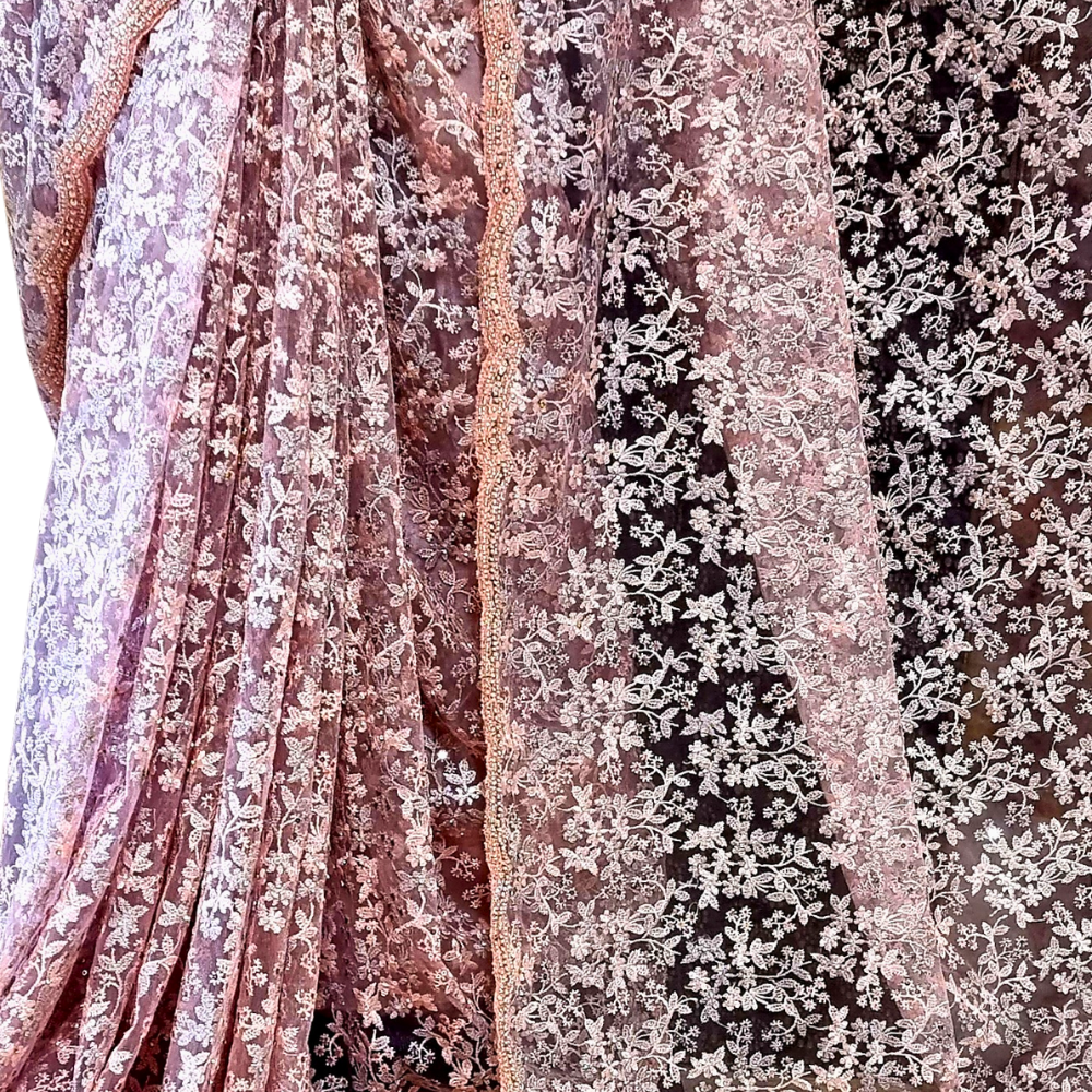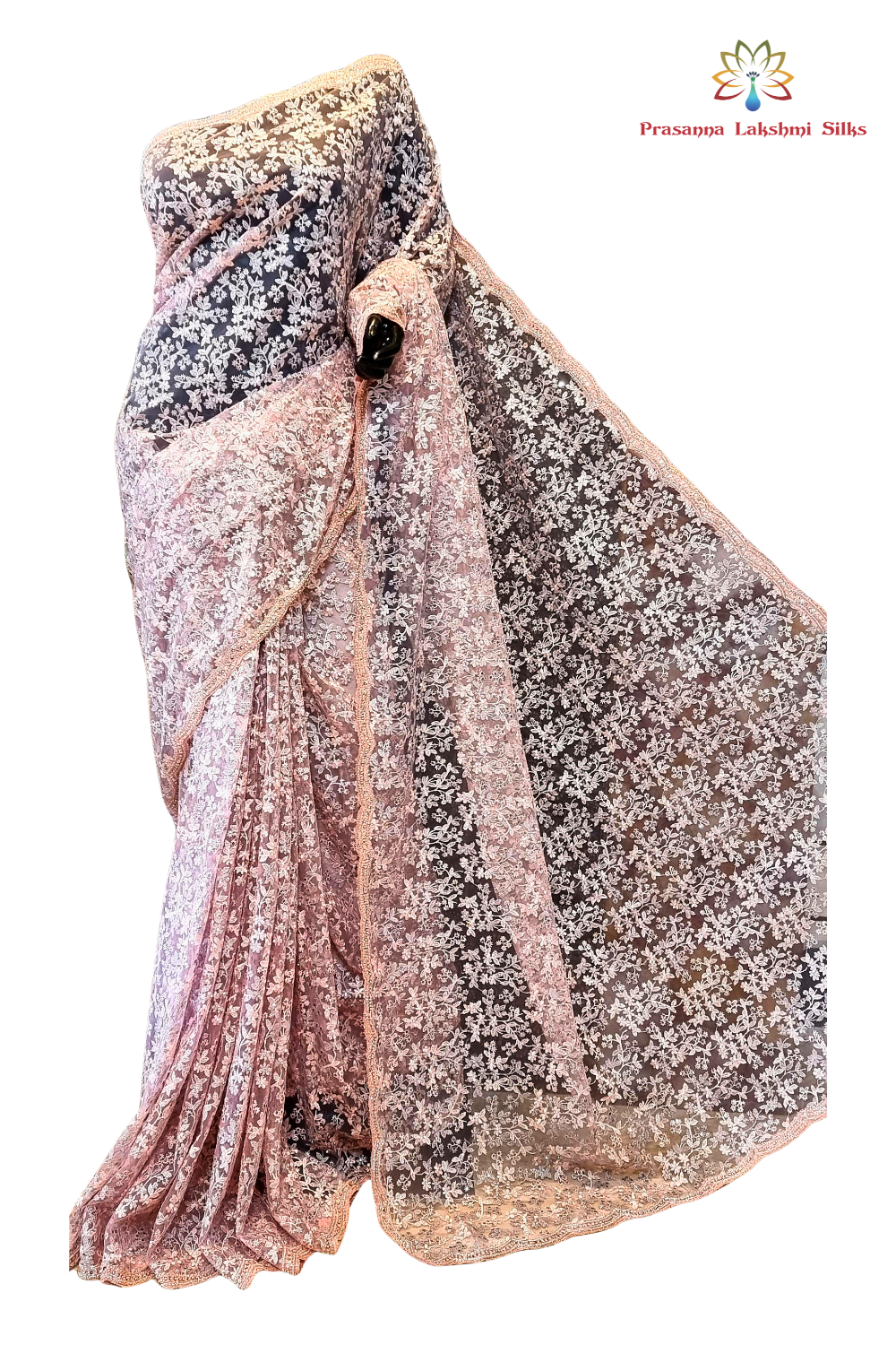 Elevate your look with this Designer imported soft net sarees in beautiful pastel shade with allover floral thread embroidery with sequence touch and beautifull cut work borders with pearls and bead work paired with designer crepe silks blouse piece.....