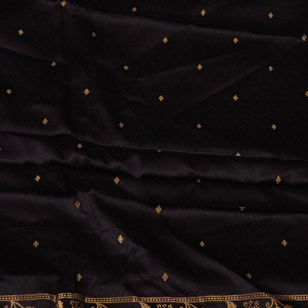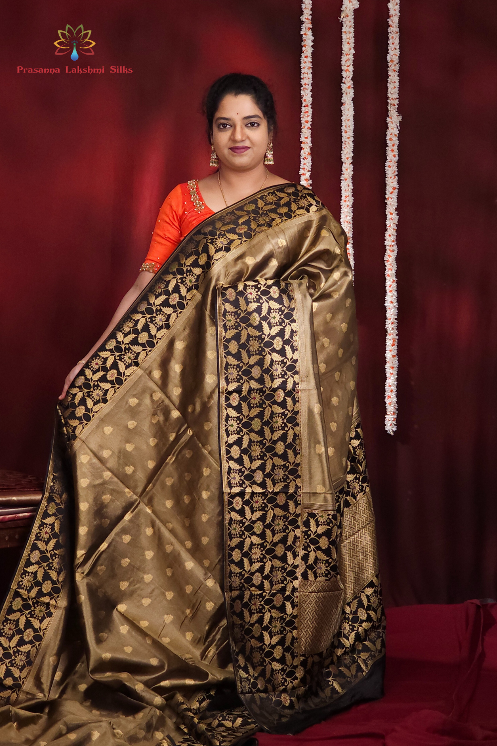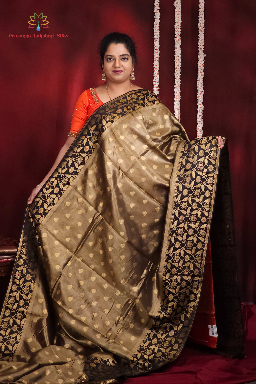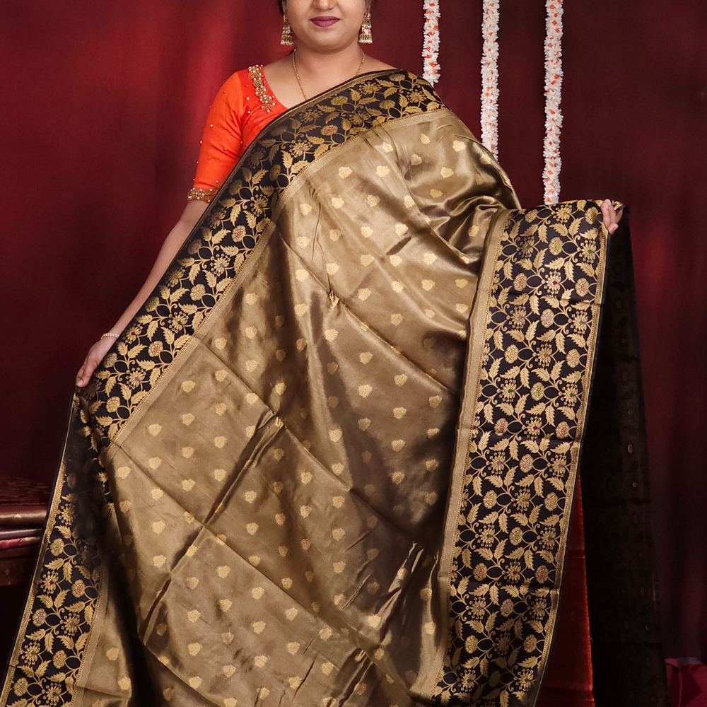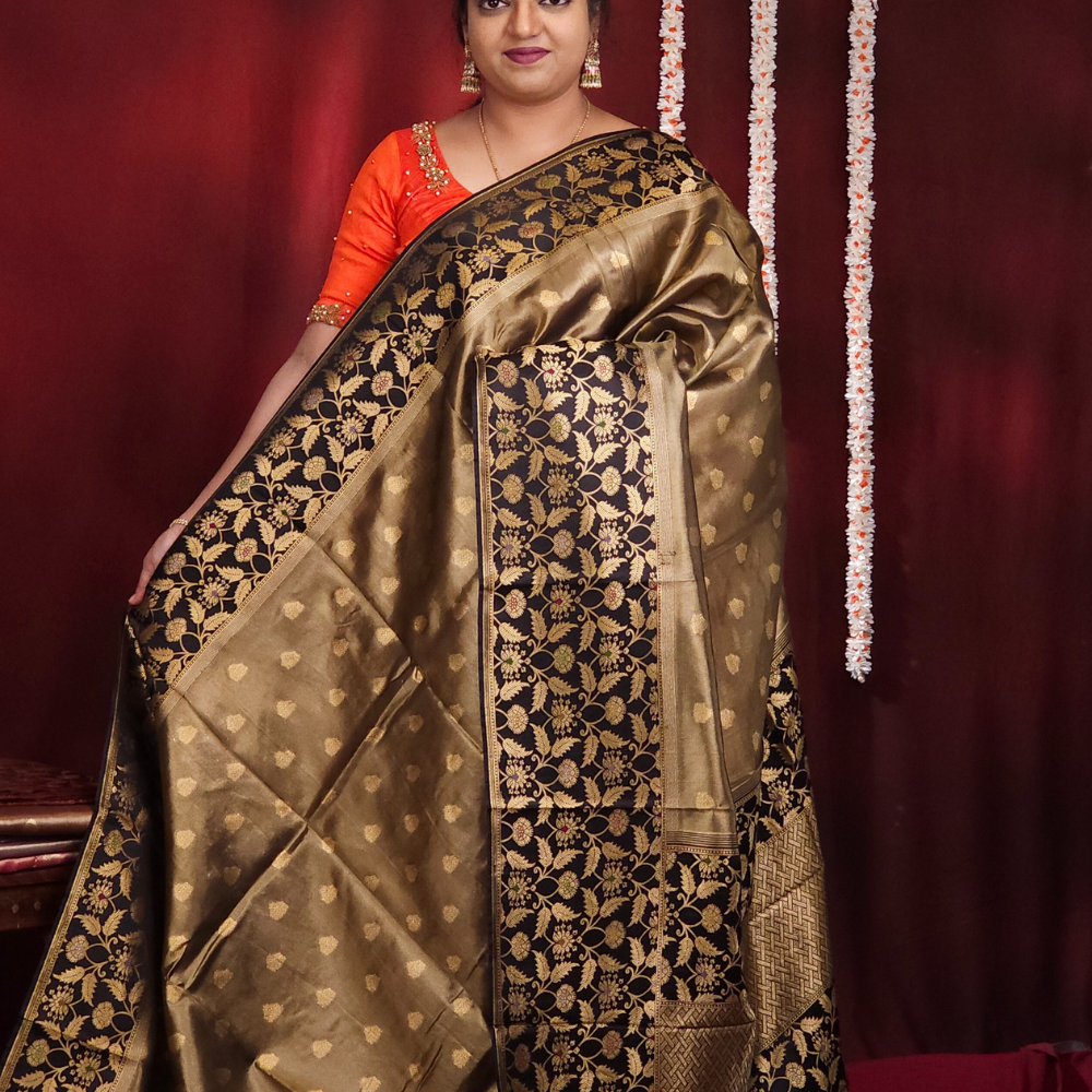 Exclusive Banarasi Tissue Saree with a rich tissue base allover zari woven motifs, giving it a luxurious finish,with a very detailed floral Meenakari zari woven borders, and a grand Meenakari pallu . It is paired with a self embossed blouse adorned with small zari-woven motifs....