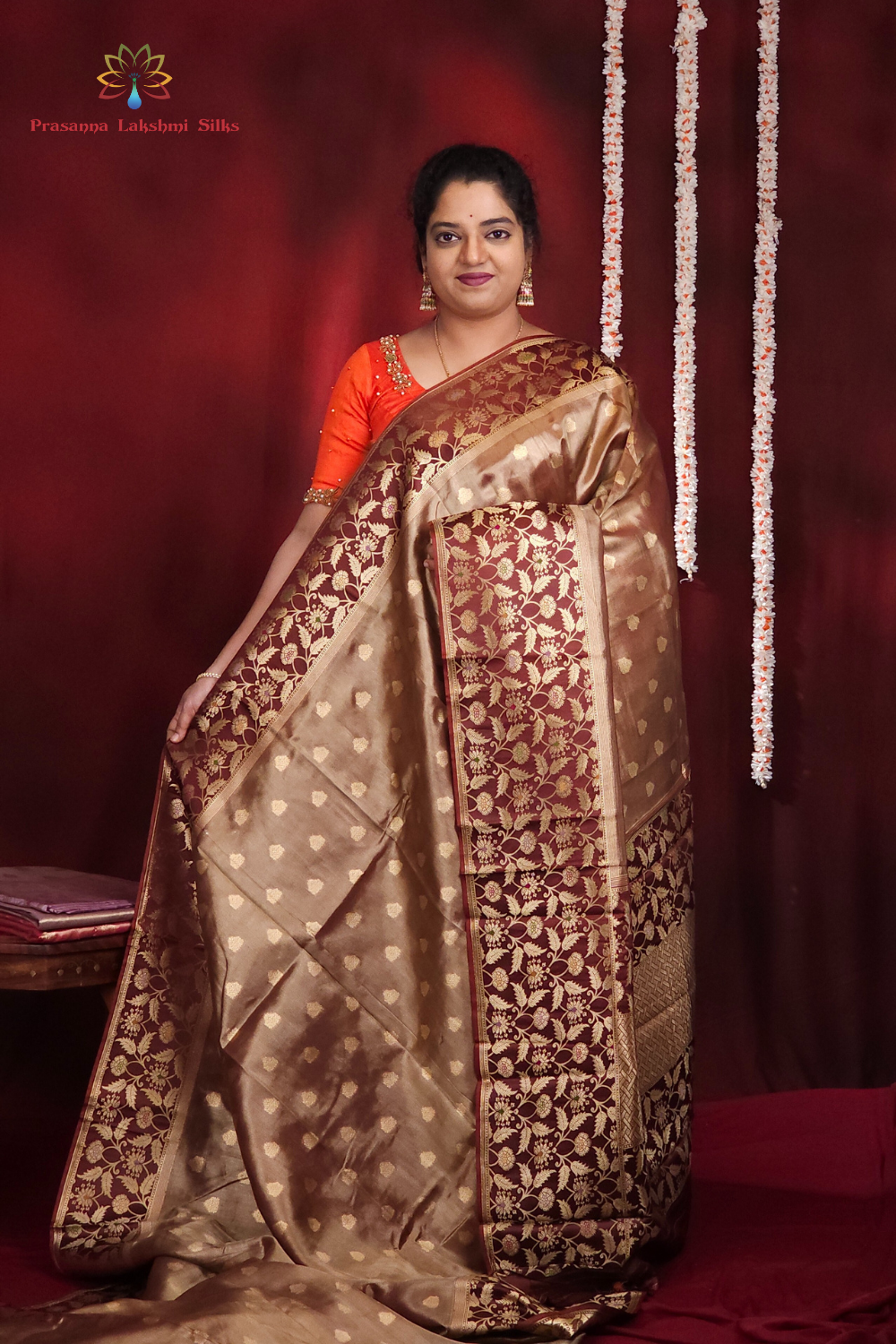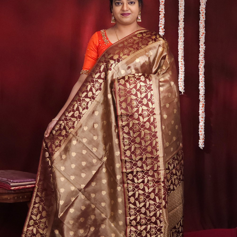 Exclusive Banarasi Tissue Saree with a rich tissue base allover zari woven motifs, giving it a luxurious finish,with a very detailed floral Meenakari zari woven borders, and a grand Meenakari pallu . It is paired with a self embossed blouse adorned with small zari-woven motifs....