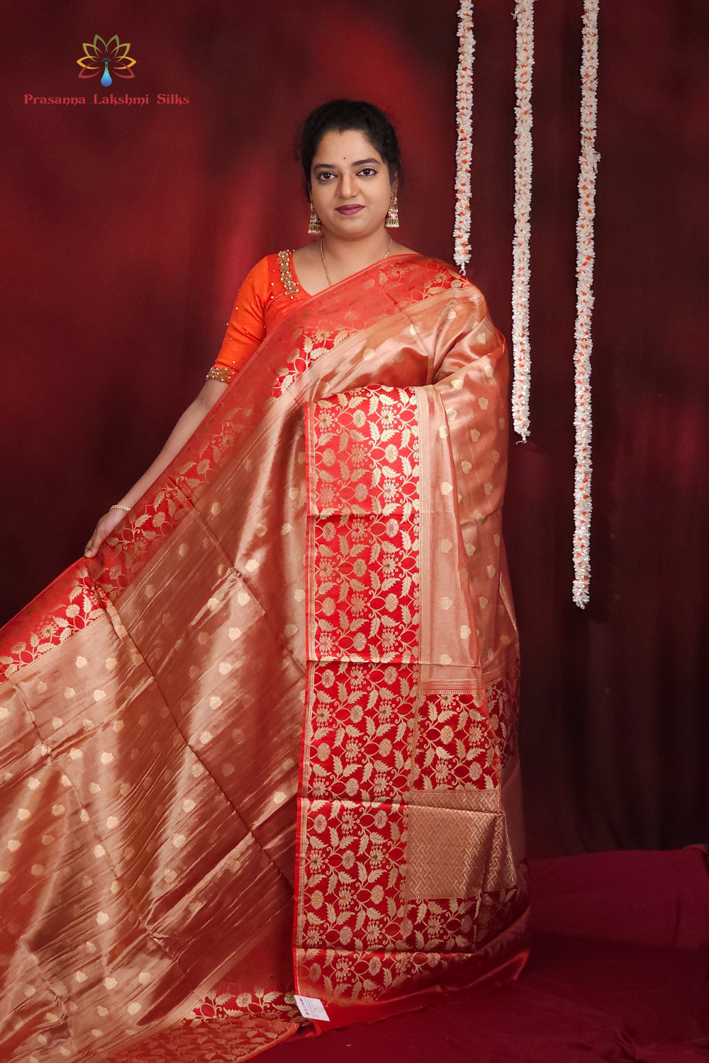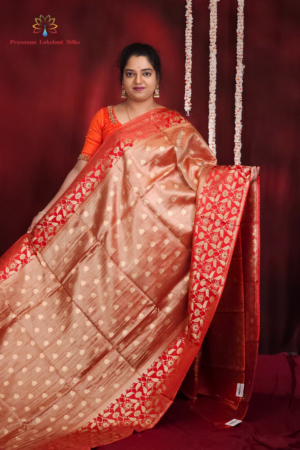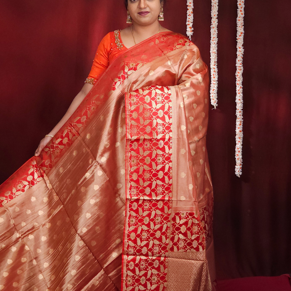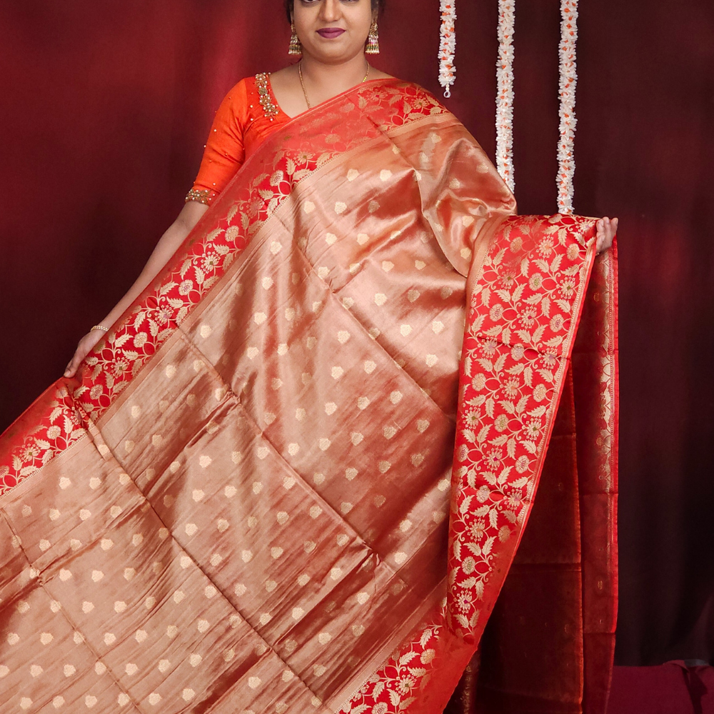 Exclusive Banarasi Tissue Saree with a rich tissue base allover zari woven motifs, giving it a luxurious finish,with a very detailed floral Meenakari zari woven borders, and a grand Meenakari pallu . It is paired with a self embossed blouse adorned with small zari-woven motifs....