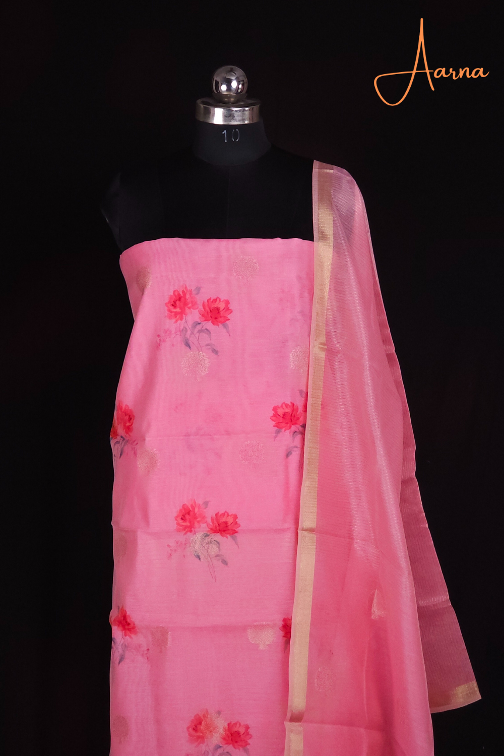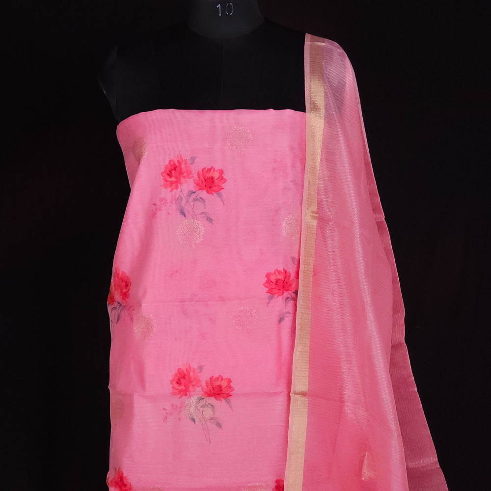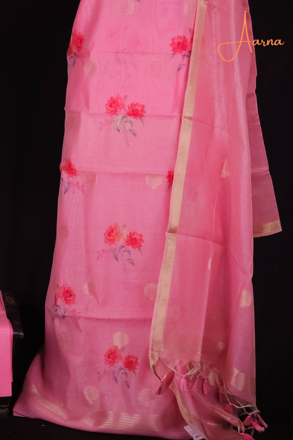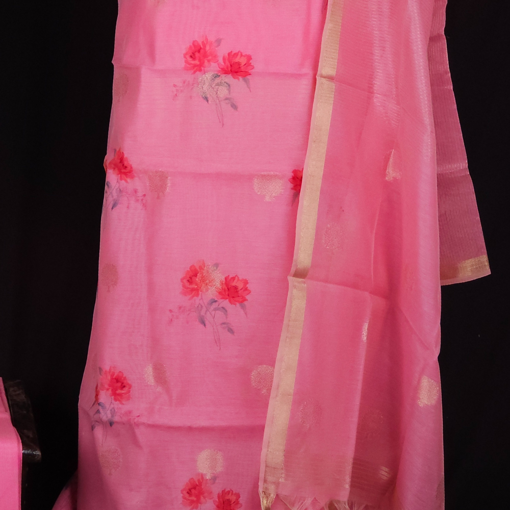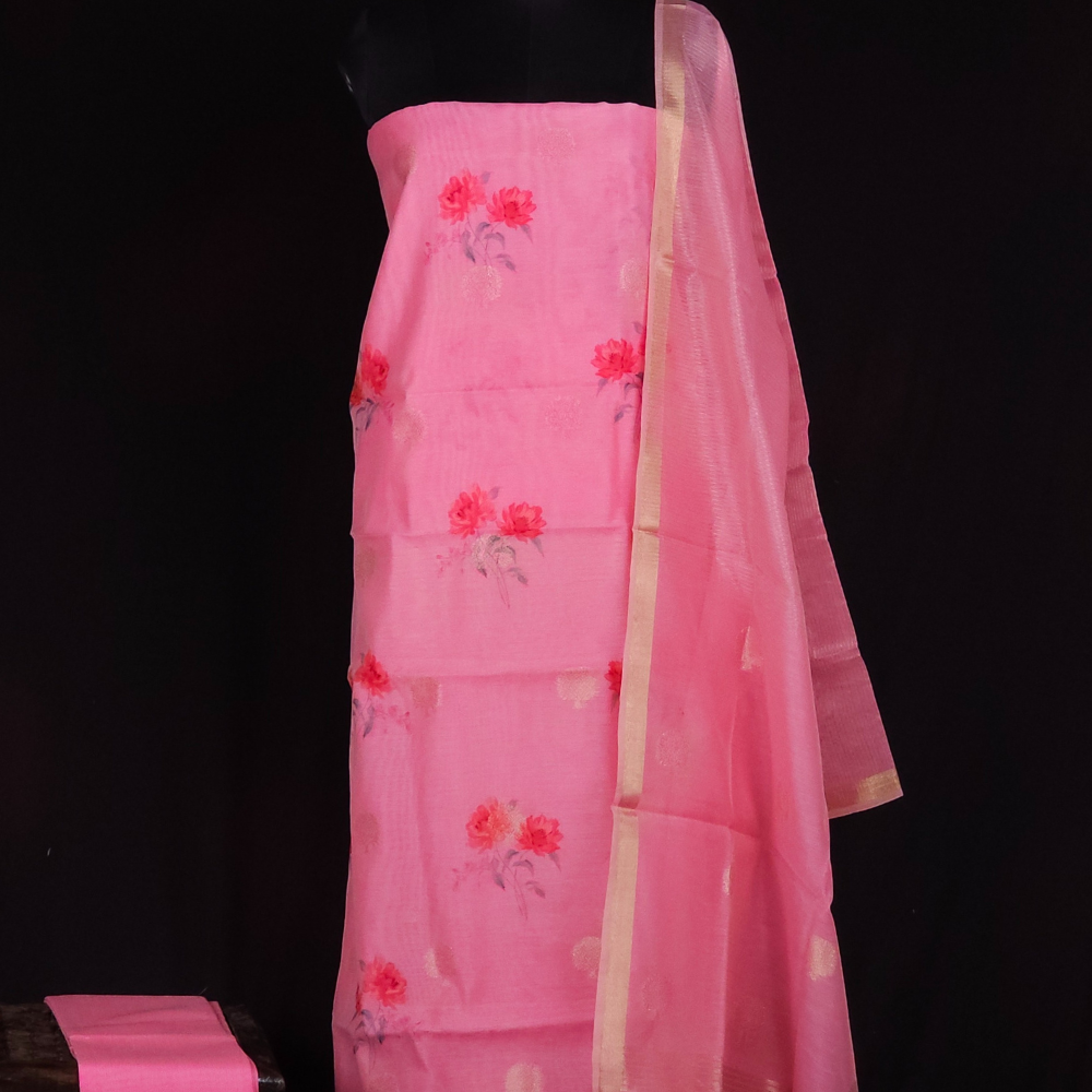 Elevate your ethnic wardrobe with our elegant Chanderi top, featuring allover floral digital prints beautifully complemented by zari-woven motifs., paired with a plain bottom and a richly woven dupatta paired with tassels.....