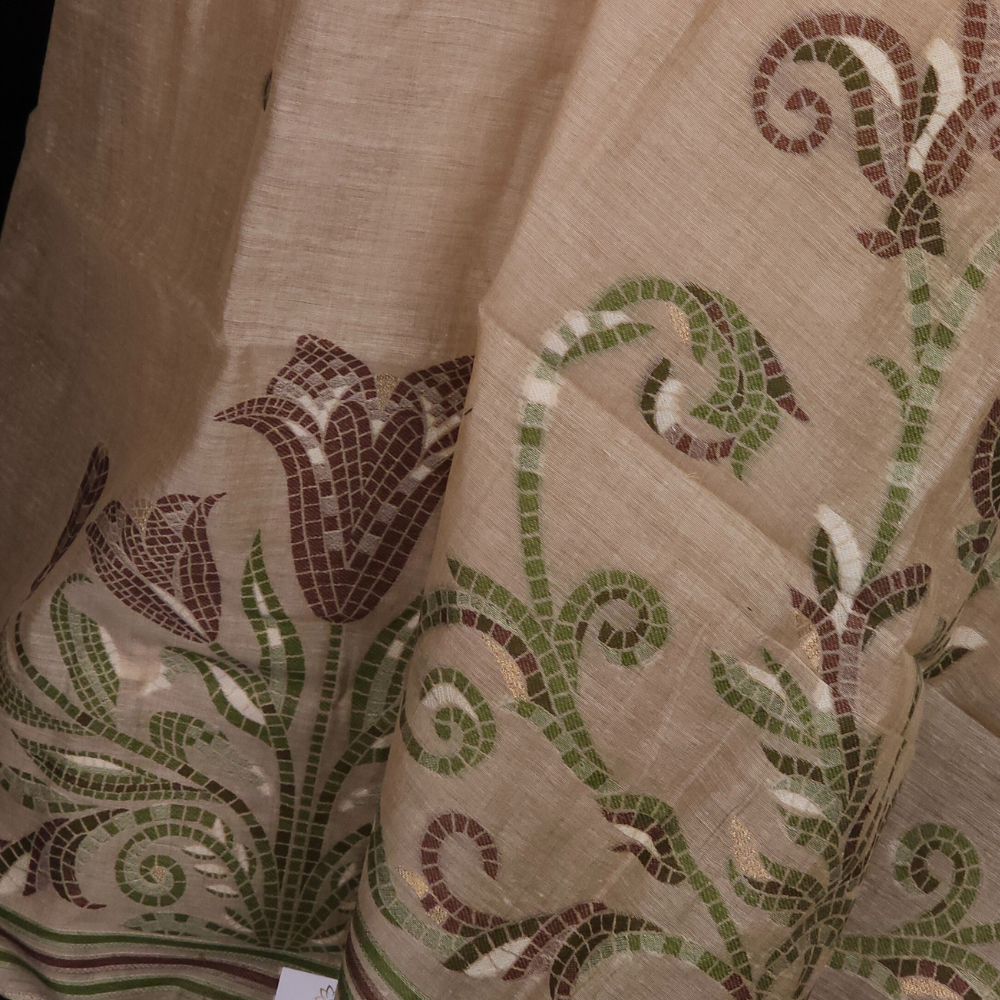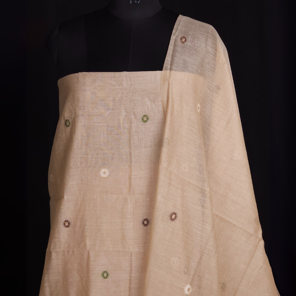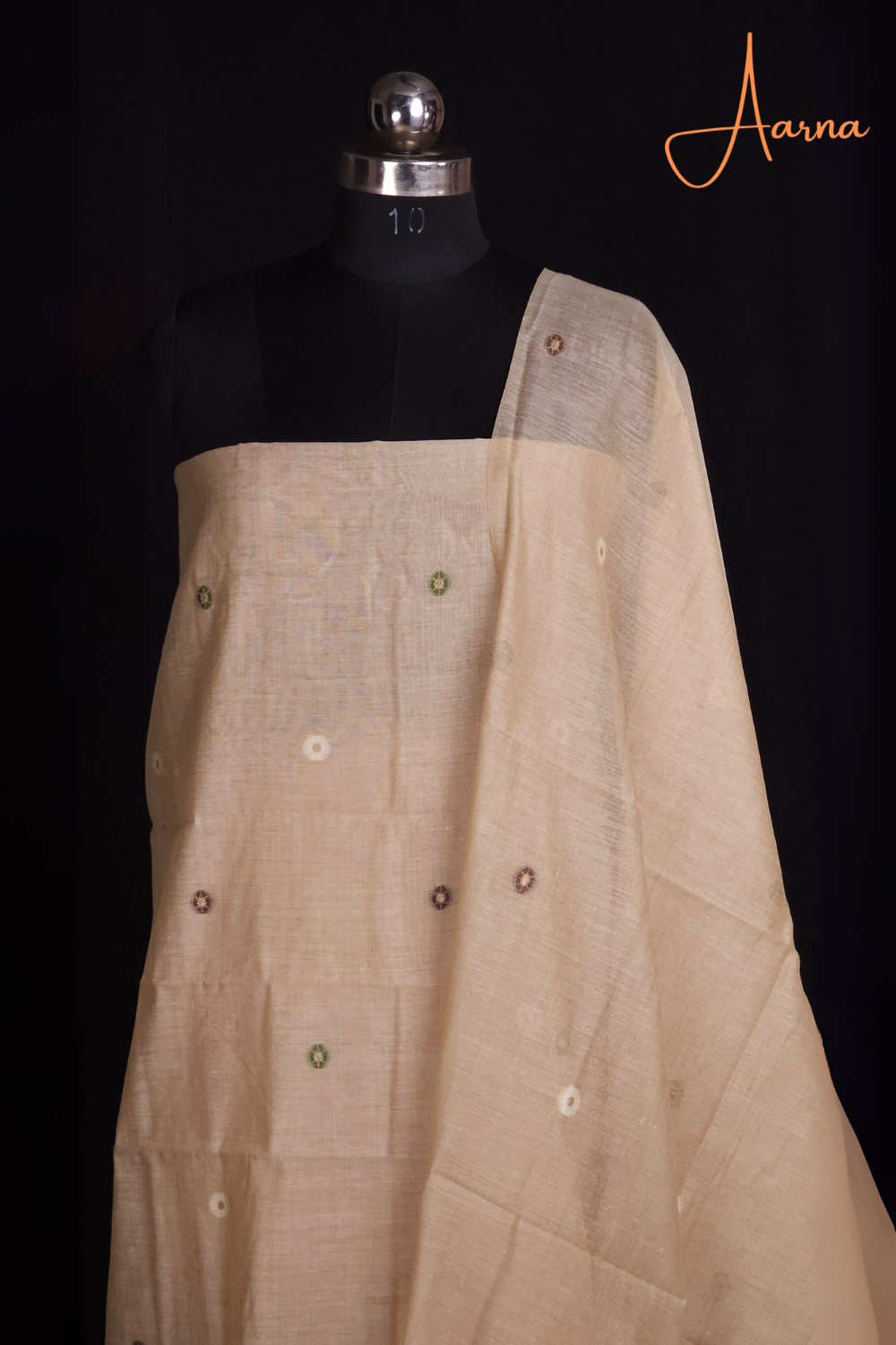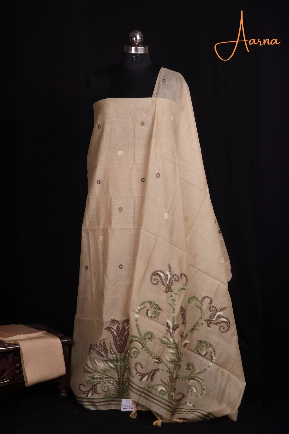 Elegant Chanderi top with allover thread motifs and floral Thread-woven bunches, paired with a plain bottom and a richly woven dupatta paired with tassels.....