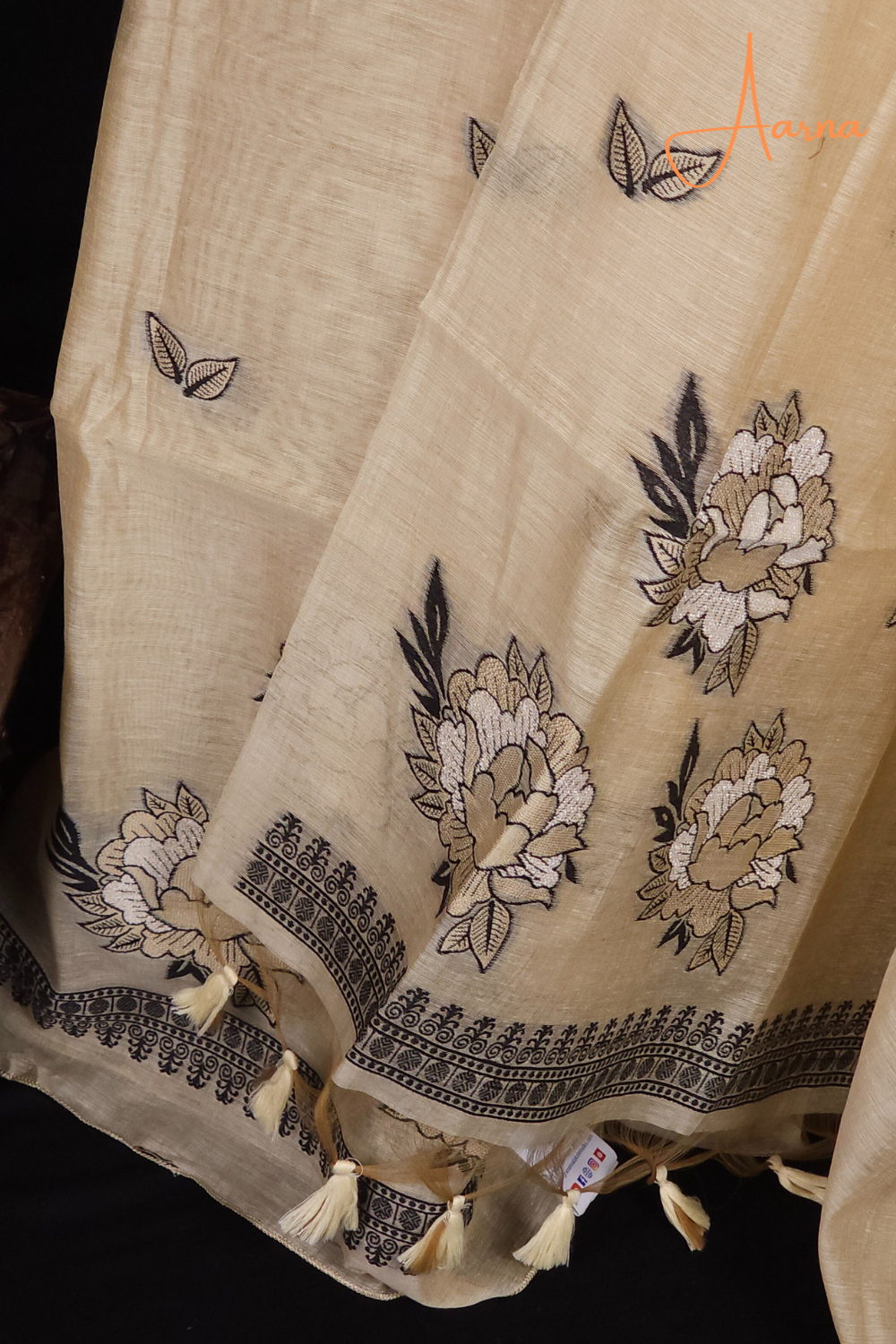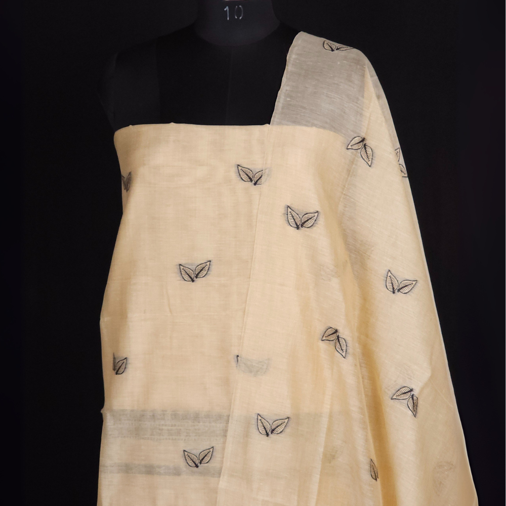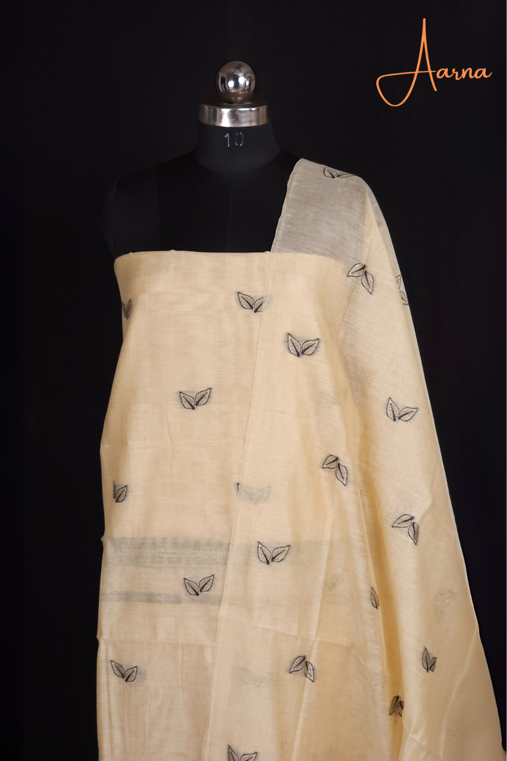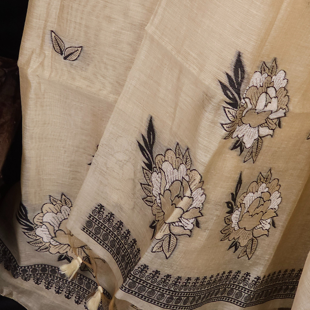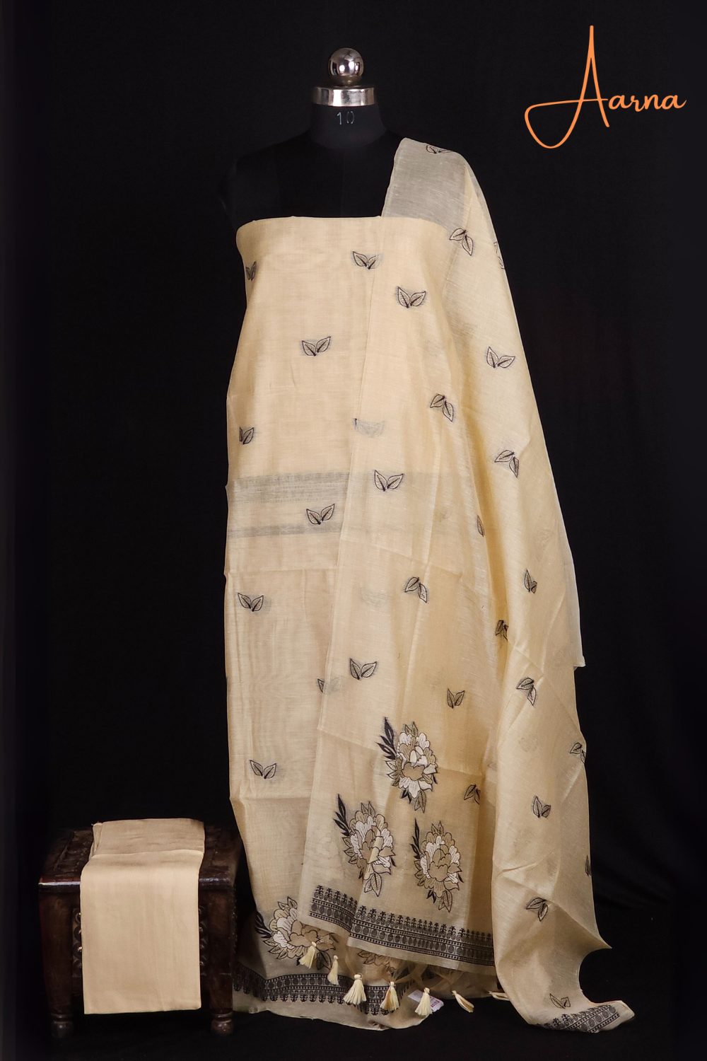 Elegant Chanderi top with allover thread motifs and floral Thread-woven bunches, paired with a plain bottom and a richly woven dupatta paired with tassels.....