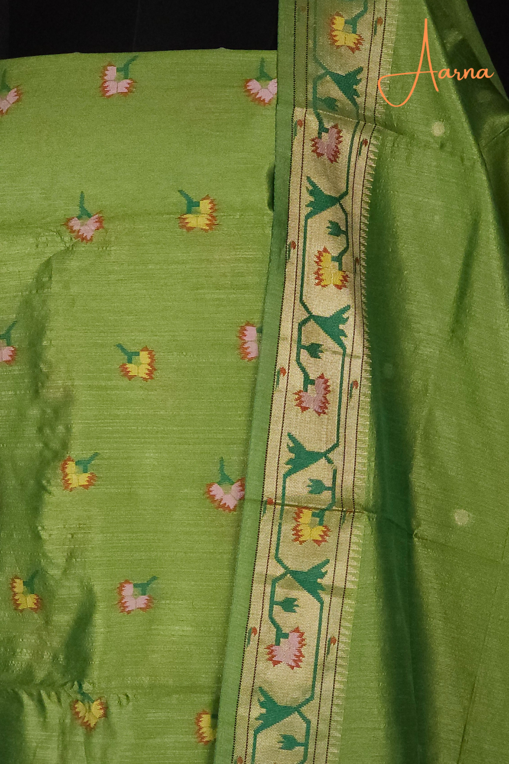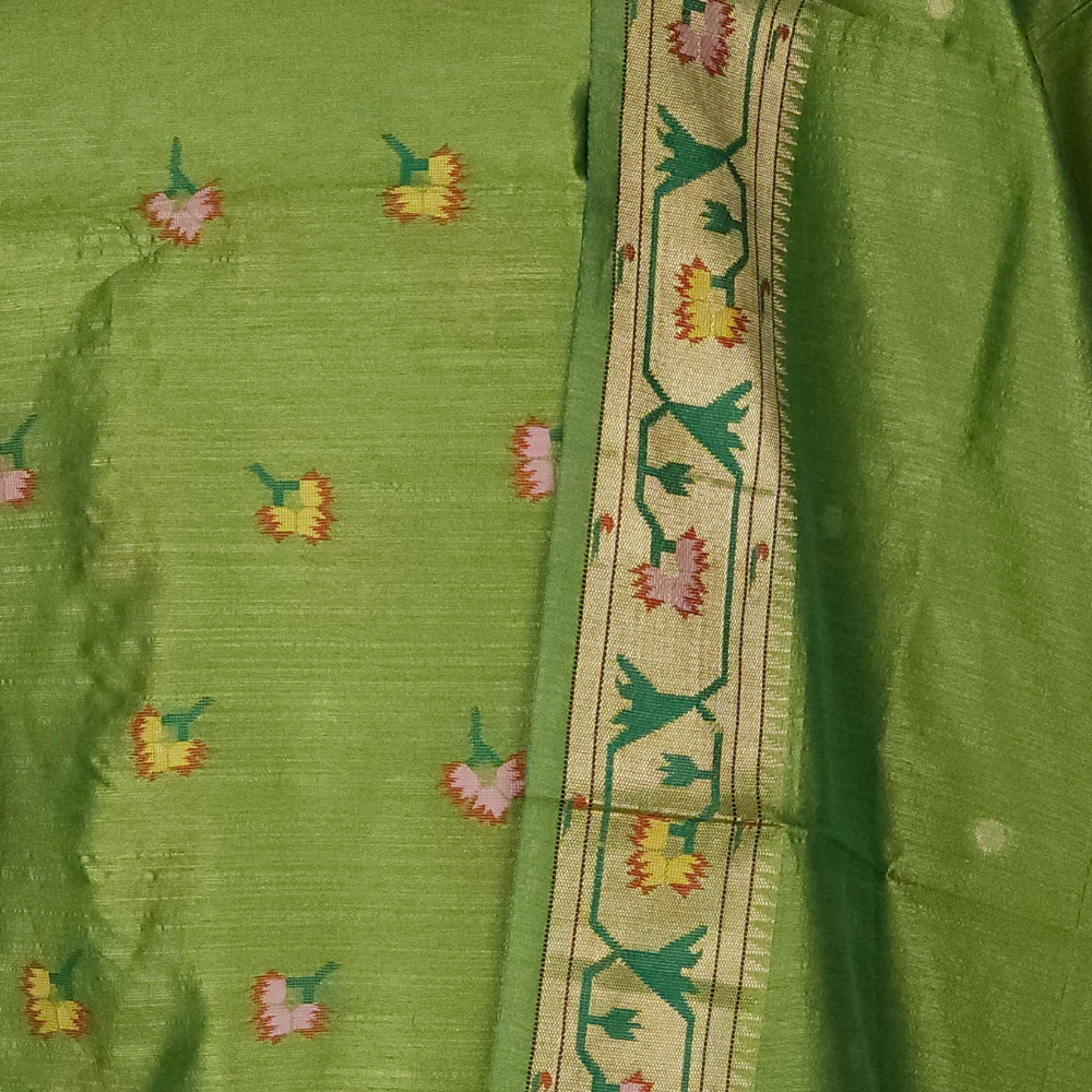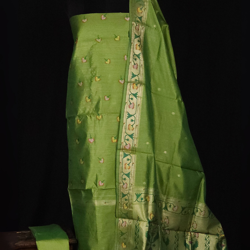 semi tussar Zari motifs detailing, finished with the traditional tissue muniya motifs borders, paired with a running plain bottom and dupatta with motifs, finished with a two-sided rich tissue pallu and tassels.perfect for a rich festive look.