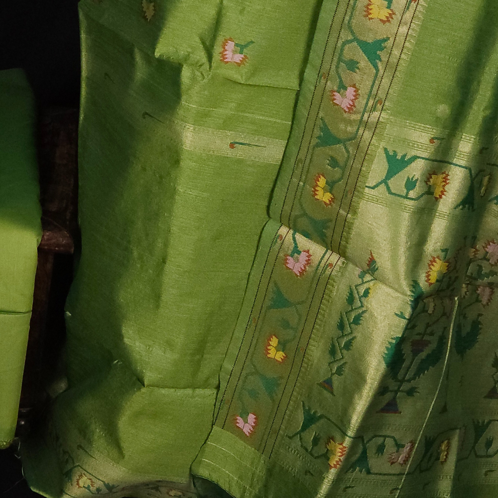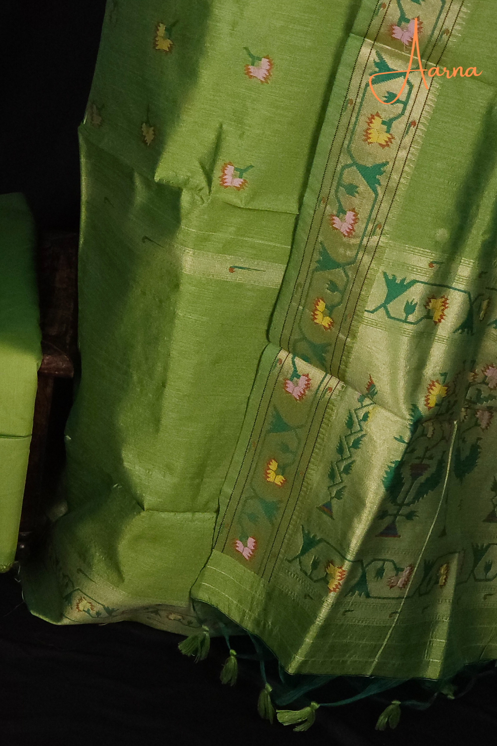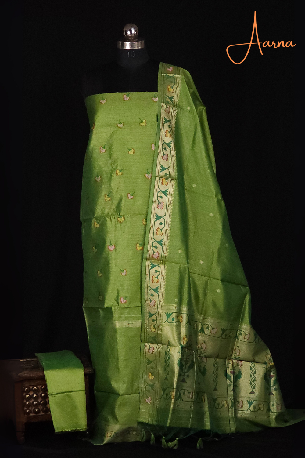 semi tussar Zari motifs detailing, finished with the traditional tissue muniya motifs borders, paired with a running plain bottom and dupatta with motifs, finished with a two-sided rich tissue pallu and tassels.perfect for a rich festive look.