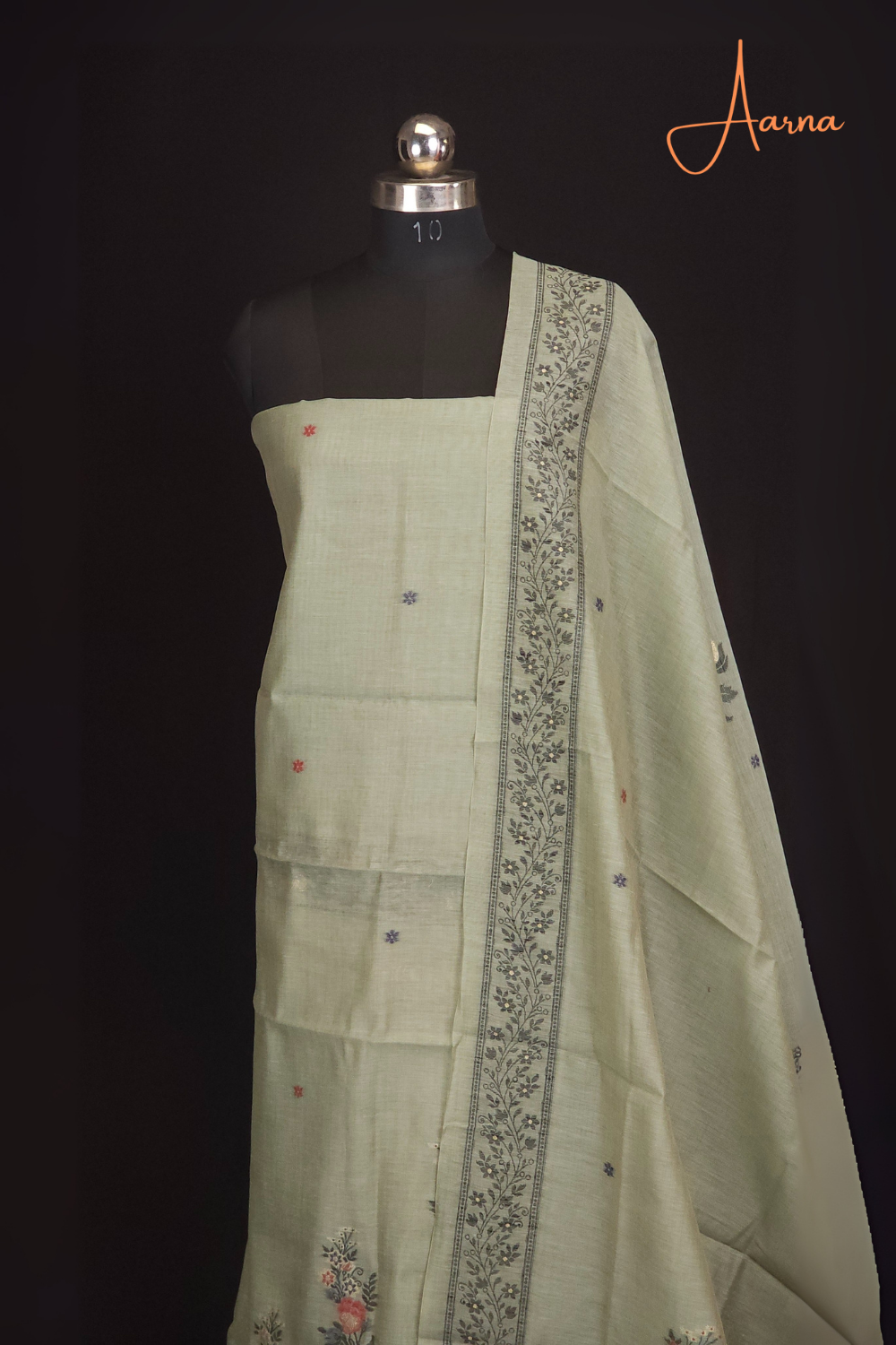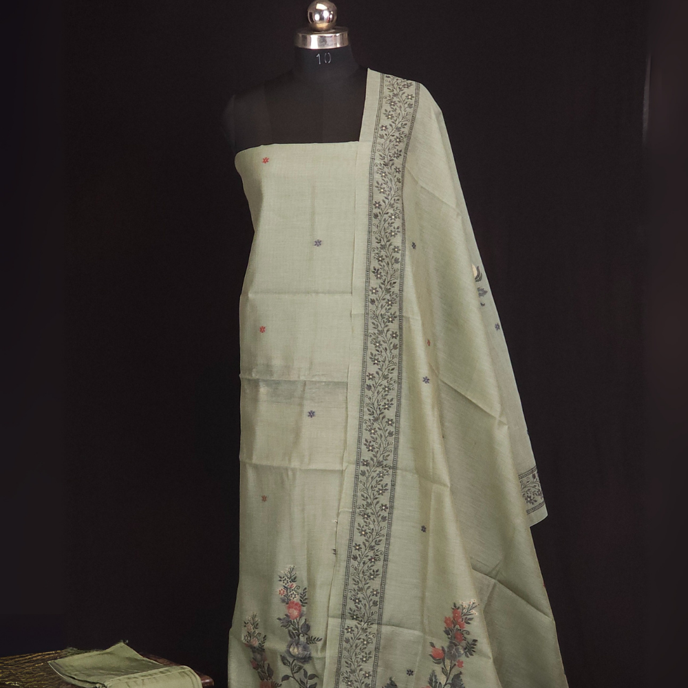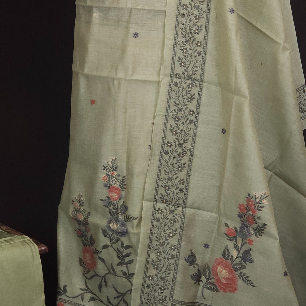 Elegant Chanderi top with allover thread motifs and floral Thread-woven bunches, paired with a plain bottom and a richly woven dupatta paired with tassels.....