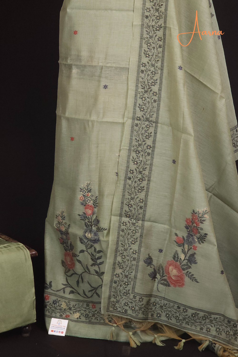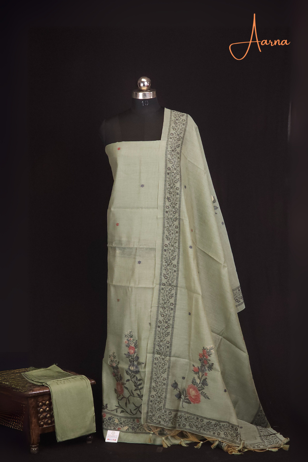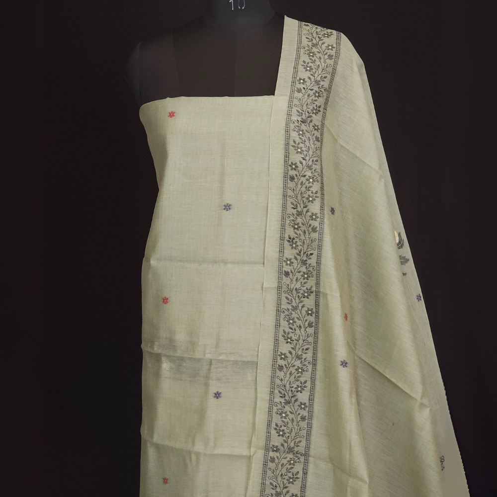 Elegant Chanderi top with allover thread motifs and floral Thread-woven bunches, paired with a plain bottom and a richly woven dupatta paired with tassels.....