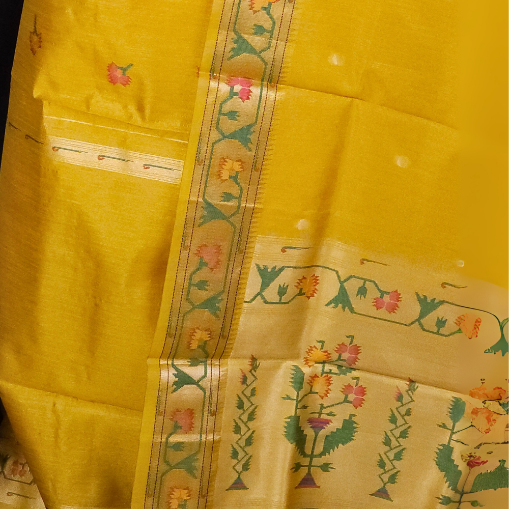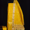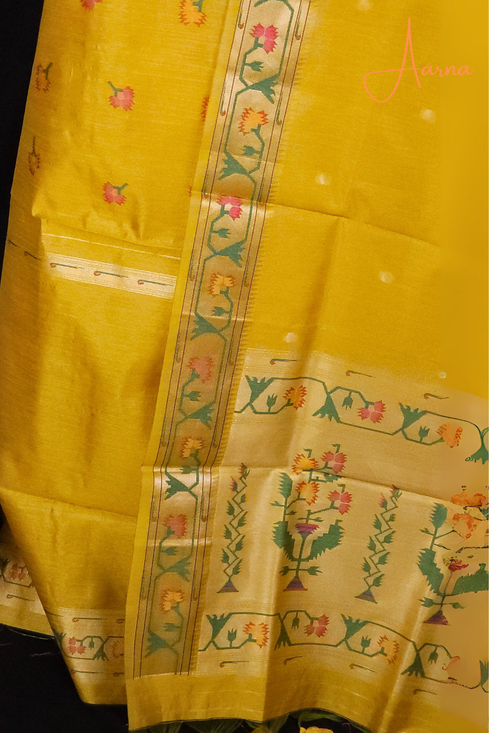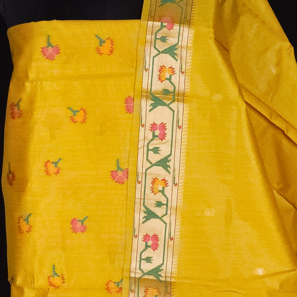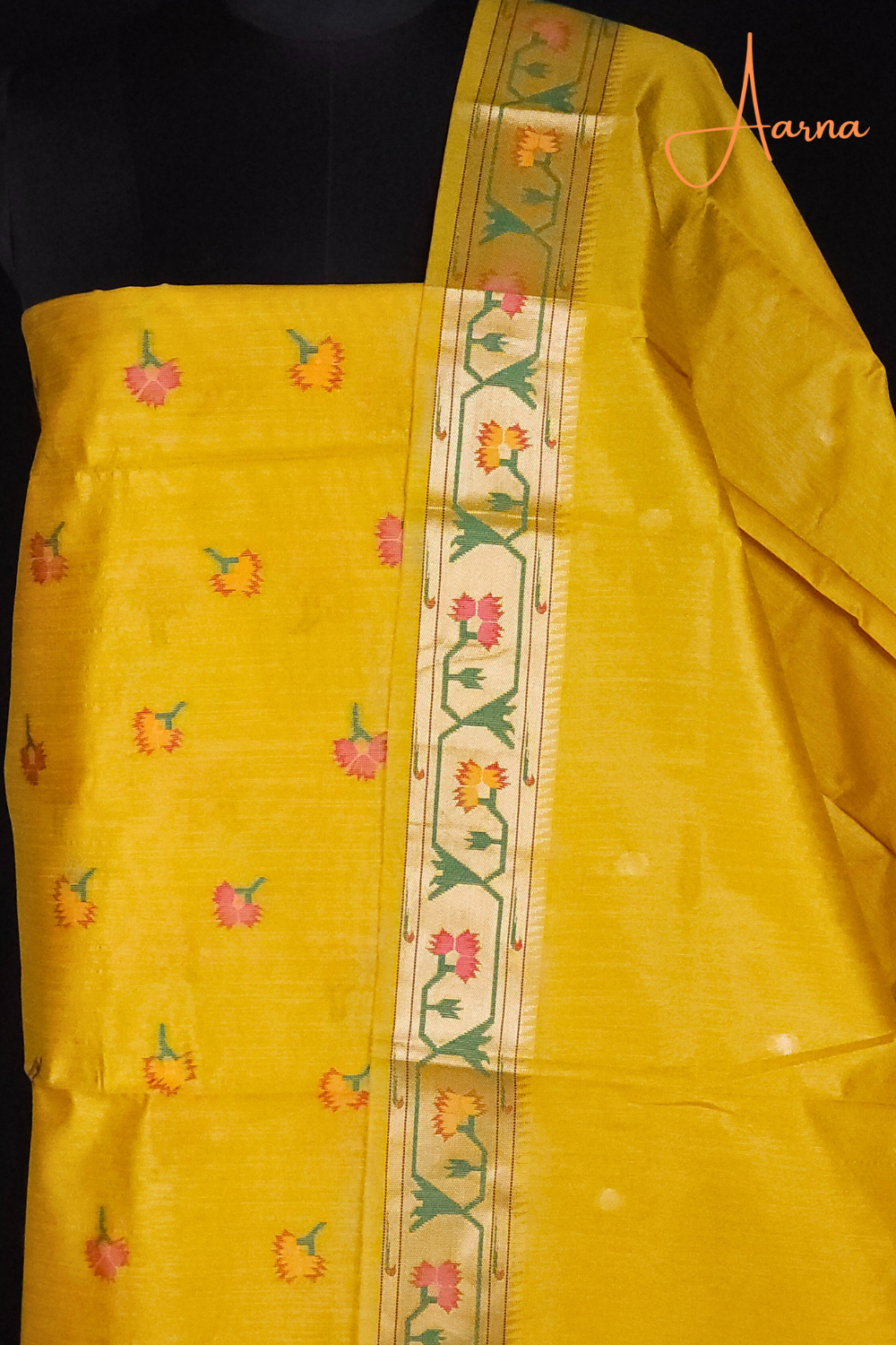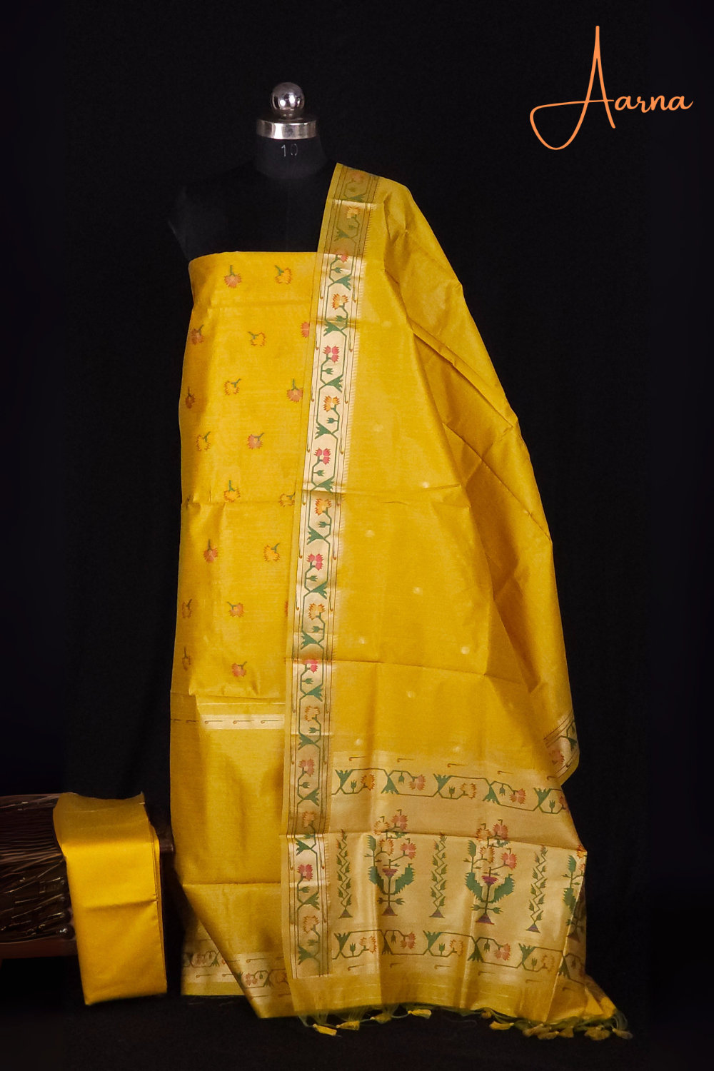 semi tussar Zari motifs detailing, finished with the traditional tissue muniya motifs borders, paired with a running plain bottom and dupatta with motifs, finished with a two-sided rich tissue pallu and tassels.perfect for a rich festive look.