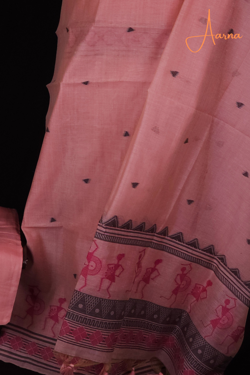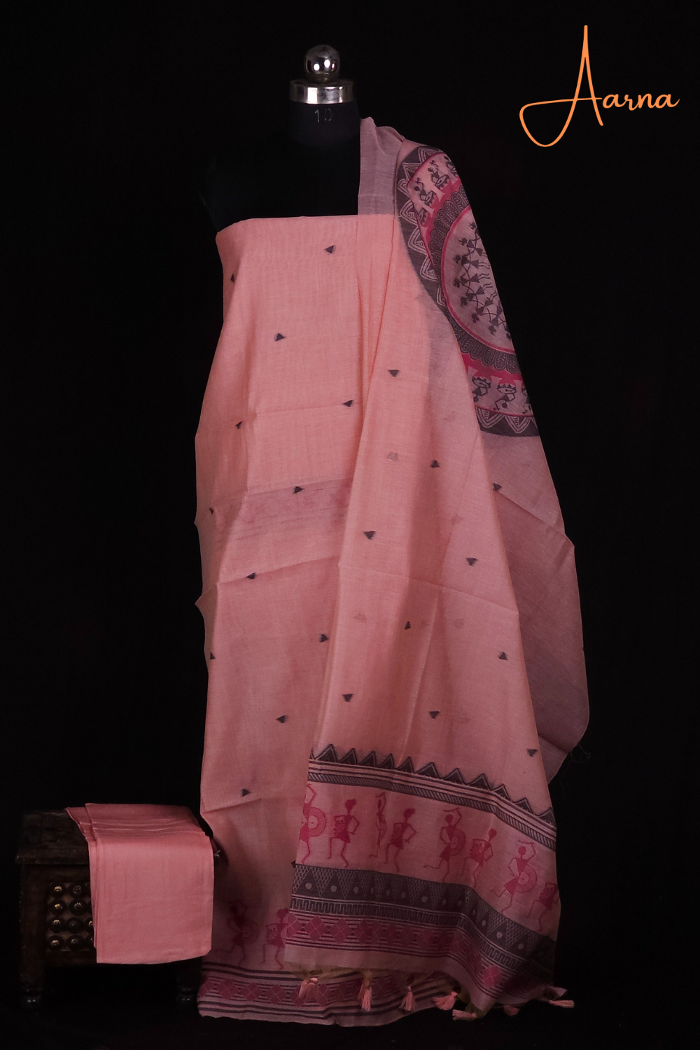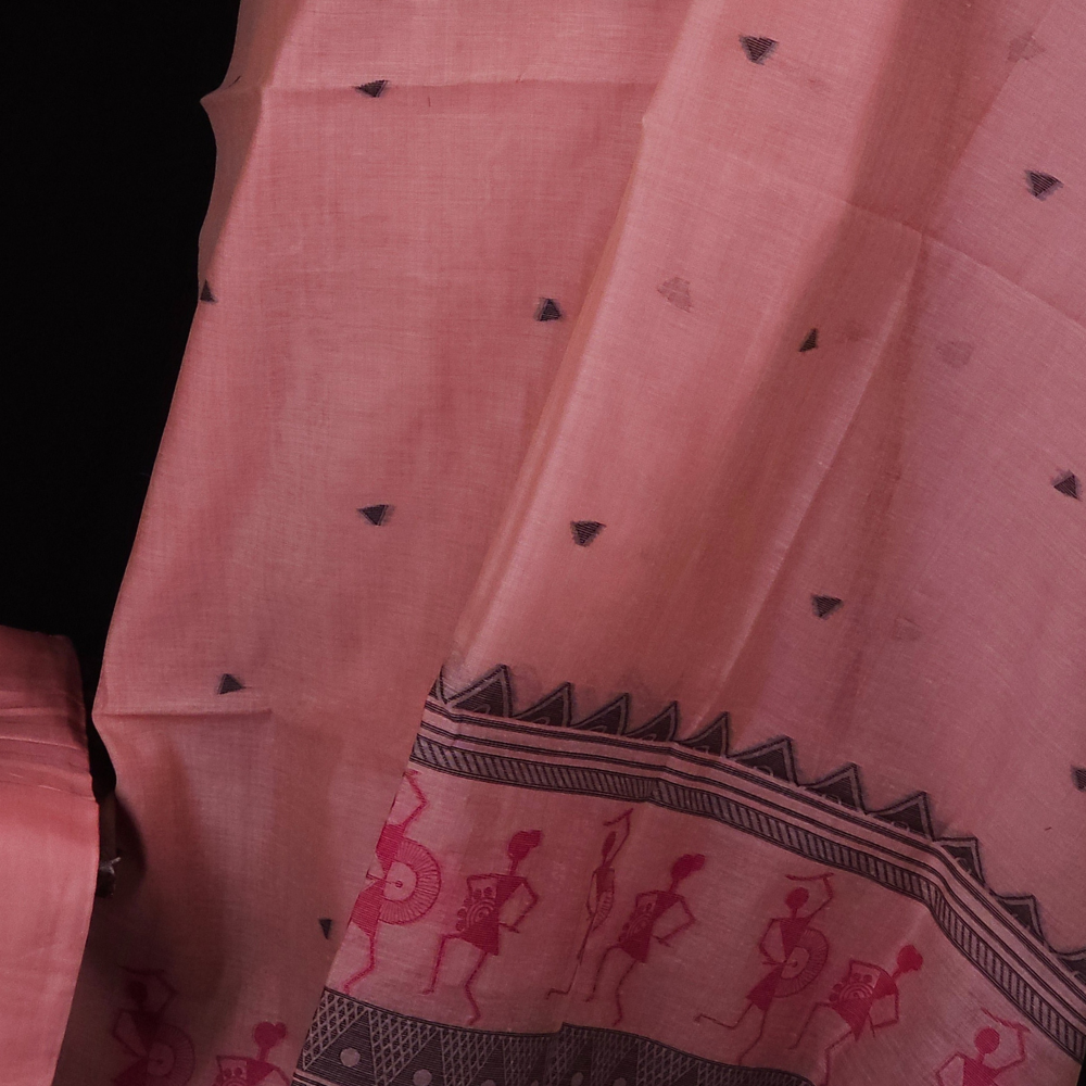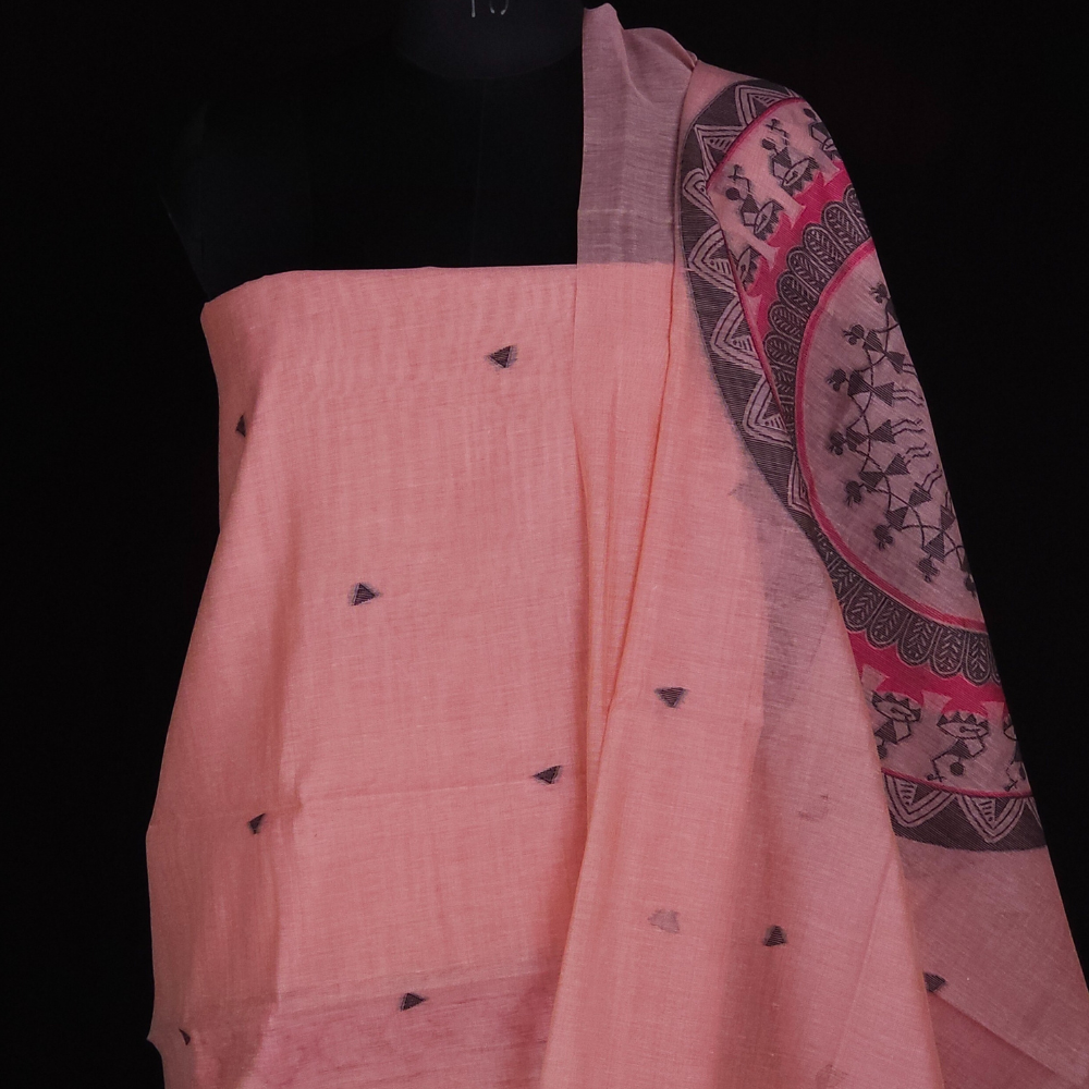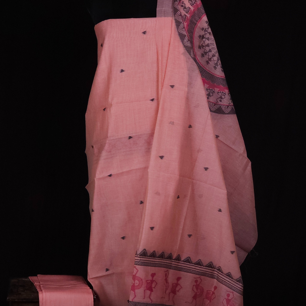 Elegant Chanderi with unique warli artistic pattern featuring floral and triangle designs, styled beautifully.Paired with a dupatta and a bottom for a bold, contemporary look