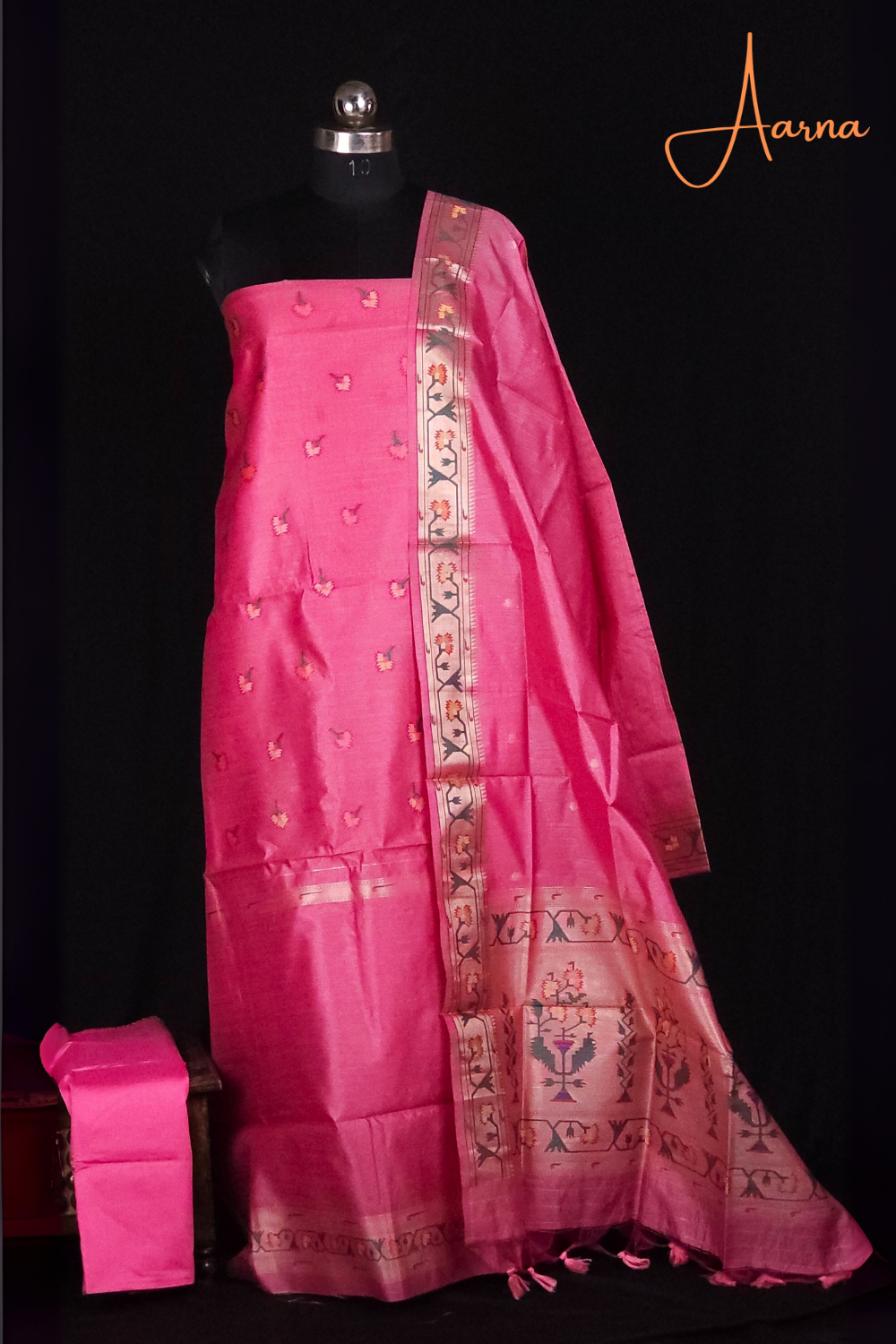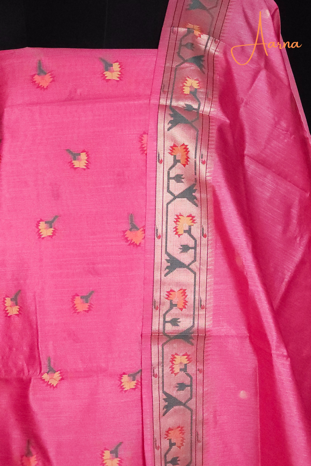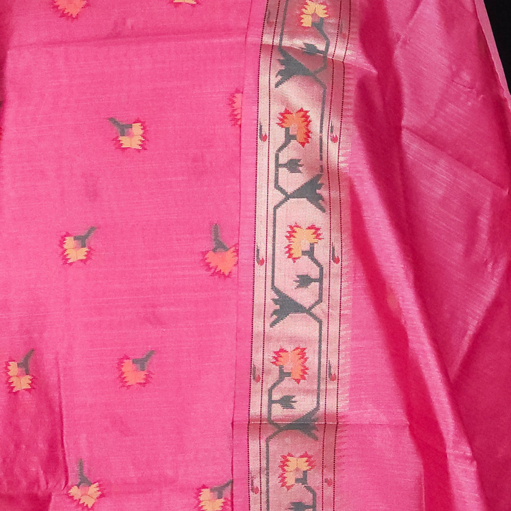 semi tussar Zari motifs detailing, finished with the traditional tissue muniya motifs borders, paired with a running plain bottom and dupatta with motifs, finished with a two-sided rich tissue pallu and tassels.perfect for a rich festive look.