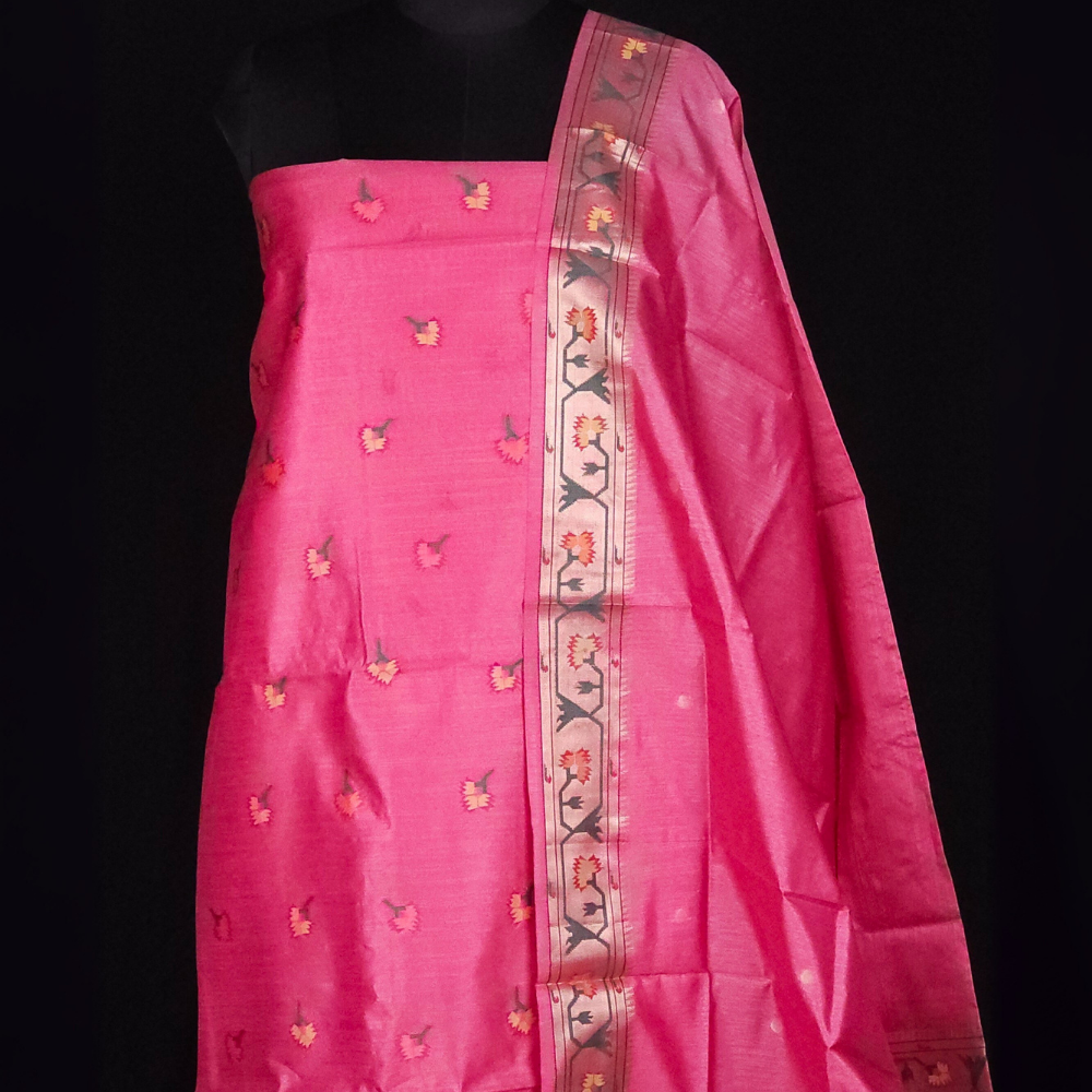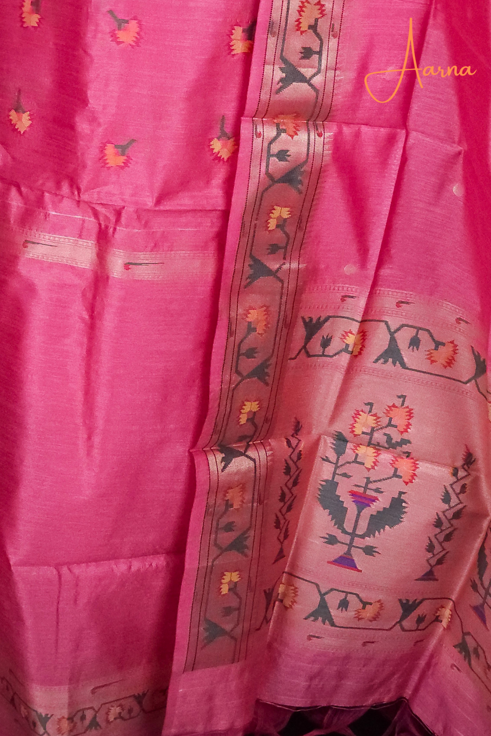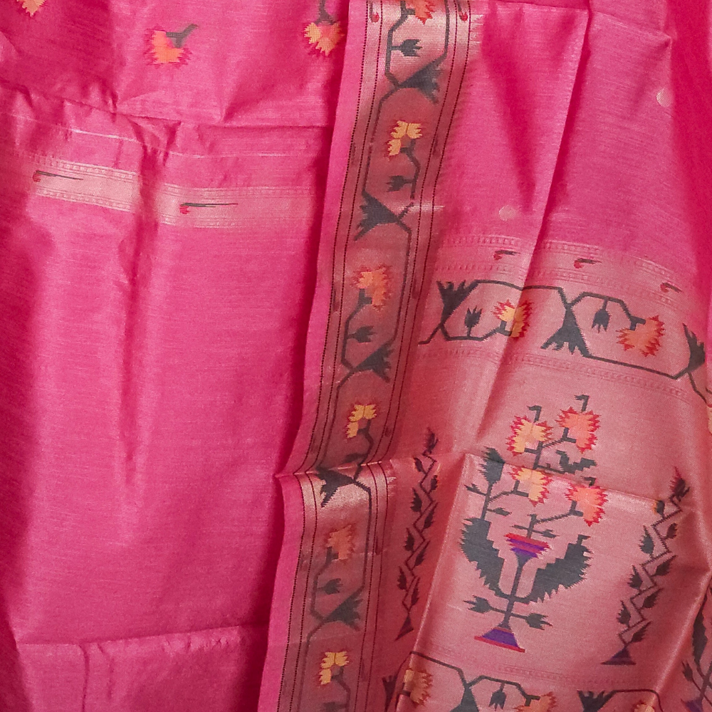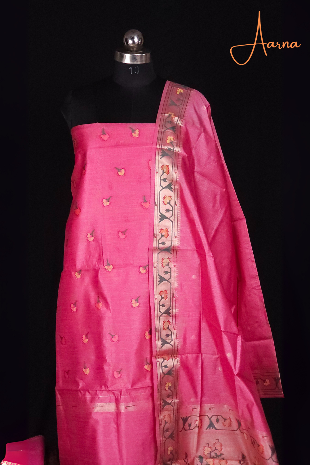semi tussar Zari motifs detailing, finished with the traditional tissue muniya motifs borders, paired with a running plain bottom and dupatta with motifs, finished with a two-sided rich tissue pallu and tassels.perfect for a rich festive look.