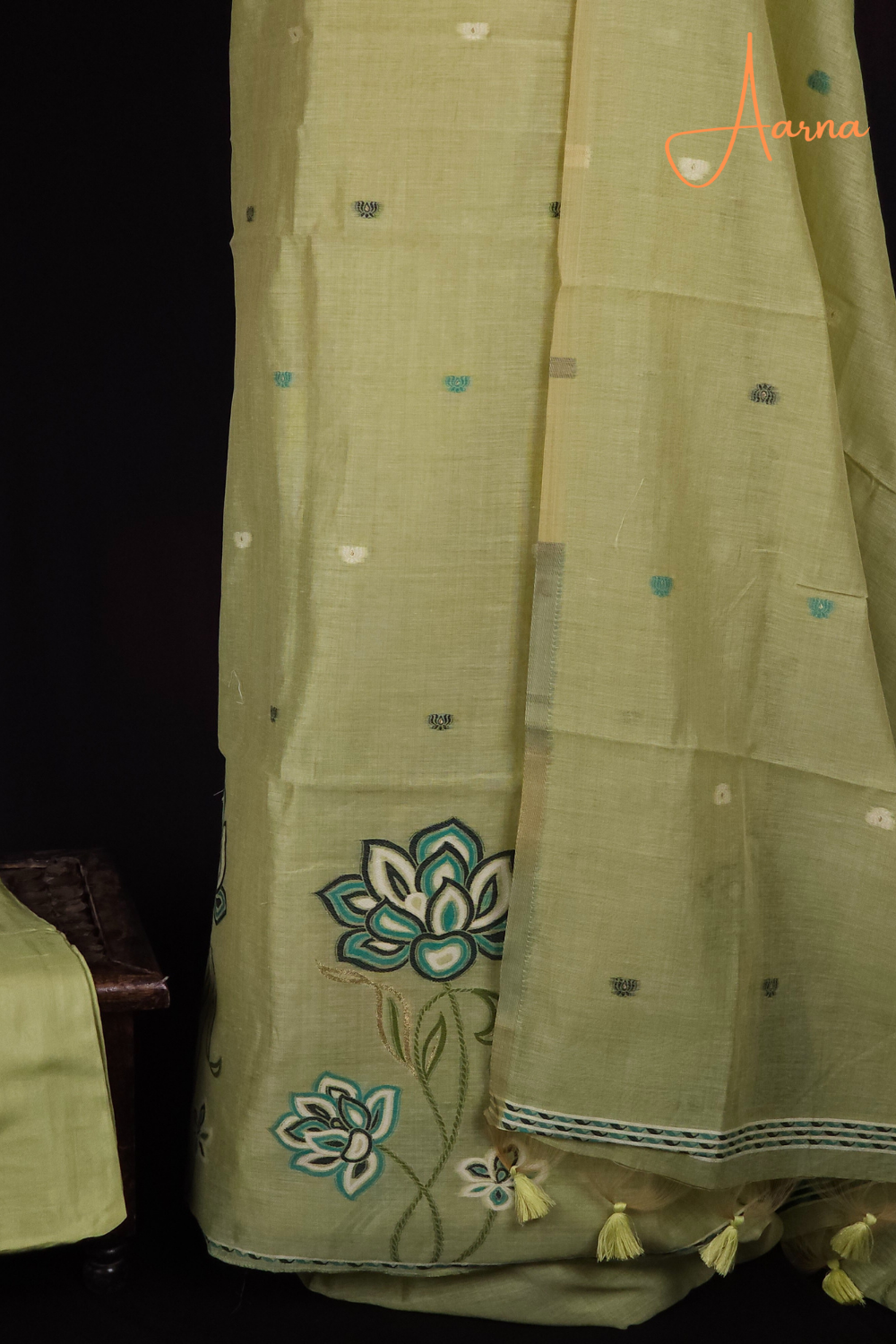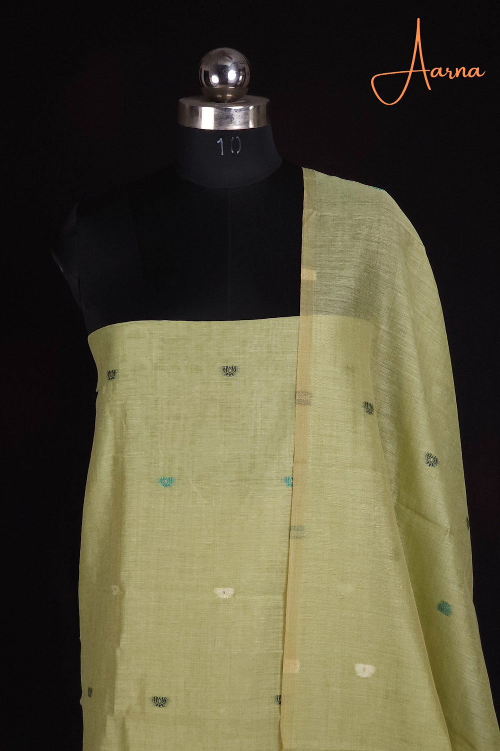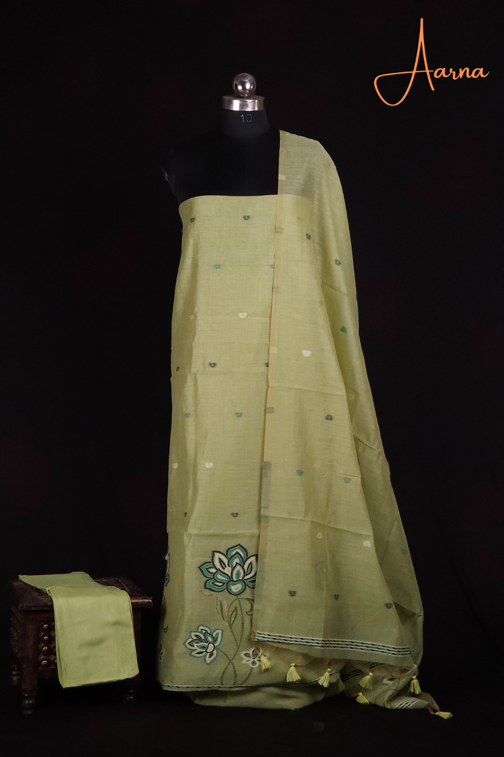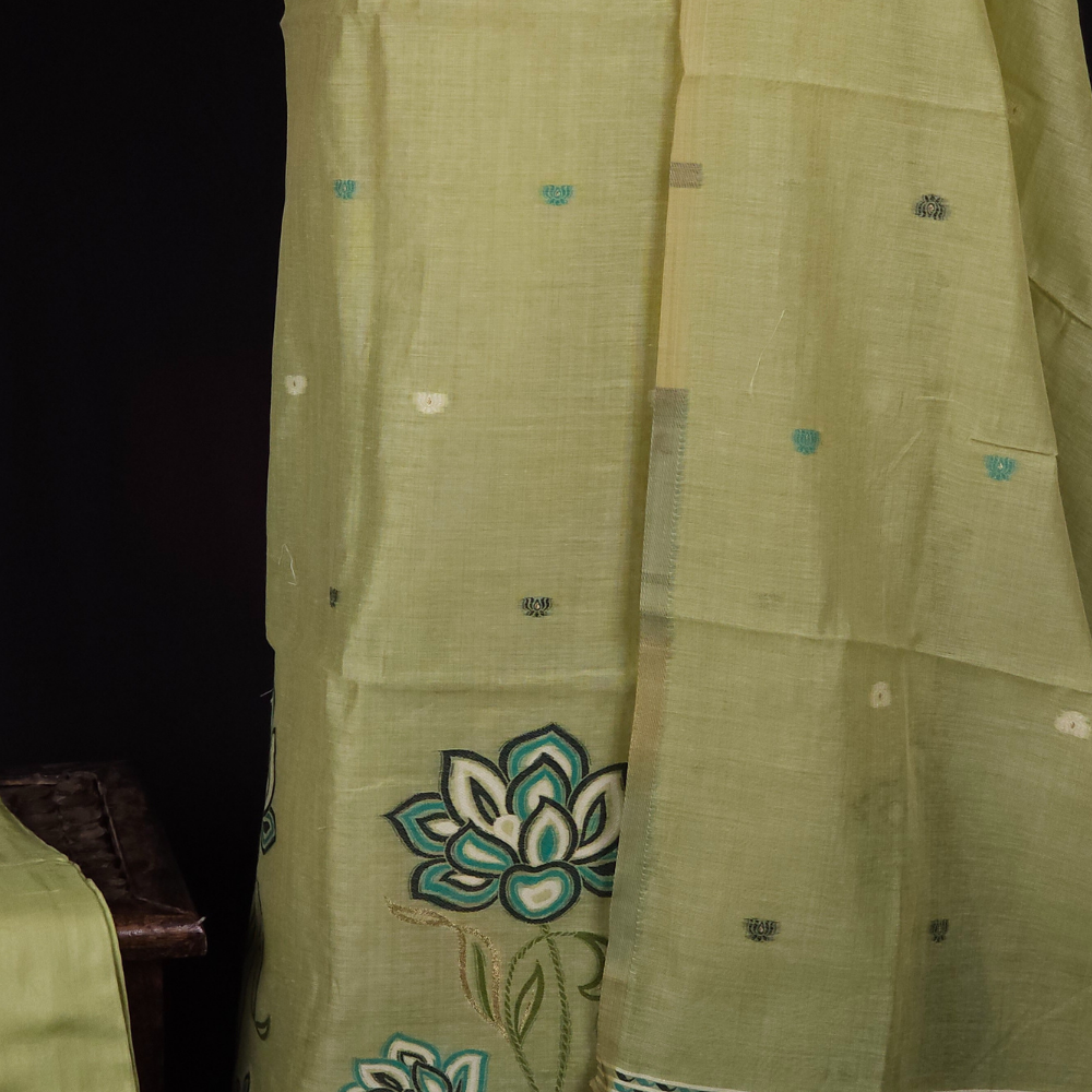 Elegant Chanderi top cute lotus motifs across the top designed lotus bunches below the top .Finished with a rich thread -woven dupatta paired with a plain bottom .....