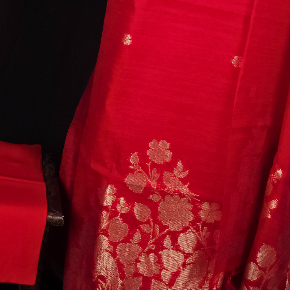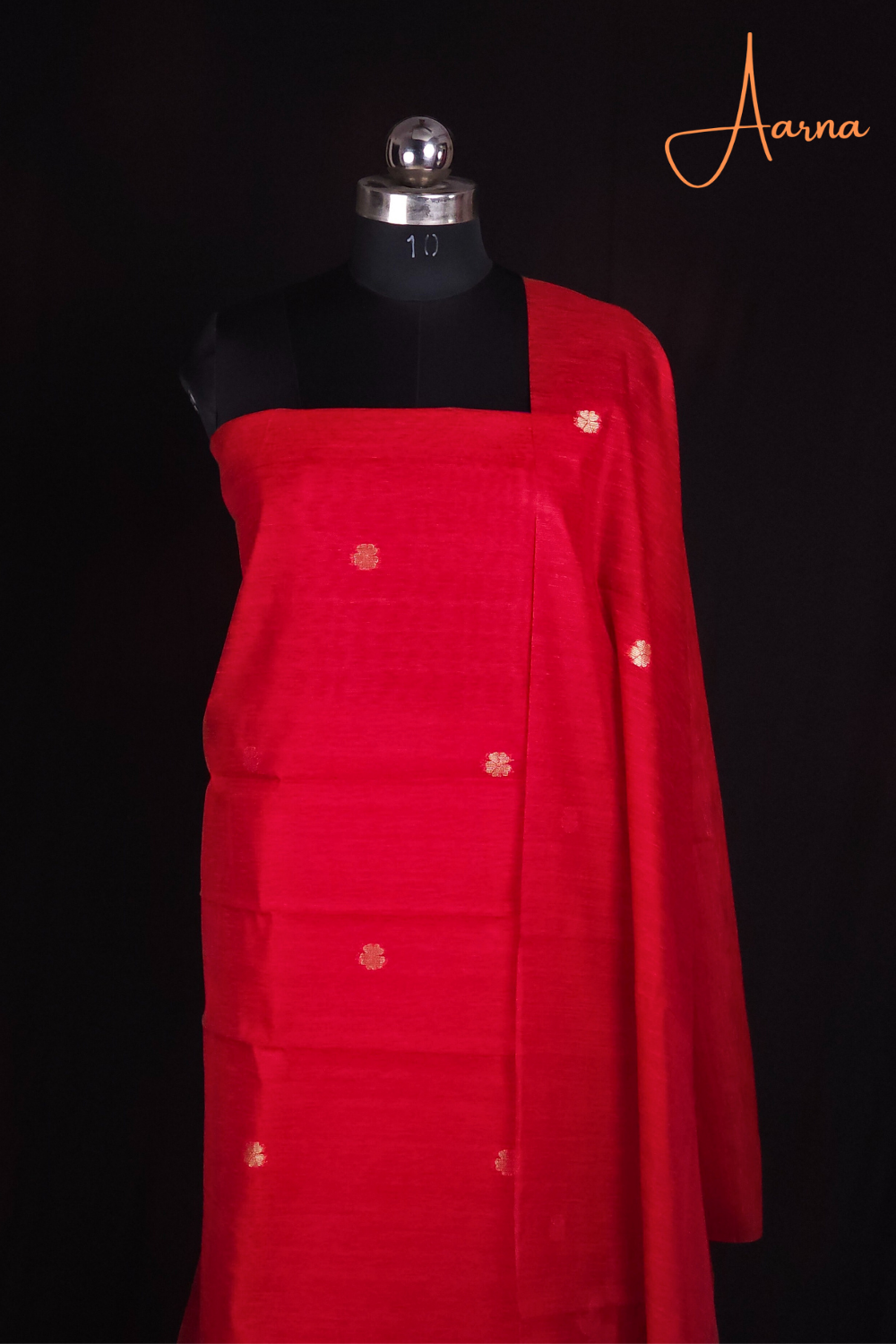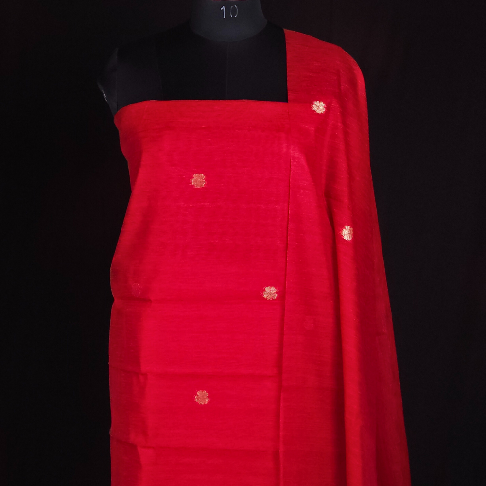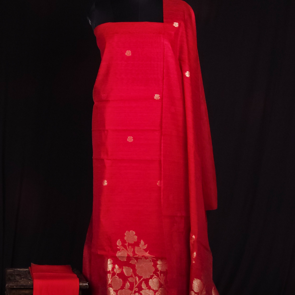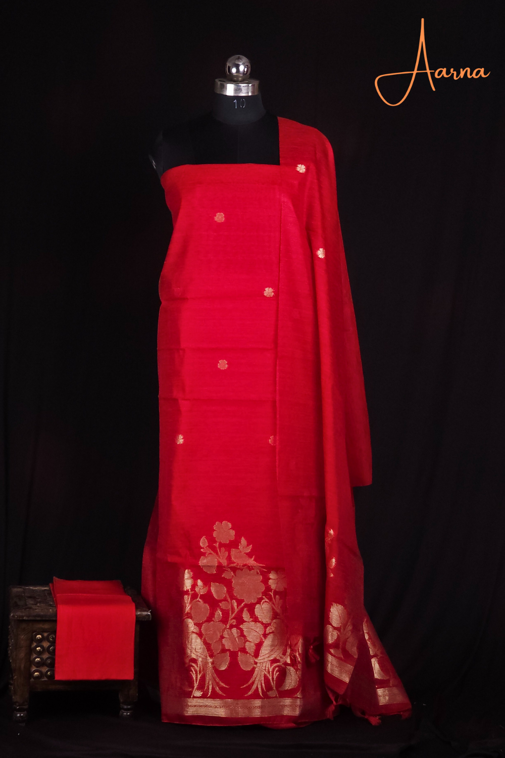 Experience the elegance of our Chanderi Dupion dress material allover zari motifs with gold zari woven borders , rich dupatta and a bottom.....