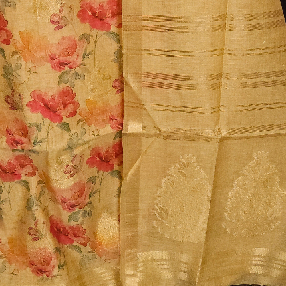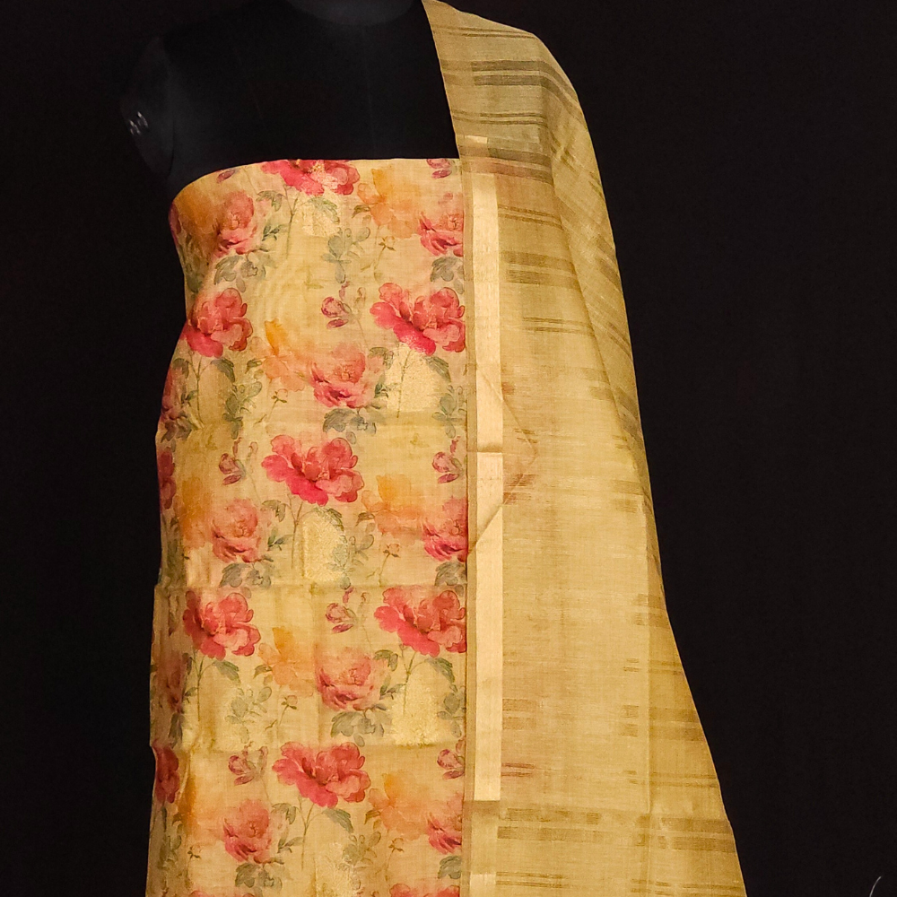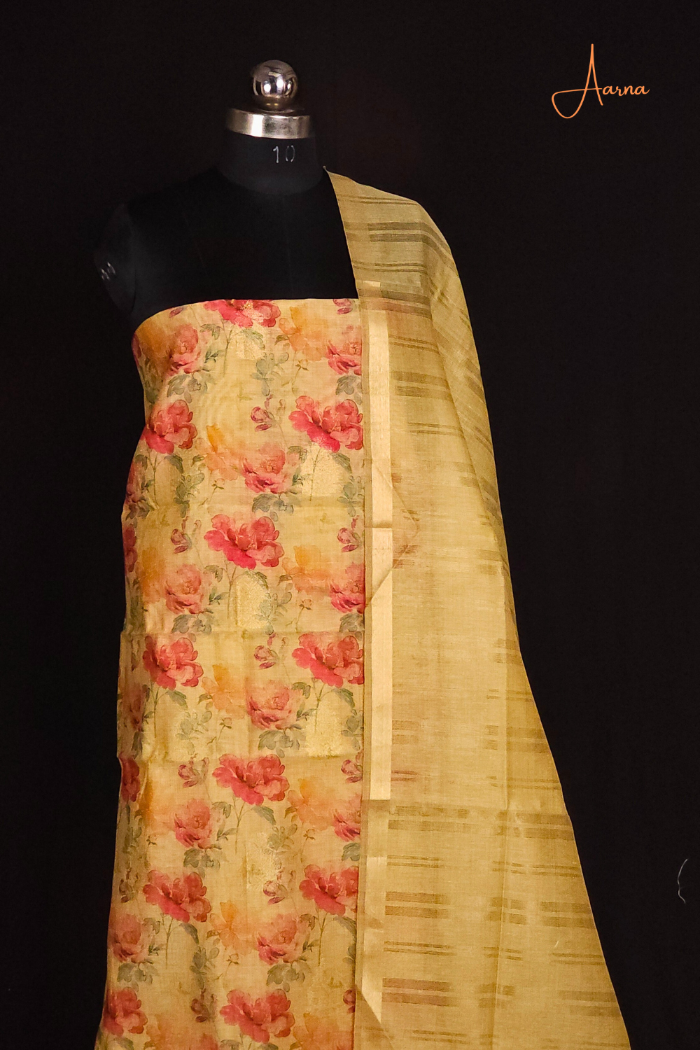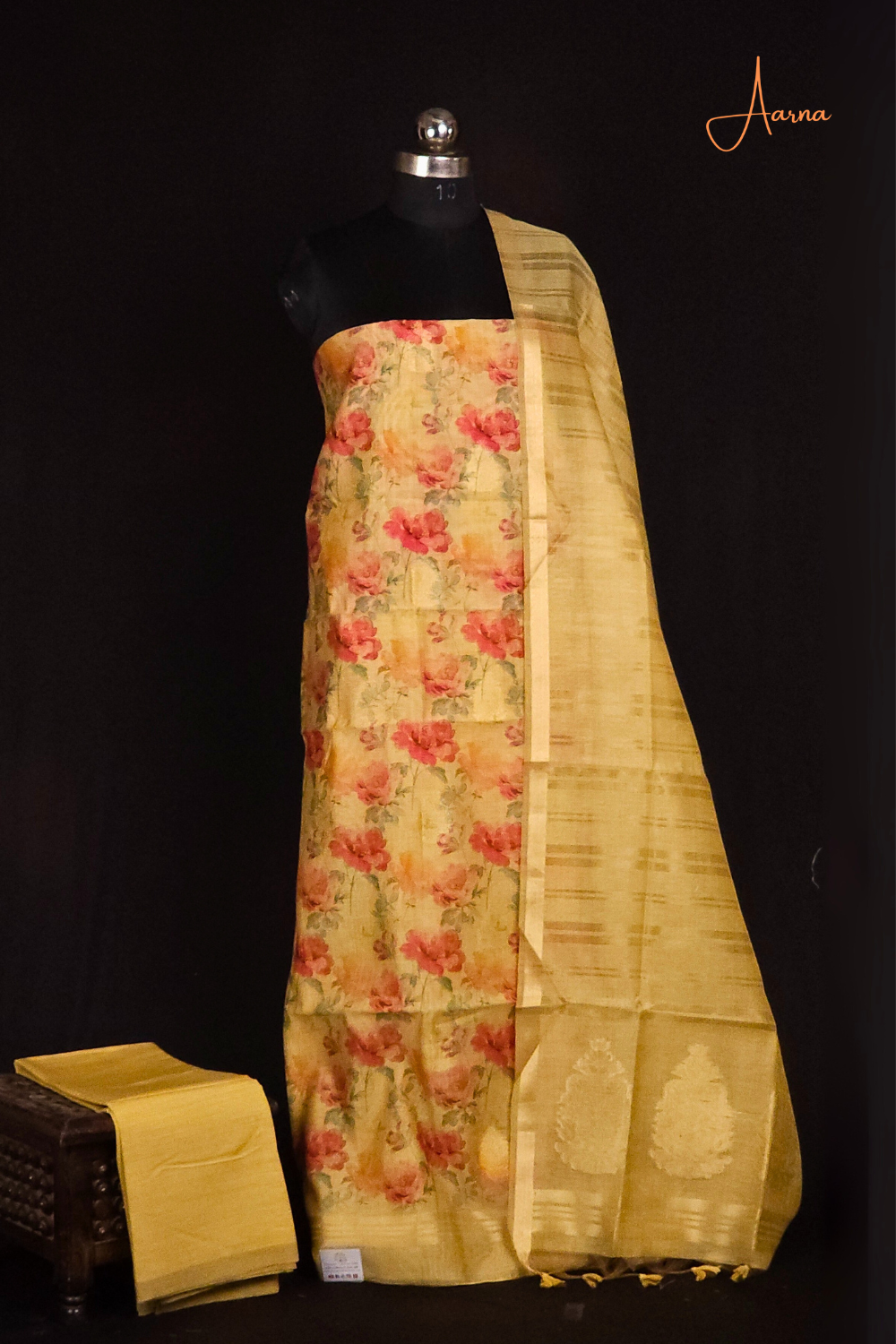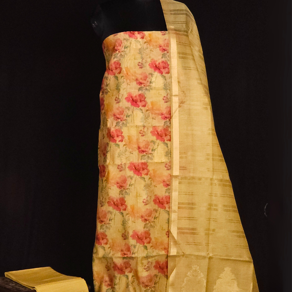 Elevate your ethnic wardrobe with our elegant Chanderi top, featuring allover floral digital prints beautifully complemented by zari-woven motifs., paired with a plain bottom and a richly woven dupatta paired with tassels.....