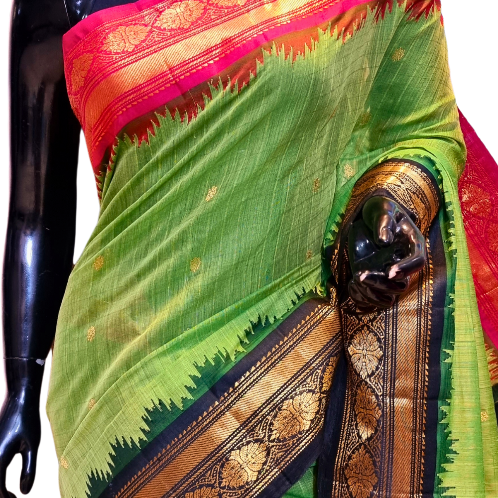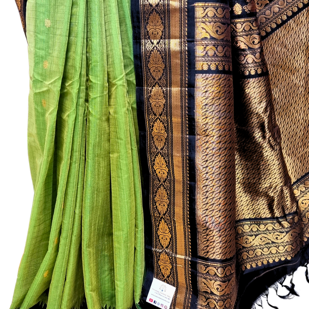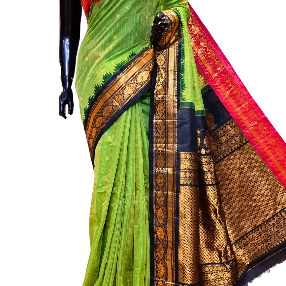 Experience the beauty of traditional Indian craftsmanship with our Handloom Gadwal Silk Cotton Saree, allover zari buttis with Exquisite zari woven borders traditional rich zari brocade pallu paired with blouse