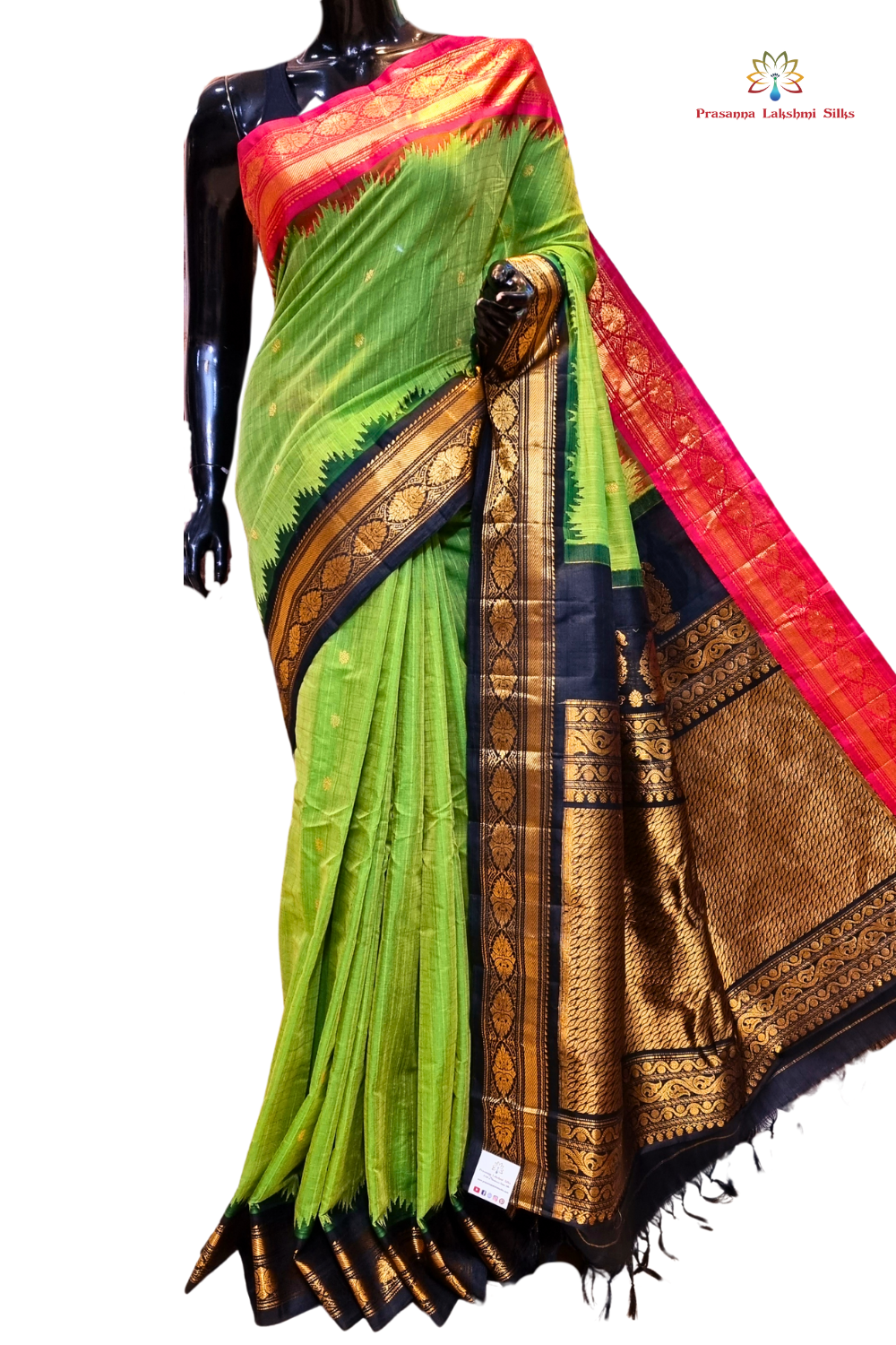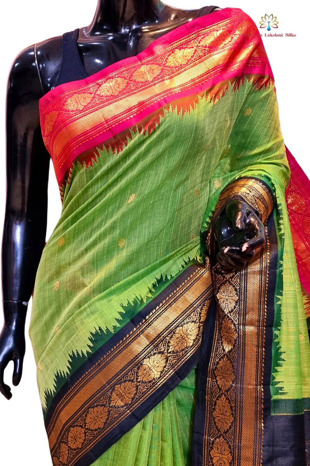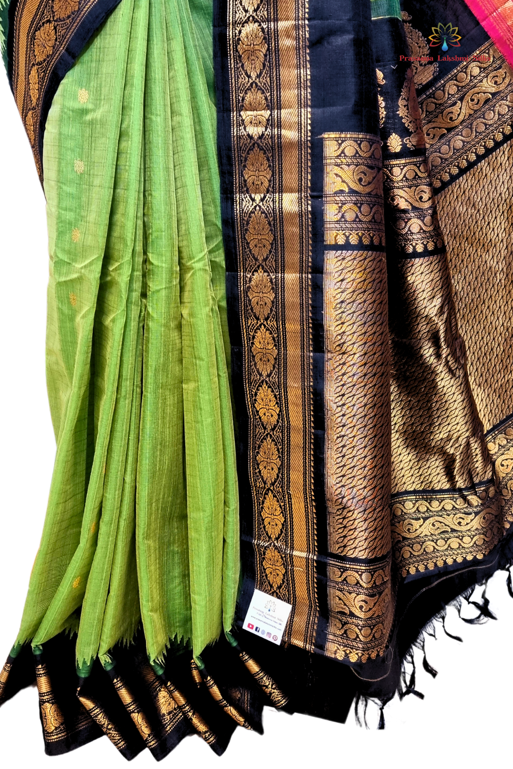 Experience the beauty of traditional Indian craftsmanship with our Handloom Gadwal Silk Cotton Saree, allover zari buttis with Exquisite zari woven borders traditional rich zari brocade pallu paired with blouse