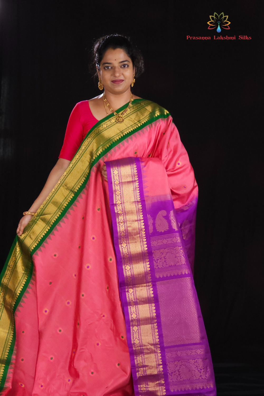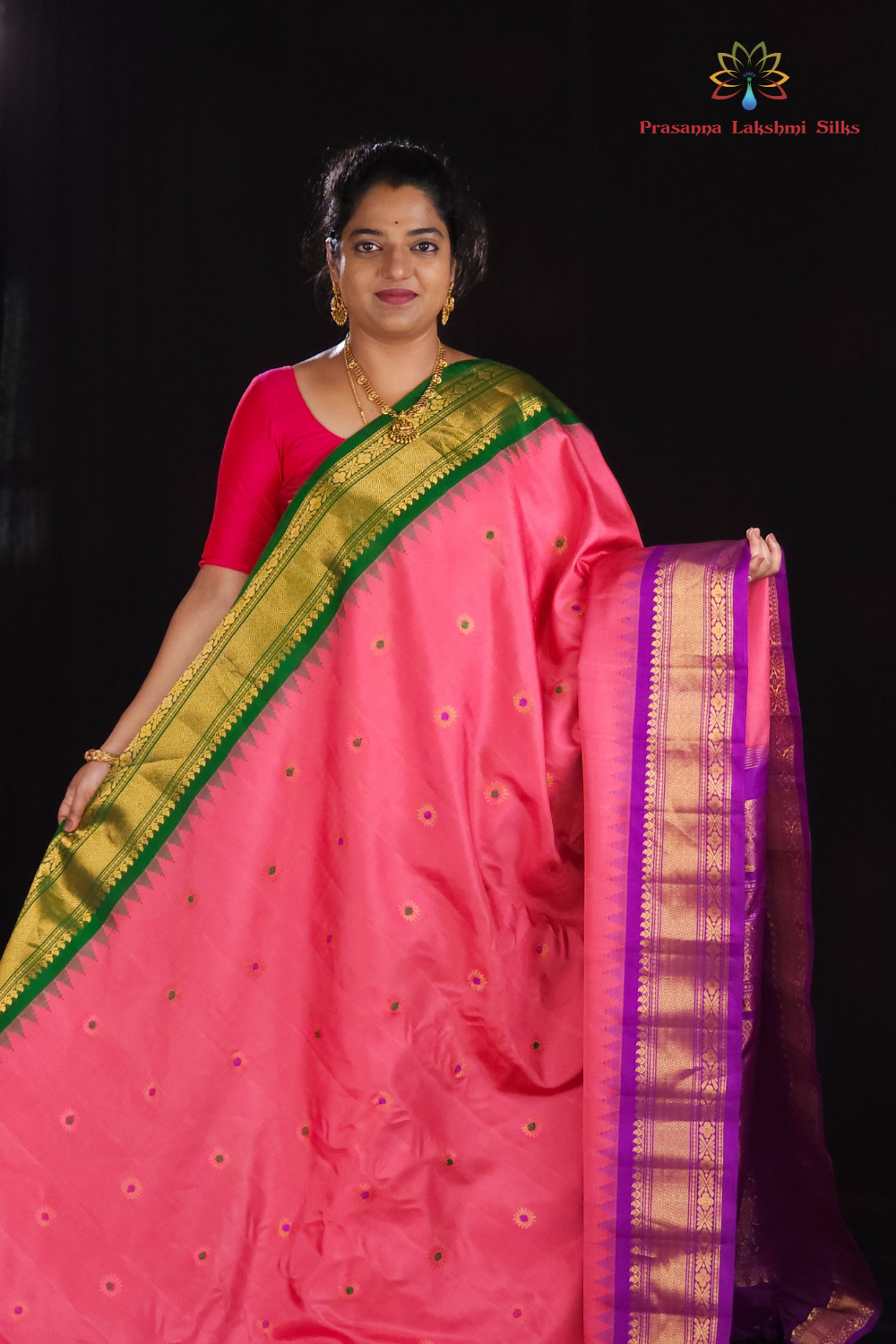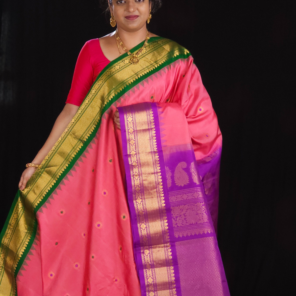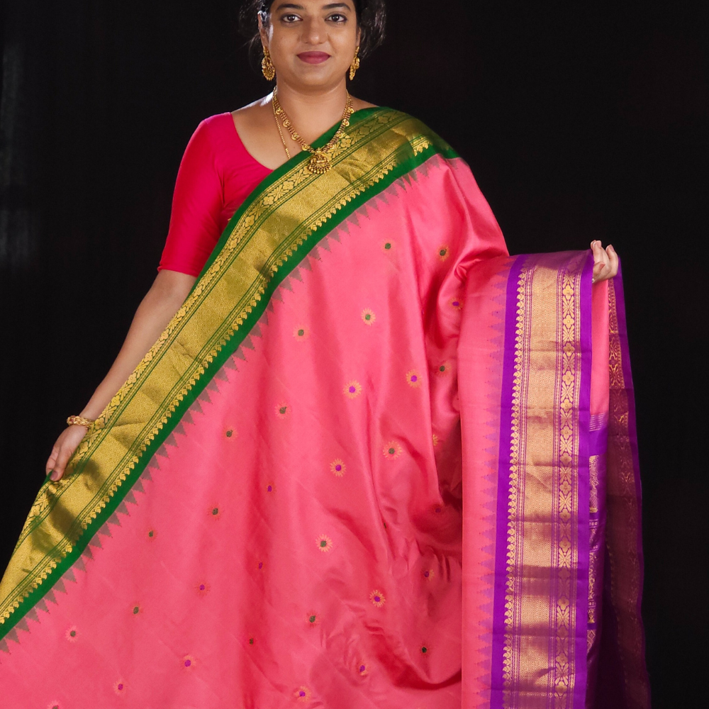 Elevate your elegance with our exquisite Handloom Gadwal Pure Silk Saree, adorned with Intricate zari motifs zari-woven borders Rich zari-woven brocade adorns the pallu, making every drape a statement.