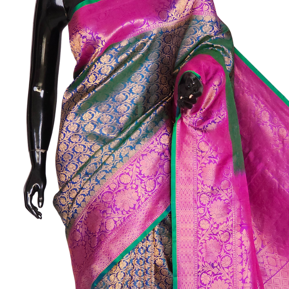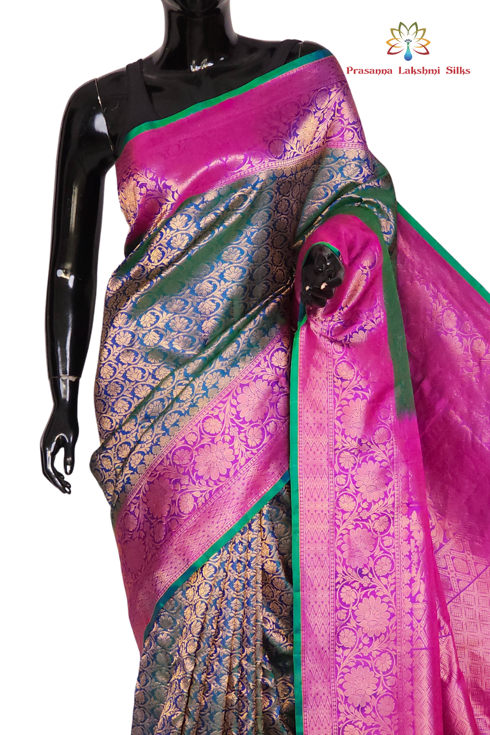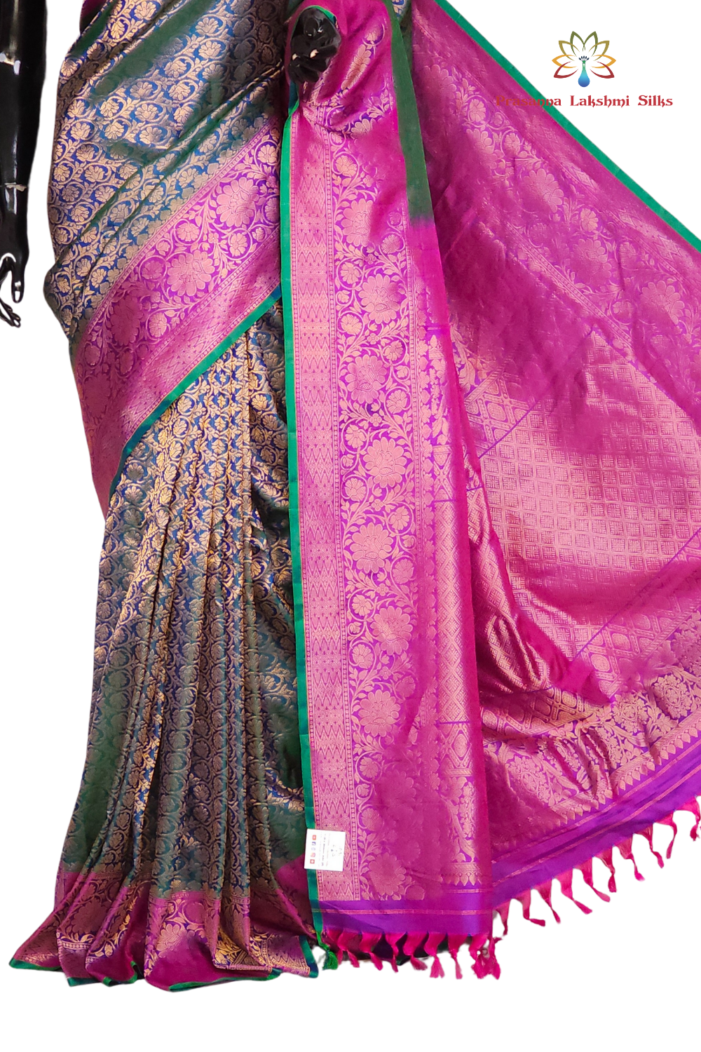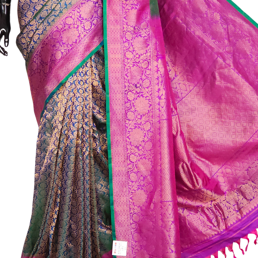 Experience the epitome of Telugu tradition with this exquisite Pure Handloom Gadwal Silk Saree.All-over intricate zari brocade design with turning borders Rich pallu adorned with intricate zari work. This masterpiece weaves together elegance and royalty, perfect for special occasions.