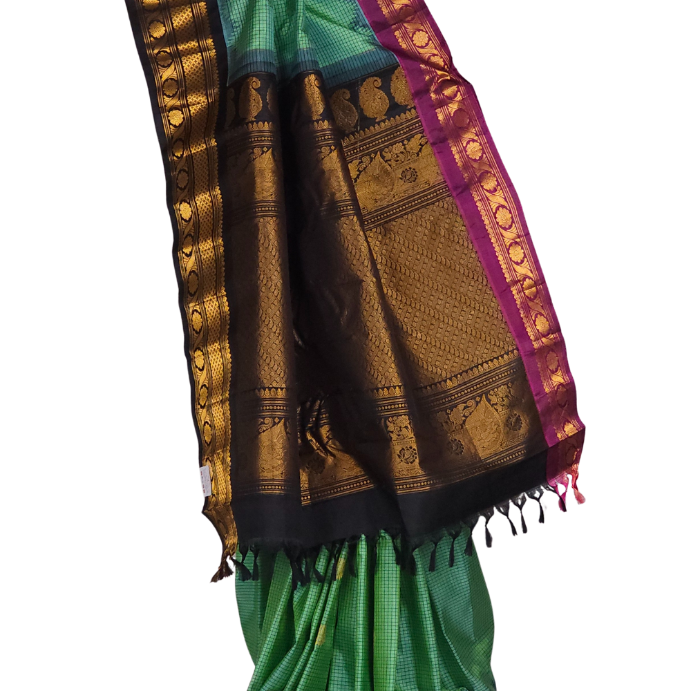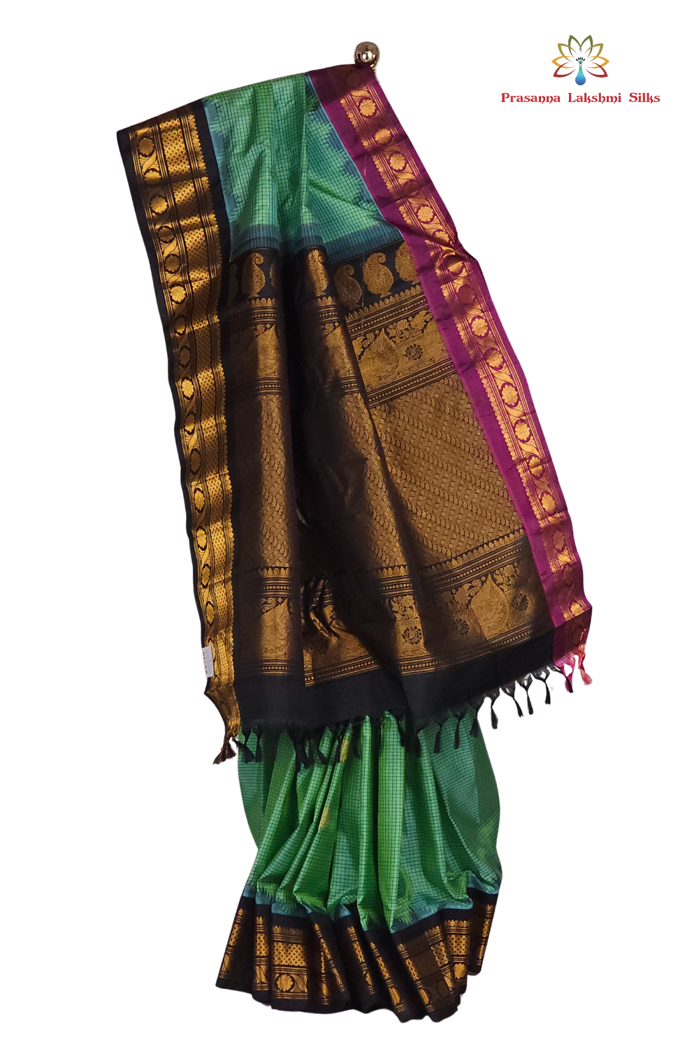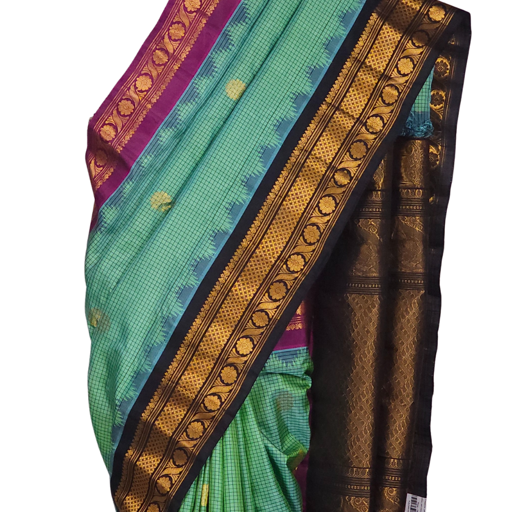 Elevate your elegance with our exquisite Handloom Gadwal Pure Silk Saree, adorned with classic checks pattern creating a timeless and elegant look with zari-woven borders and Rich zari-woven brocade that adorns the pallu, making every drape a statement.