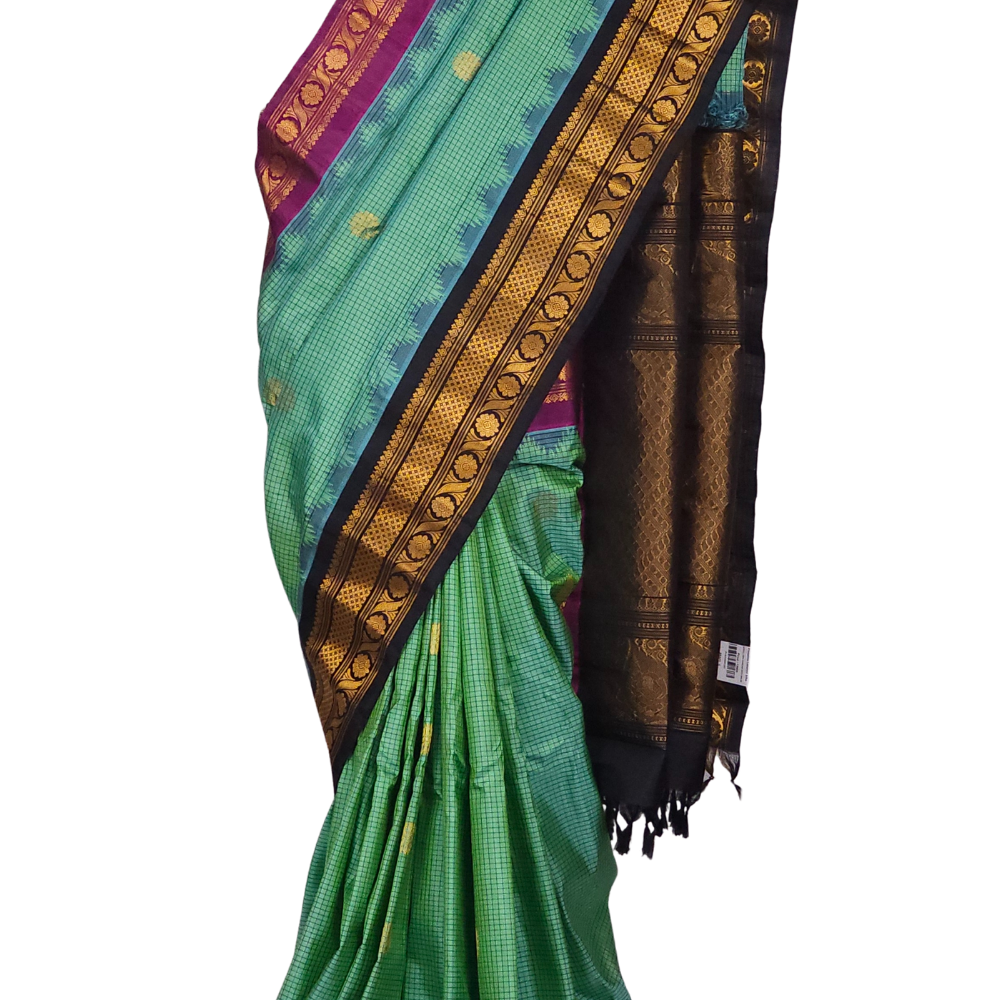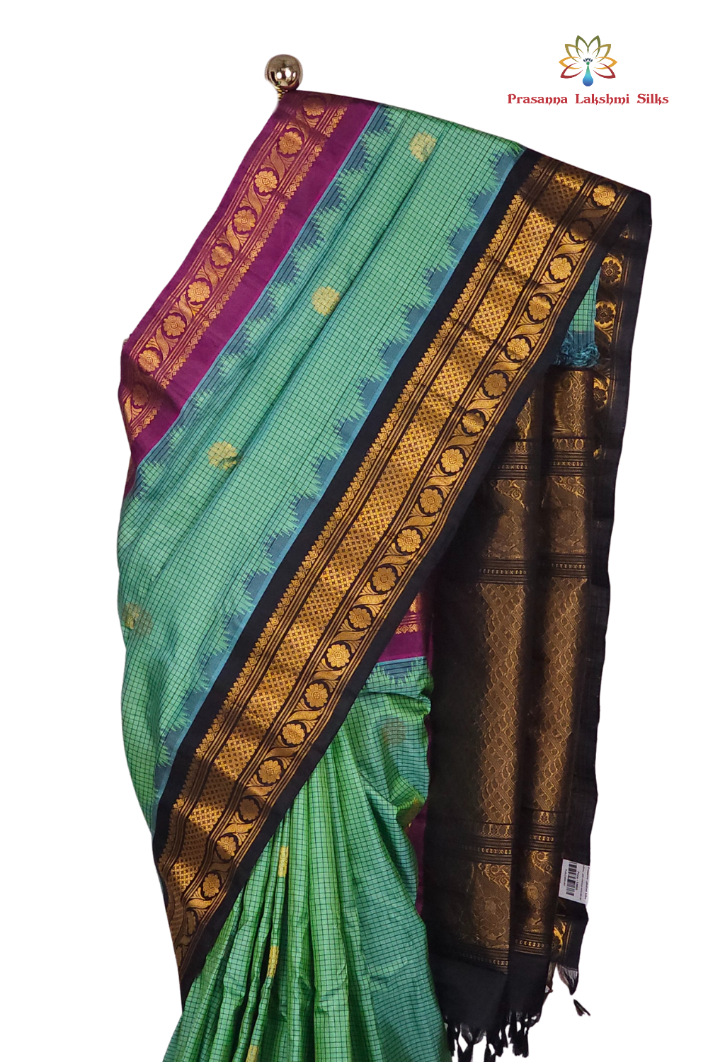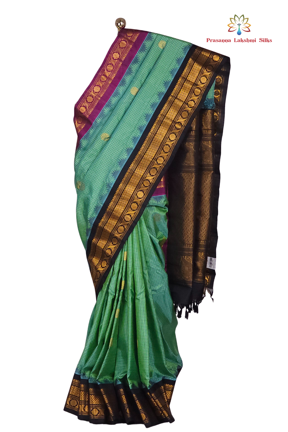 Elevate your elegance with our exquisite Handloom Gadwal Pure Silk Saree, adorned with classic checks pattern creating a timeless and elegant look with zari-woven borders and Rich zari-woven brocade that adorns the pallu, making every drape a statement.