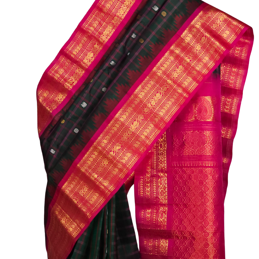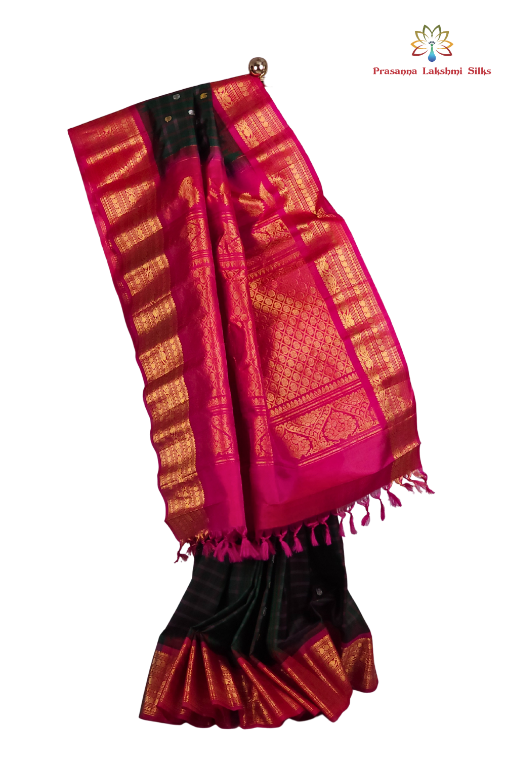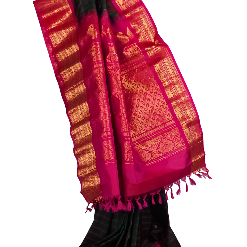 Elevate your elegance with our exquisite Handloom Gadwal Pure Silk Saree, adorned with classic checks pattern creating a timeless and elegant look with zari-woven borders and Rich zari-woven brocade that adorns the pallu, making every drape a statement.