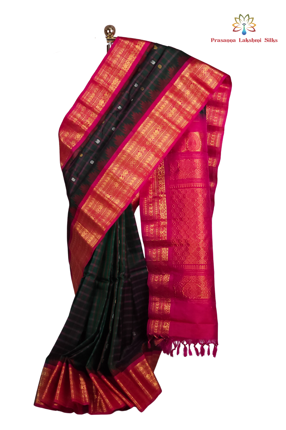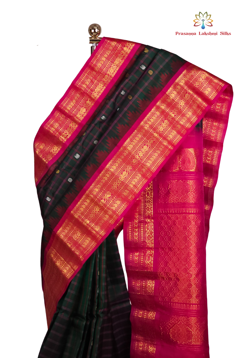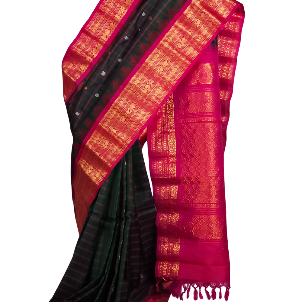 Elevate your elegance with our exquisite Handloom Gadwal Pure Silk Saree, adorned with classic checks pattern creating a timeless and elegant look with zari-woven borders and Rich zari-woven brocade that adorns the pallu, making every drape a statement.