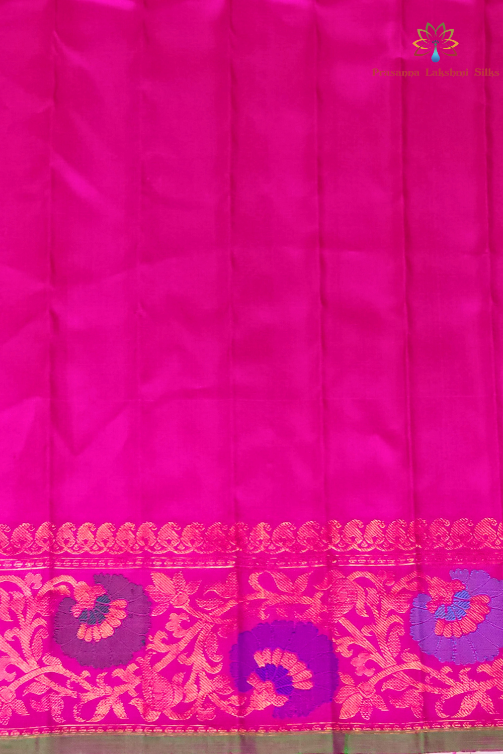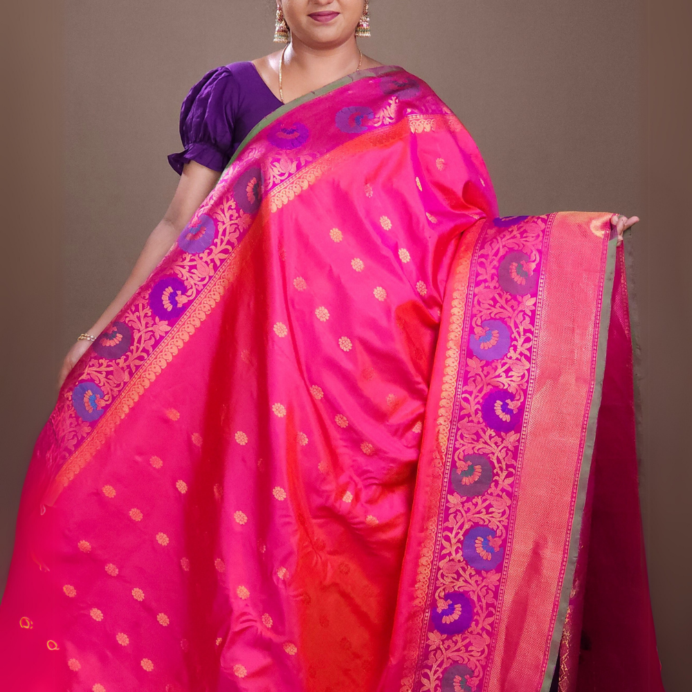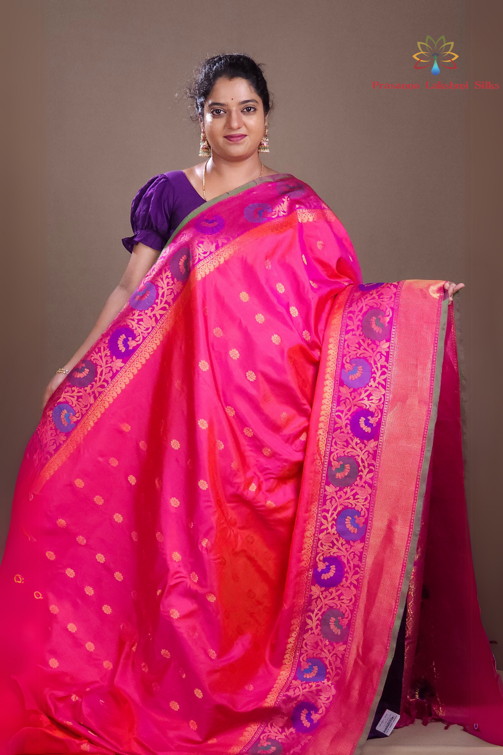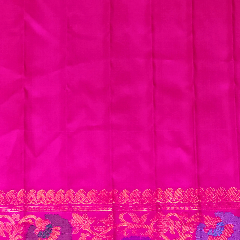Experience the rich heritage of tradition with this exquisite Pure Handloom Gadwal Silk Saree.All-over zari motifs with intricate meenakaari turning border rich zari brocade pallu. This masterpiece weaves together elegance and sophistication, perfect for special occasions.