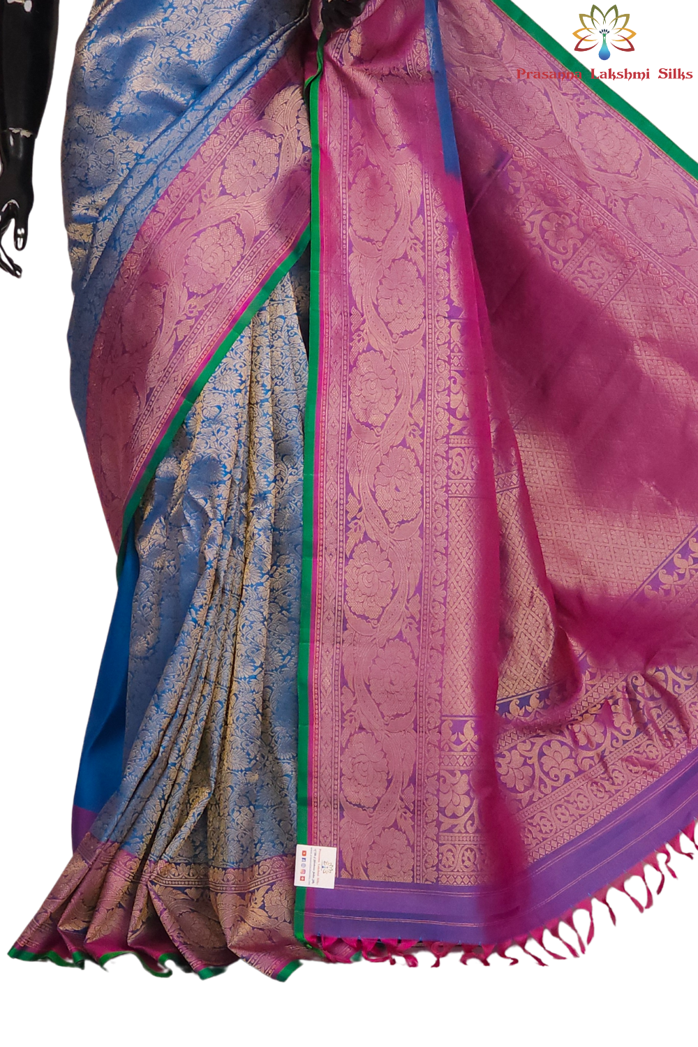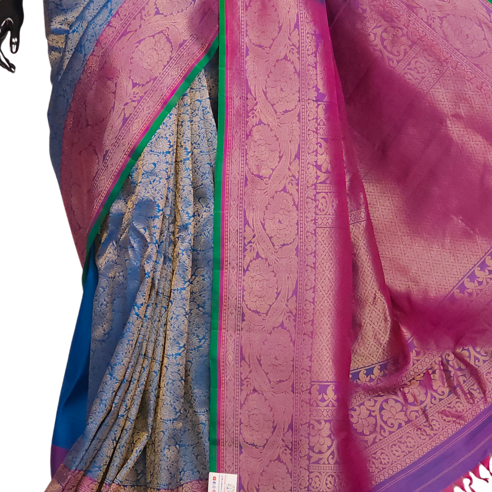 Experience the epitome of Telugu tradition with this exquisite Pure Handloom Gadwal Silk Saree.All-over intricate zari brocade design with turning borders Rich pallu adorned with intricate zari work. This masterpiece weaves together elegance and royalty, perfect for special occasions.