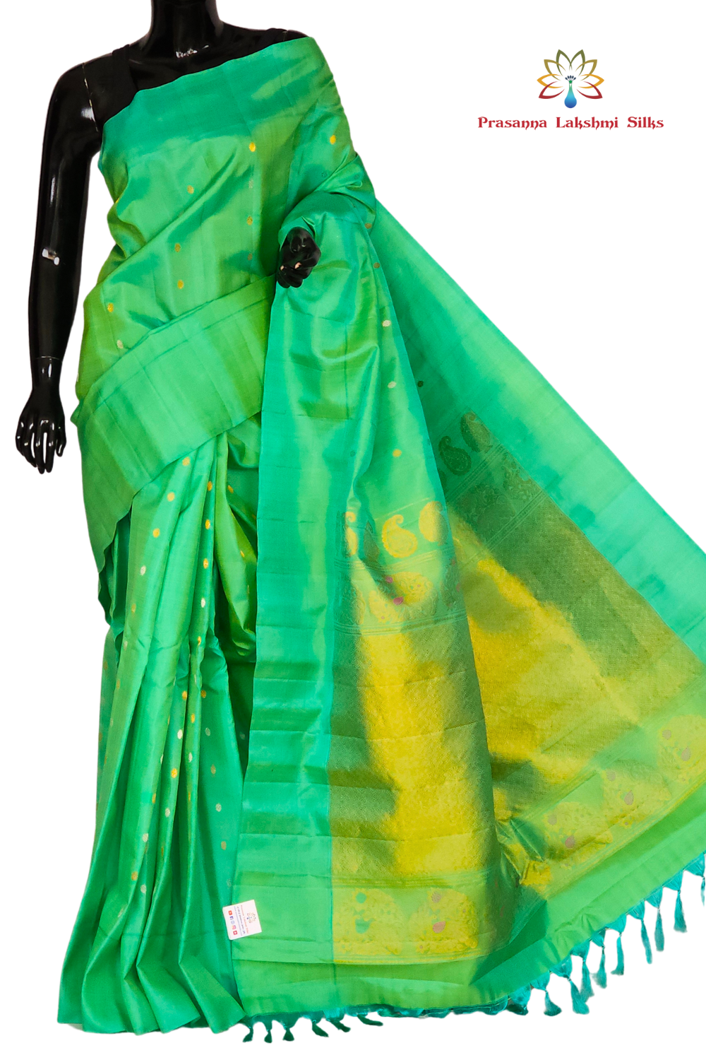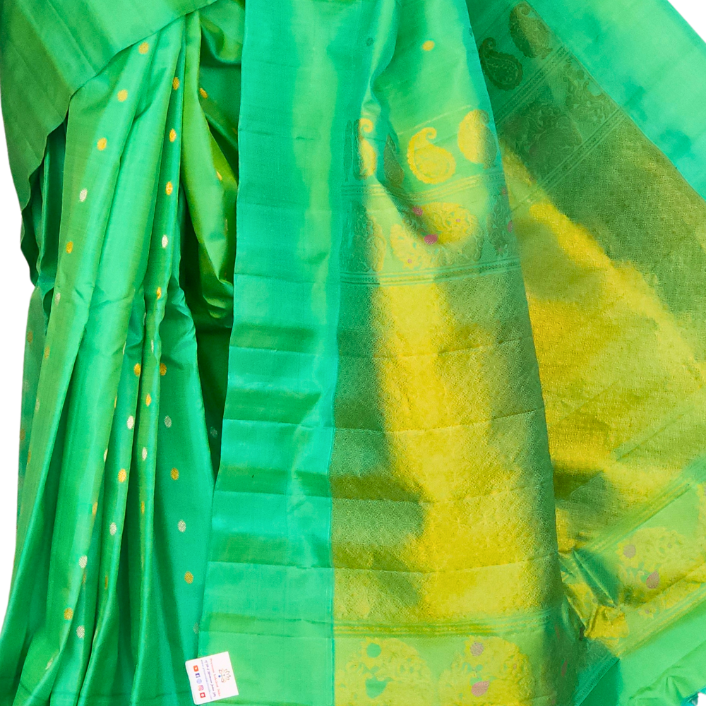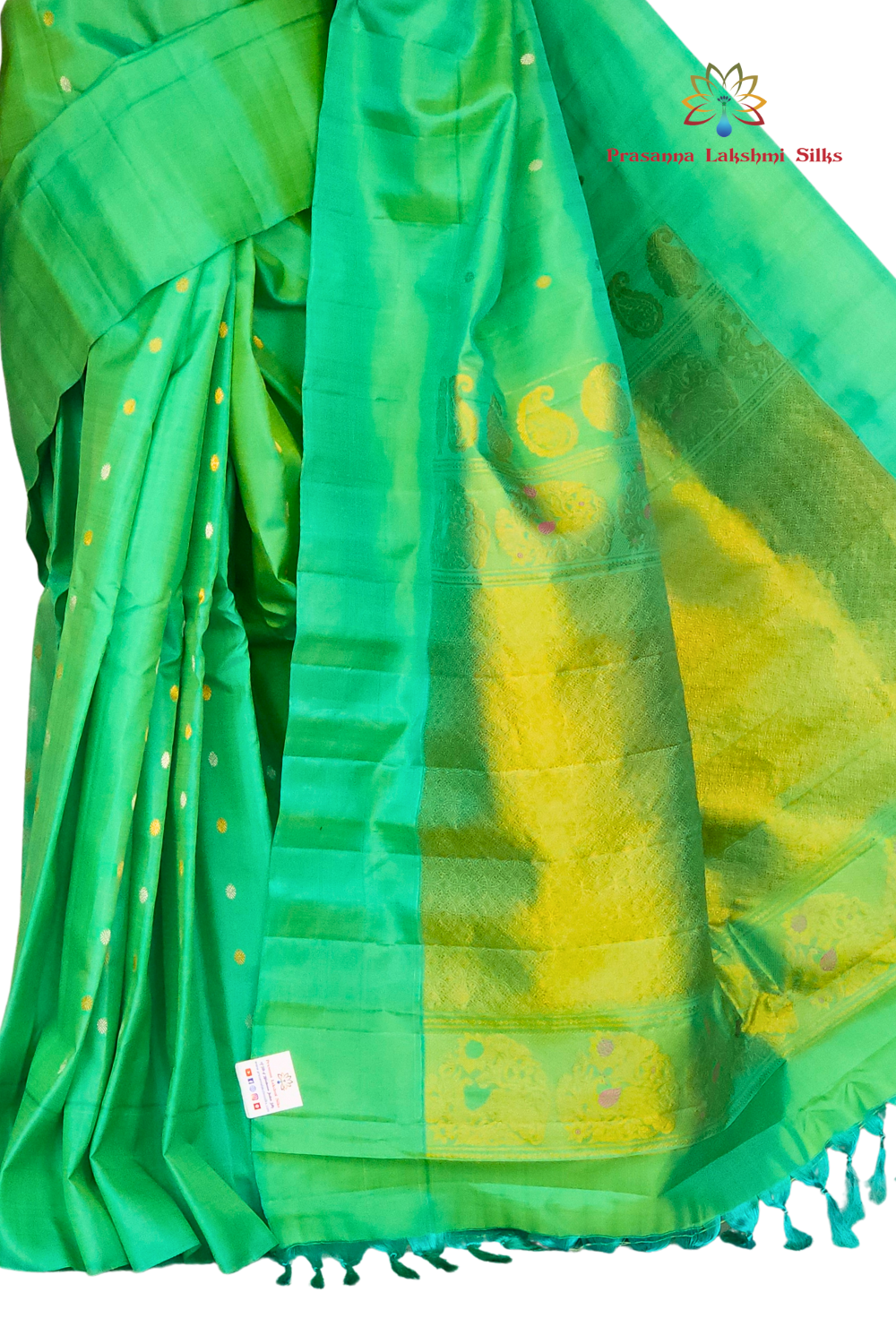 Experience the elegance of our Gadwal silk saree, with gold and silver zariwoven motifs , luxurious brocade pallu paired with running blouse.....