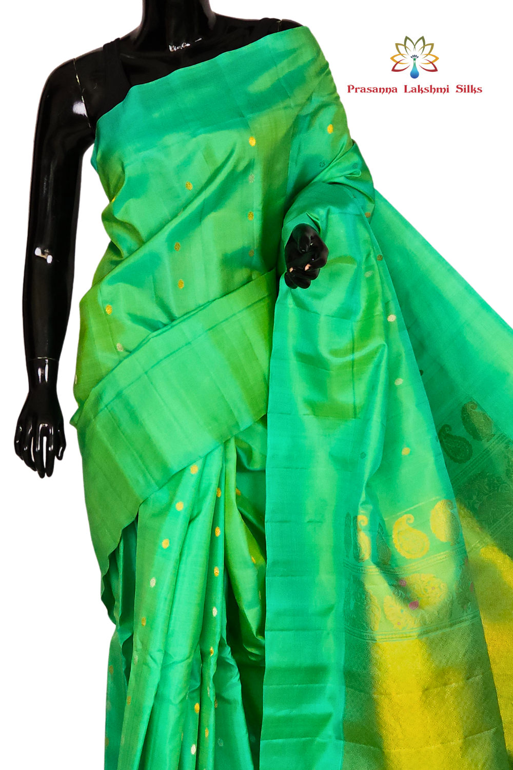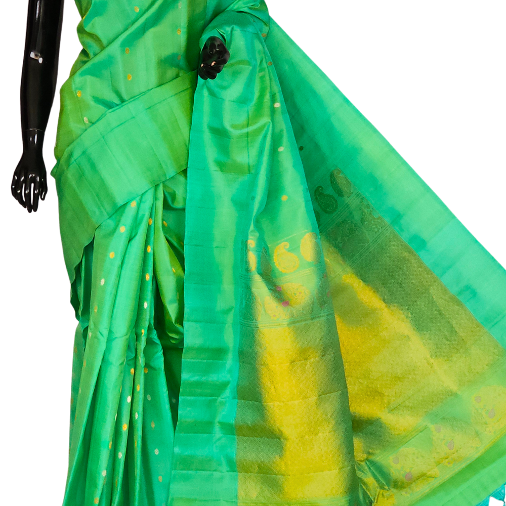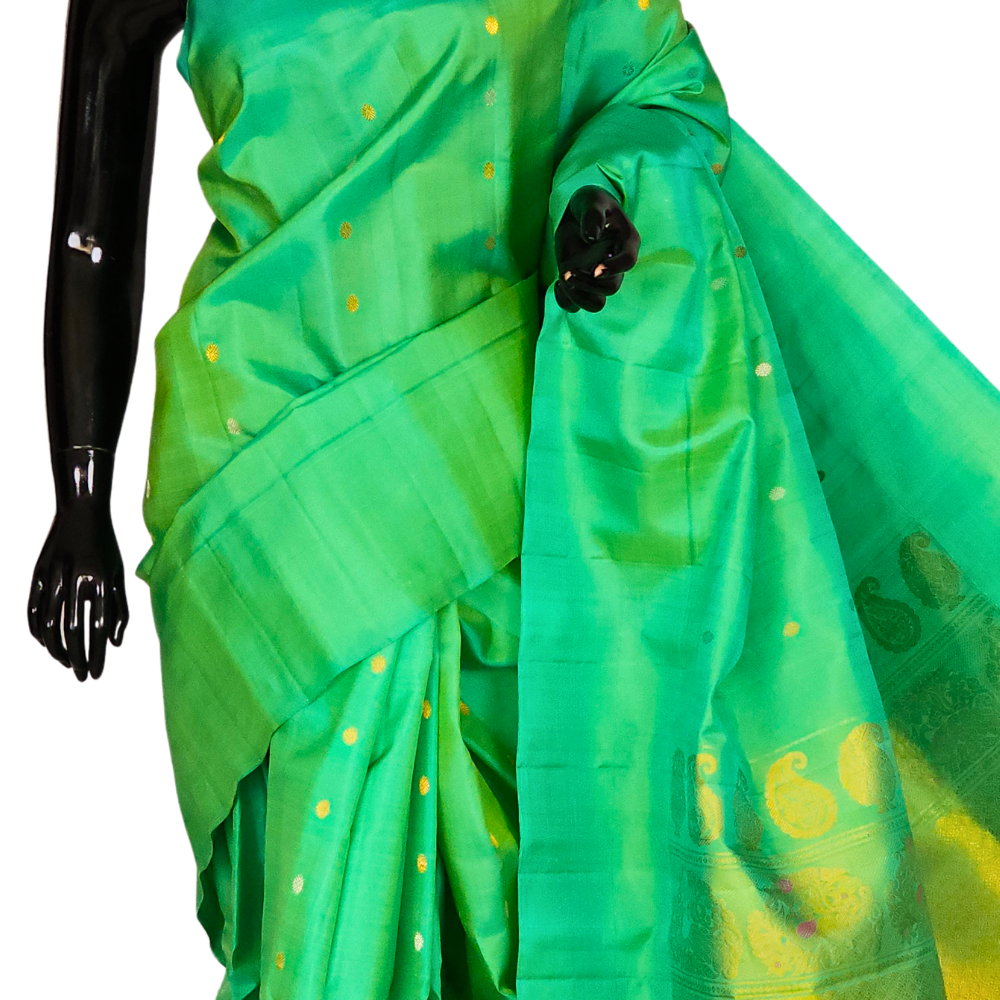 Experience the elegance of our Gadwal silk saree, with gold and silver zariwoven motifs , luxurious brocade pallu paired with running blouse.....