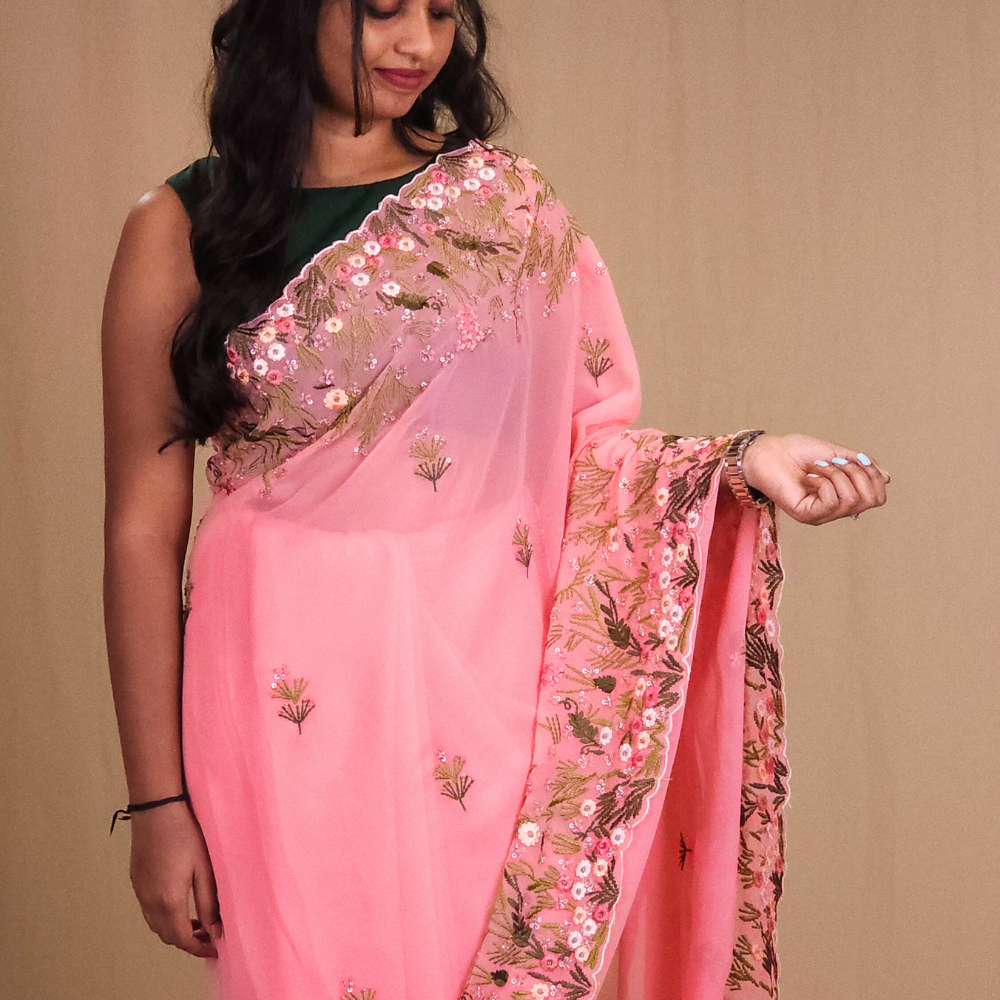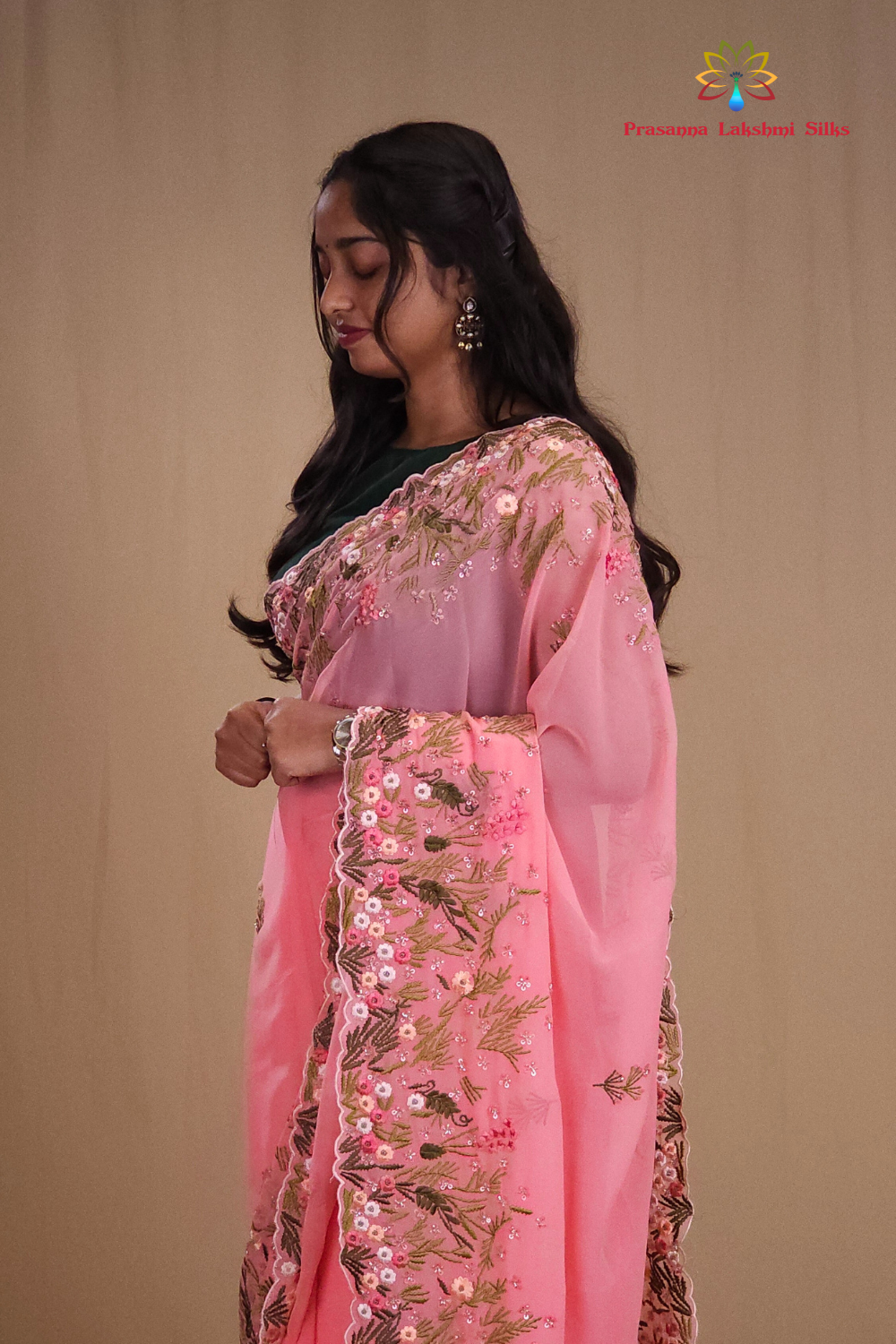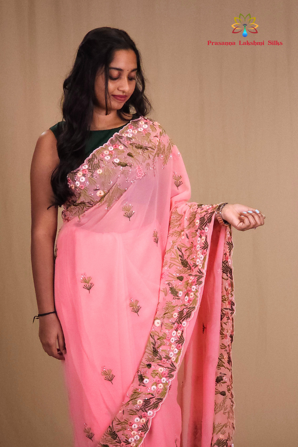 Elevate your style with our Georgette saree allover floral bunches with sequence touch beautiful floral thread embroidery borders with scallop .pallu and paired with designer blouse