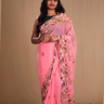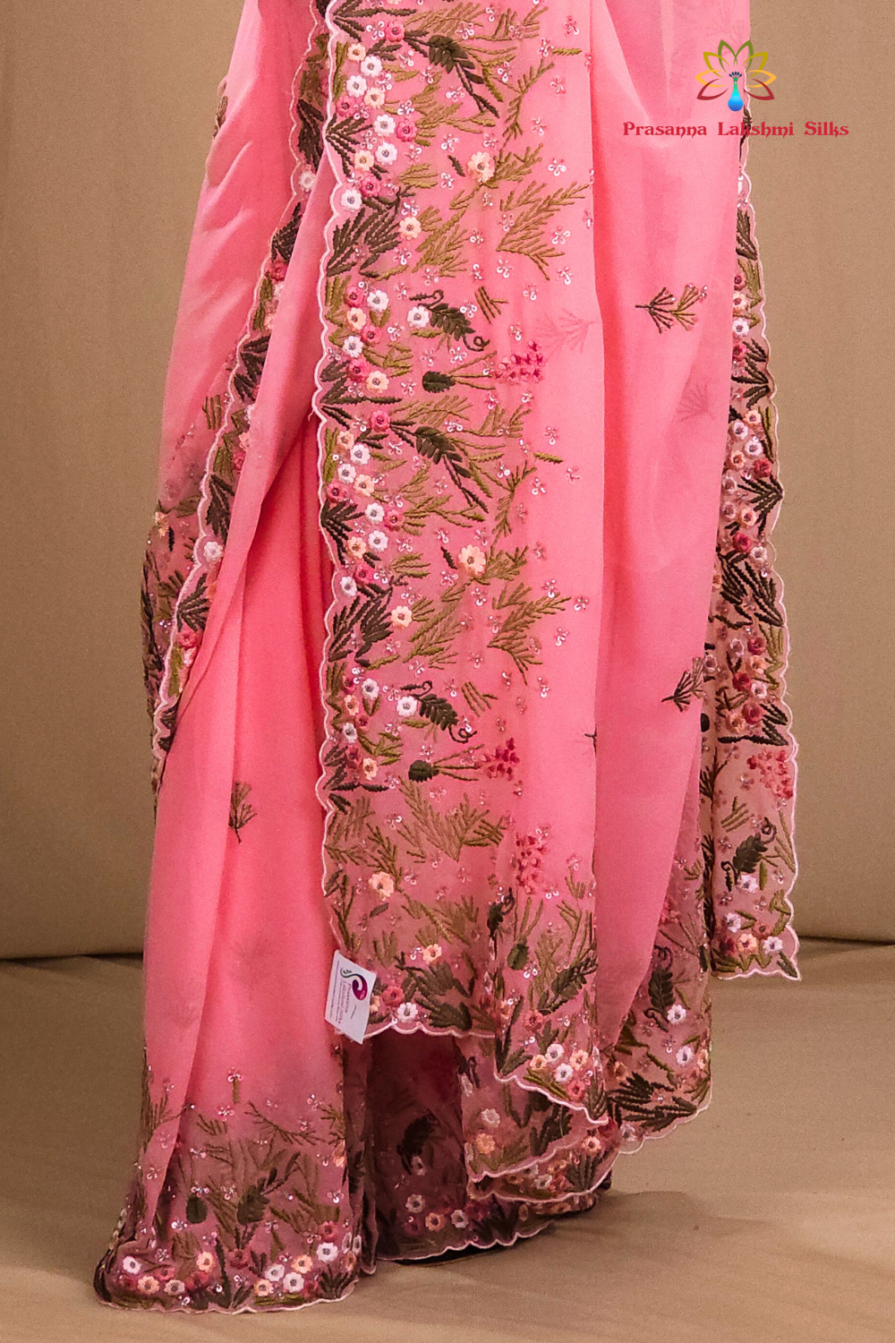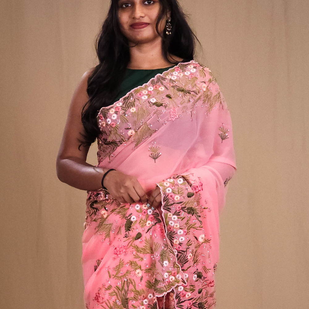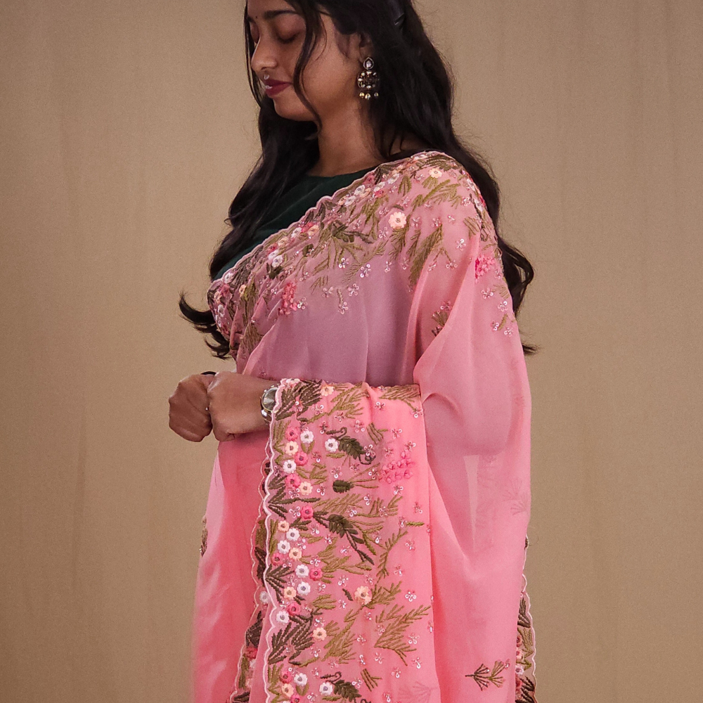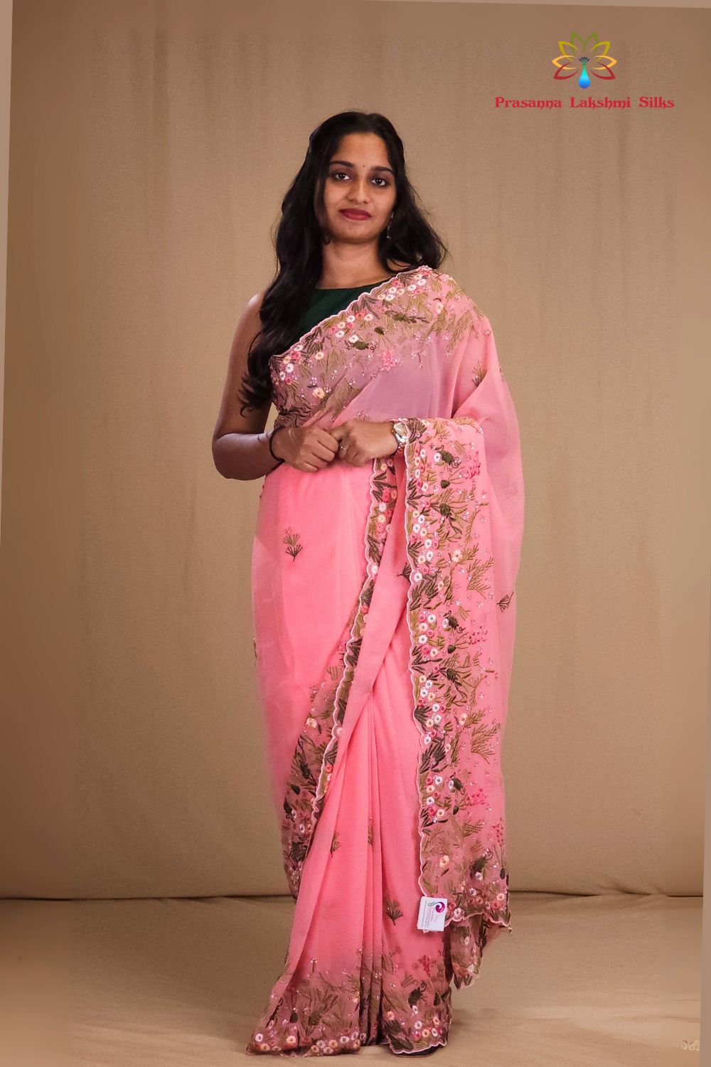 Elevate your style with our Georgette saree allover floral bunches with sequence touch beautiful floral thread embroidery borders with scallop .pallu and paired with designer blouse