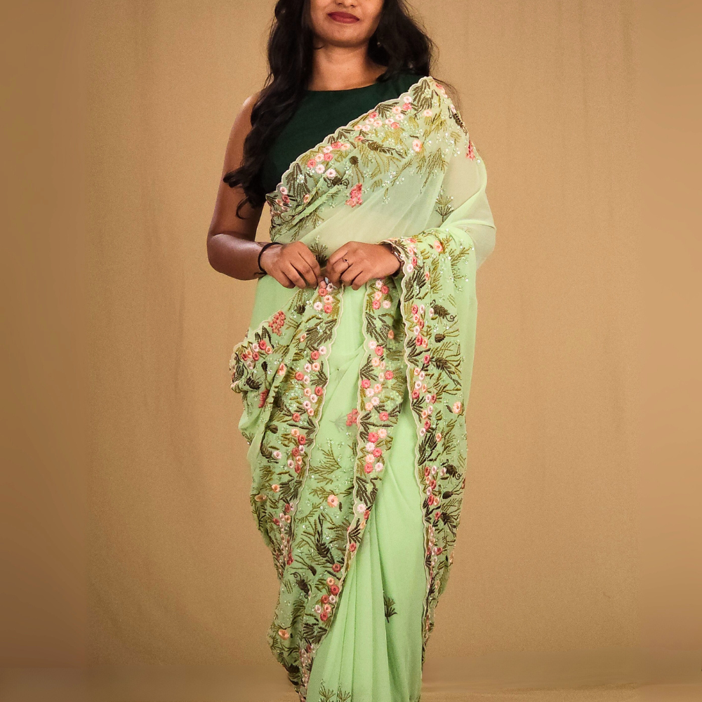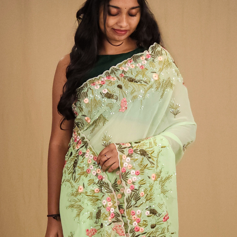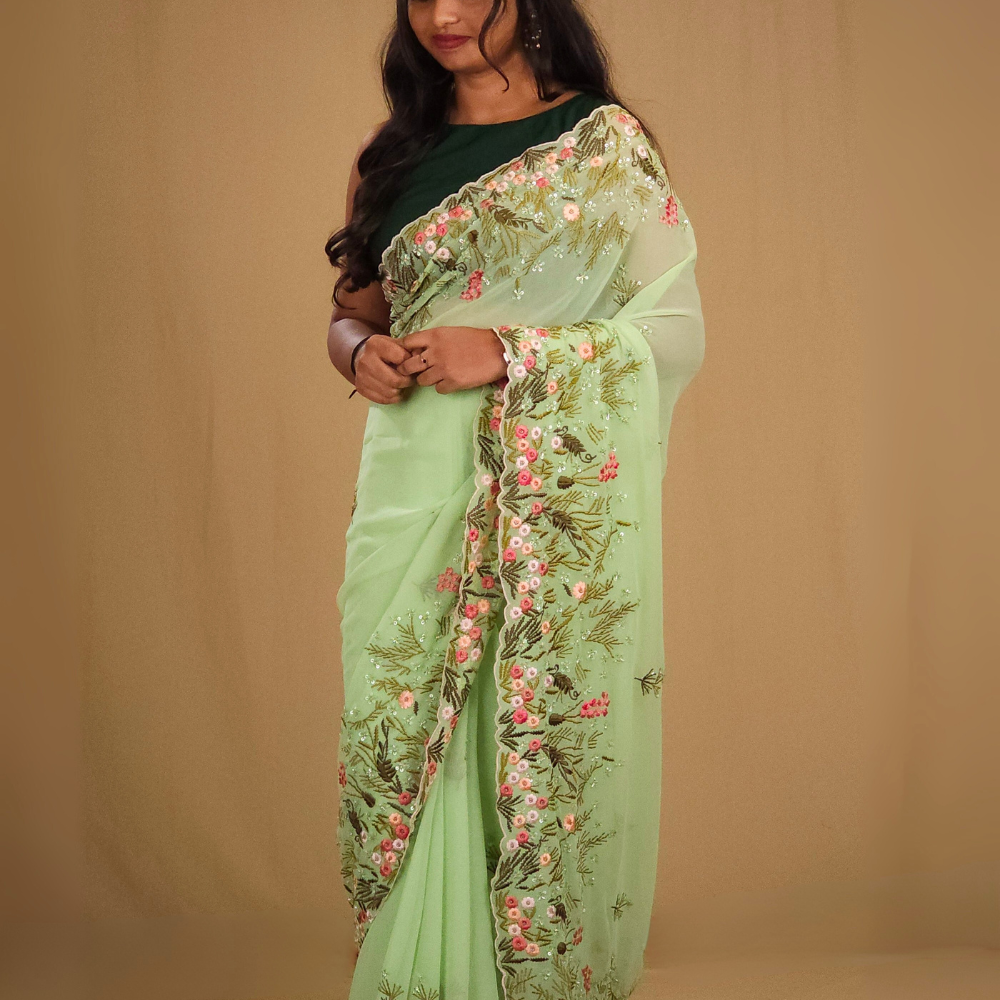 Elevate your style with our Georgette saree allover floral bunches with sequence touch beautiful floral thread embroidery borders with scallop .pallu and paired with designer blouse