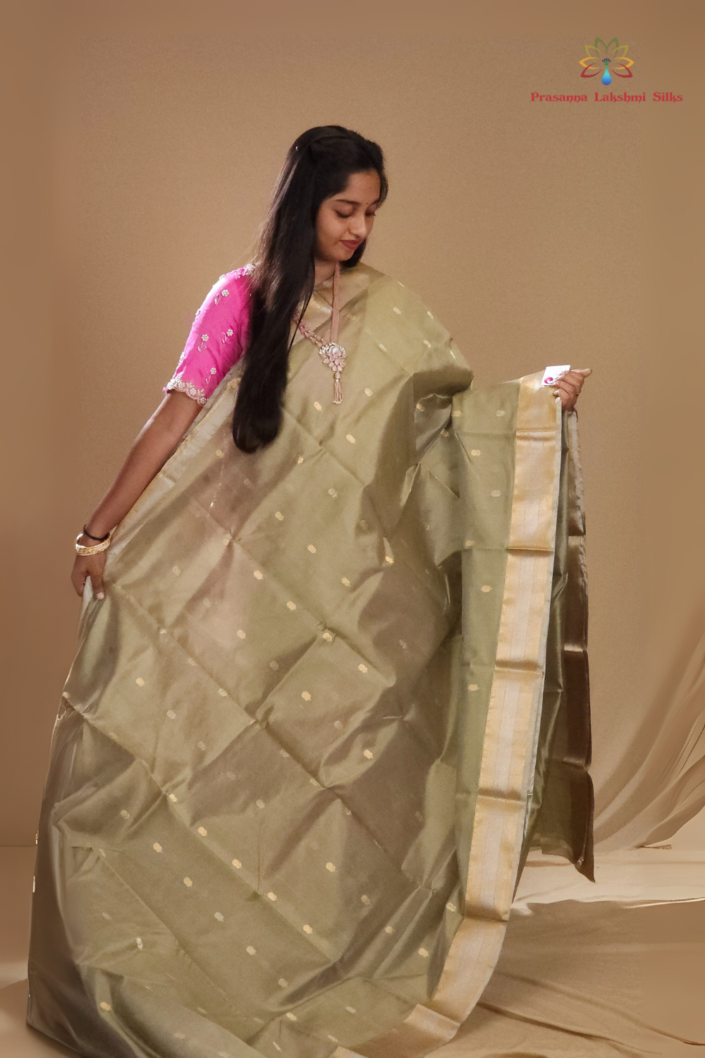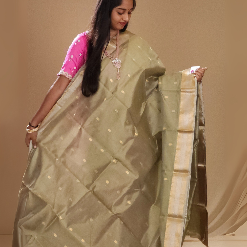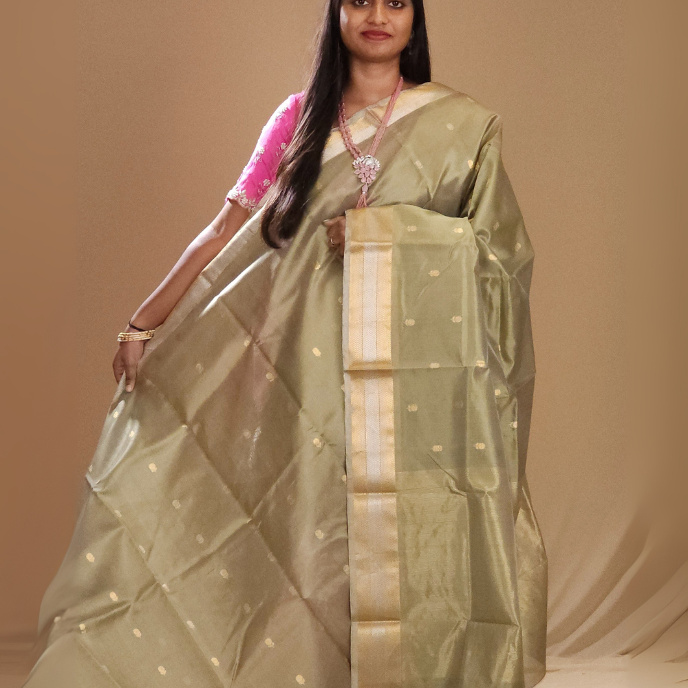 Elevate your ethnic wardrobe with our exquisite Chanderi Silk Sarees featuring allover zari-woven motifs adorned with elegant zari khaddi borders and a rich brocade pallu that adds a regal touch. Paired with a running blouse, this saree beautifully blends grace and tradition....