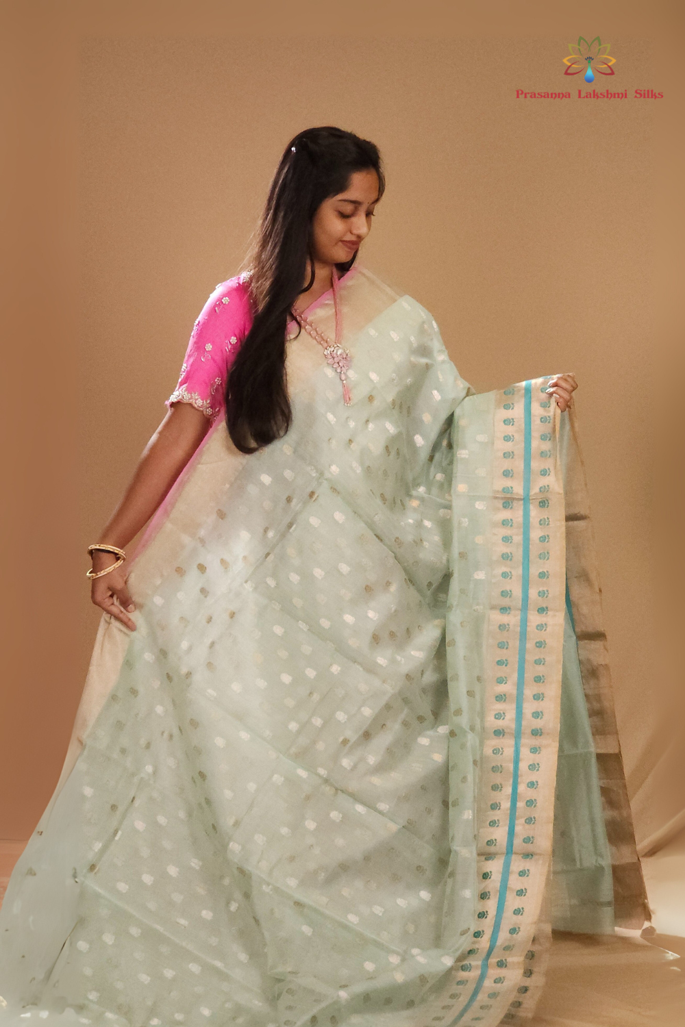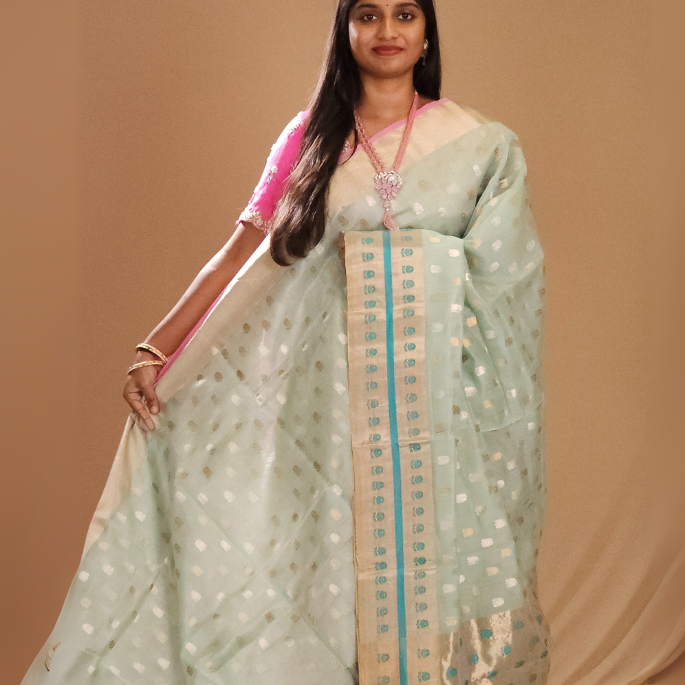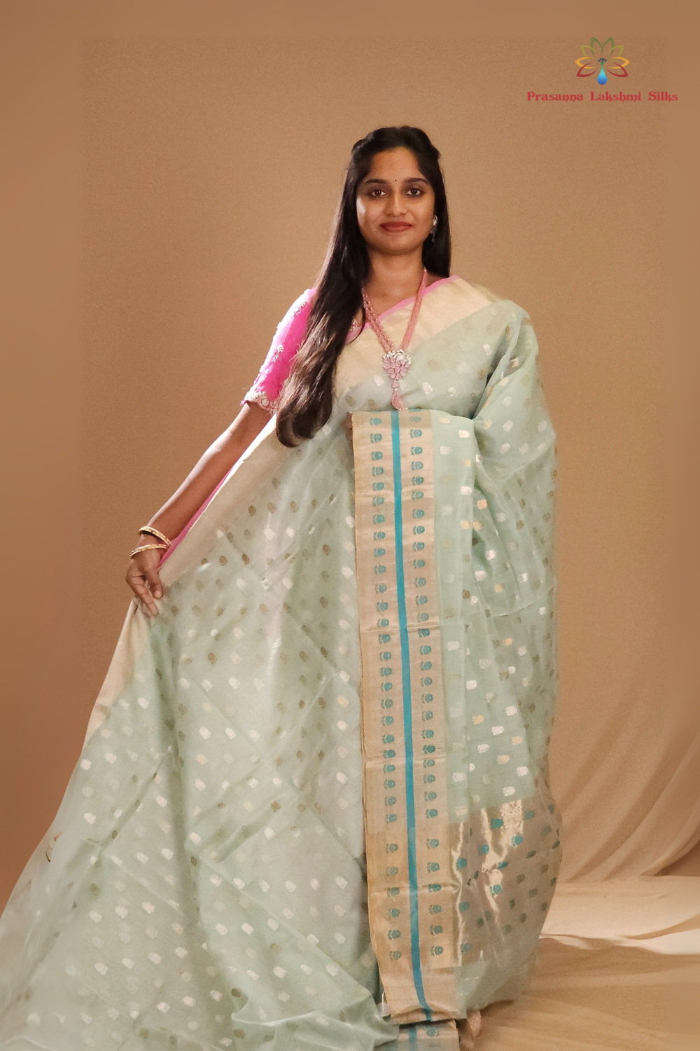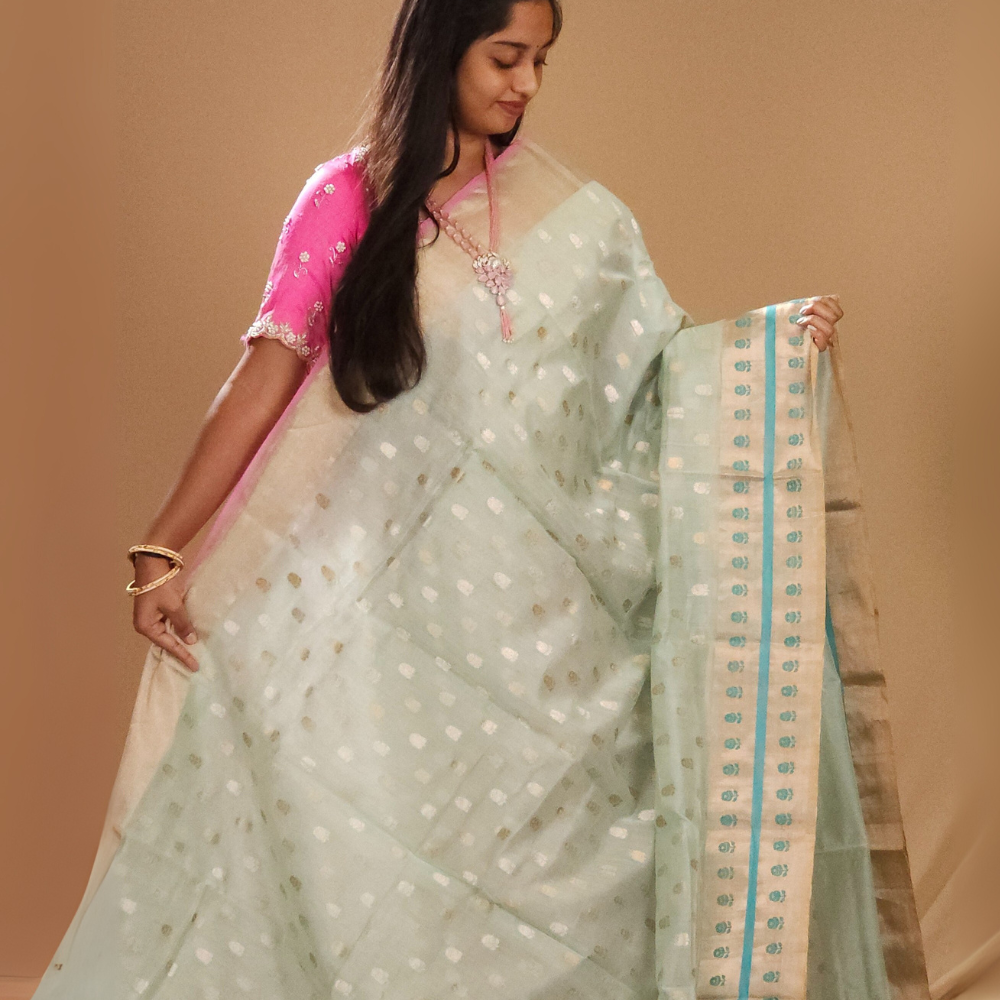 Elevate your ethnic wardrobe with our exquisite Chanderi Silk Sarees featuring allover zari-woven motifs, adorned with elegant zari khaddi borders and a rich brocade pallu that adds a regal touch. Paired with a running blouse, this saree beautifully blends grace and tradition....