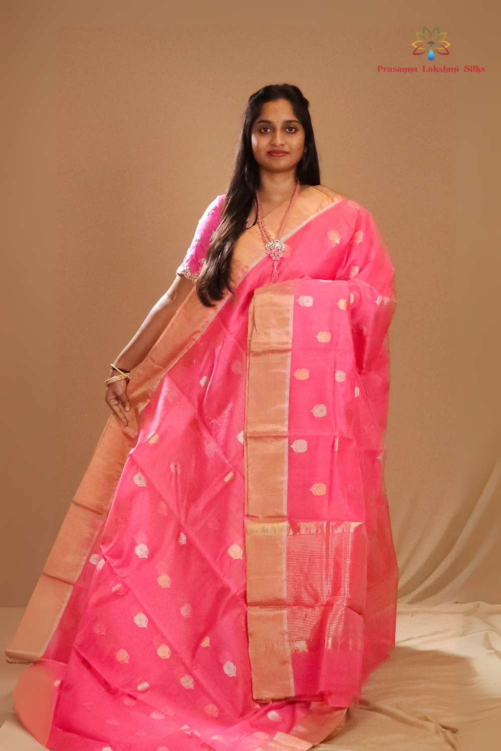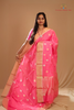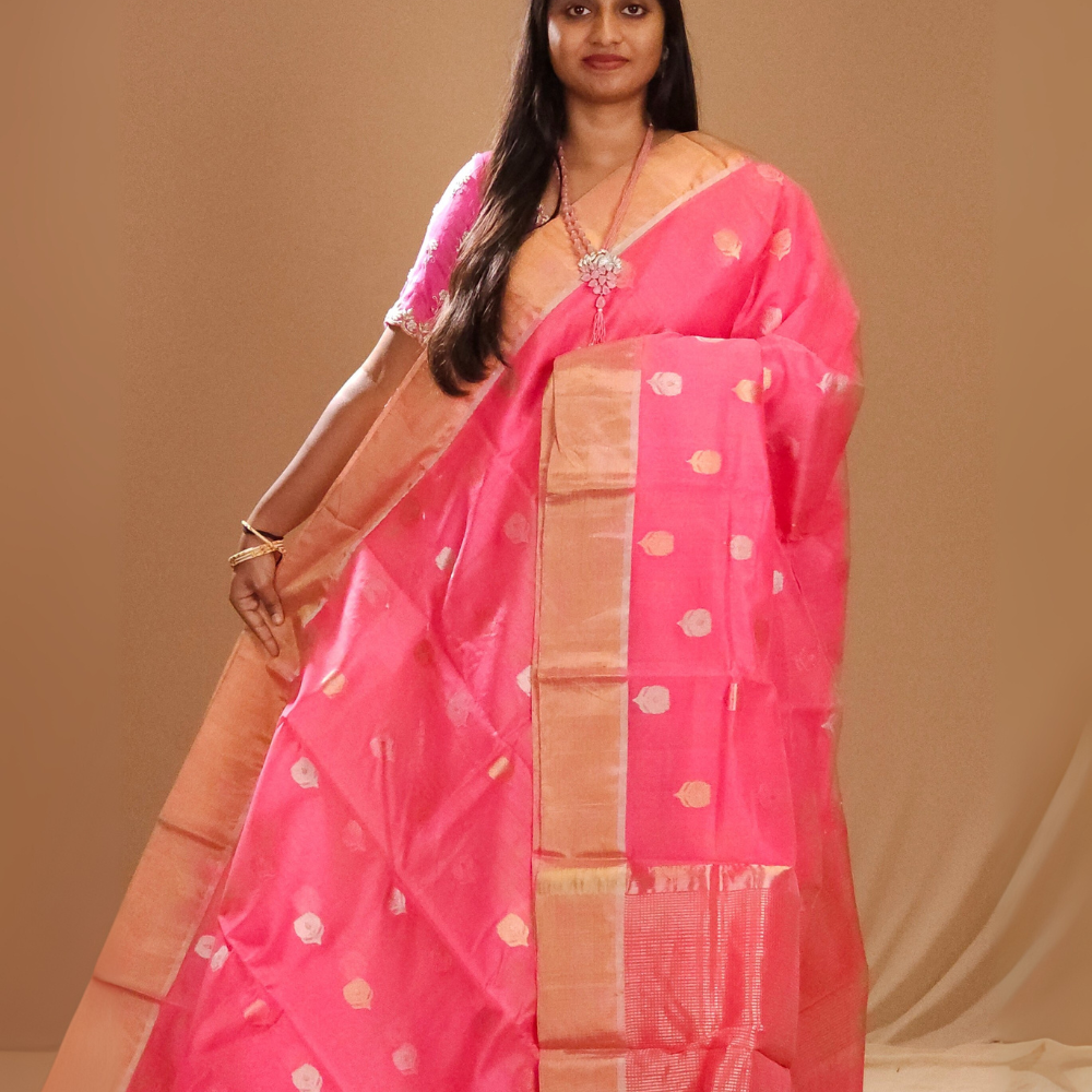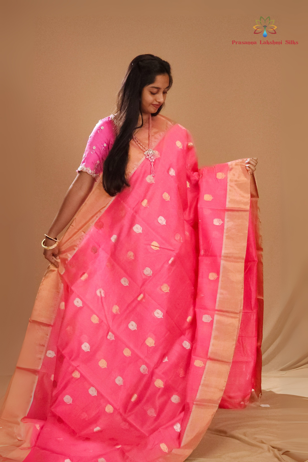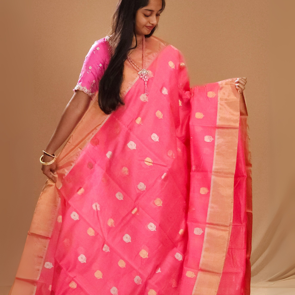 Elevate your ethnic wardrobe with our exquisite Chanderi Silk Sarees featuring allover zari-woven motifs, adorned with elegant zari khaddi borders and a rich brocade pallu that adds a regal touch. Paired with a running blouse, this saree beautifully blends grace and tradition....